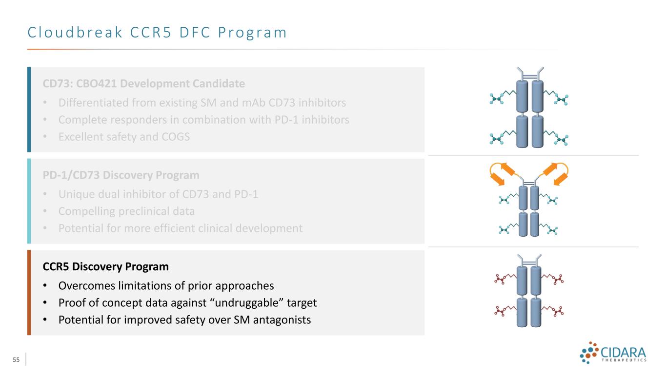 55 C l o u d b re a k C C R 5 D F C P ro g ra m CD73: CBO421 Development Candidate • Differentiated from existing SM and mAb CD73 inhibitors • Complete responders in combination with PD-1 inhibitors • Excellent safety and COGS PD-1/CD73 Discovery Program • Unique dual inhibitor of CD73 and PD-1 • Compelling preclinical data • Potential for more efficient clinical development CCR5 Discovery Program • Overcomes limitations of prior approaches • Proof of concept data against “undruggable” target • Potential for improved safety over SM antagonists
