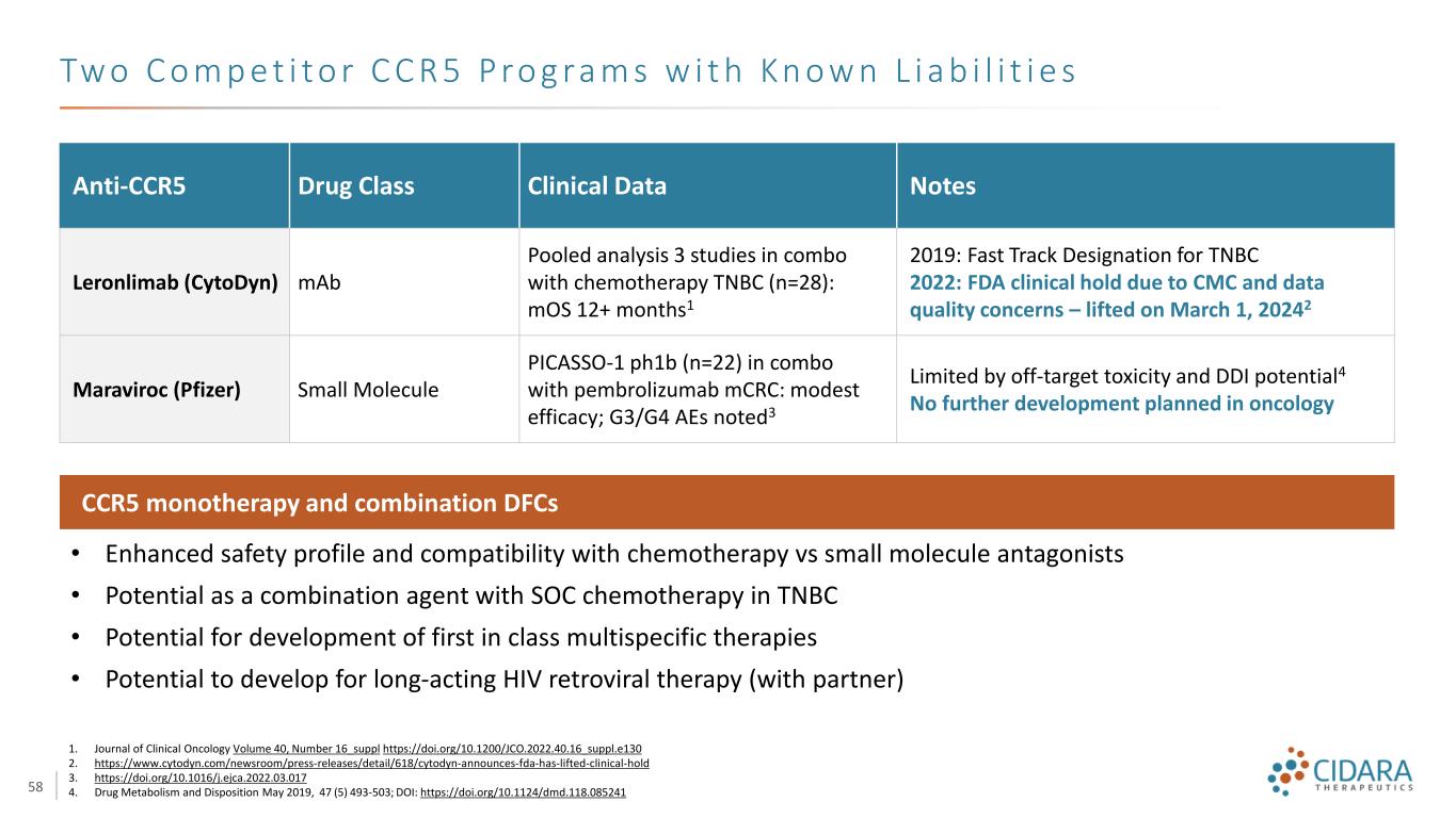 58 • Enhanced safety profile and compatibility with chemotherapy vs small molecule antagonists • Potential as a combination agent with SOC chemotherapy in TNBC • Potential for development of first in class multispecific therapies • Potential to develop for long-acting HIV retroviral therapy (with partner) Tw o C o m p e t i t o r C C R 5 P ro g ra m s w i t h Kn o w n L i a b i l i t i e s 1. Journal of Clinical Oncology Volume 40, Number 16_suppl https://doi.org/10.1200/JCO.2022.40.16_suppl.e130 2. https://www.cytodyn.com/newsroom/press-releases/detail/618/cytodyn-announces-fda-has-lifted-clinical-hold 3. https://doi.org/10.1016/j.ejca.2022.03.017 4. Drug Metabolism and Disposition May 2019, 47 (5) 493-503; DOI: https://doi.org/10.1124/dmd.118.085241 Anti-CCR5 Drug Class Clinical Data Notes Leronlimab (CytoDyn) mAb Pooled analysis 3 studies in combo with chemotherapy TNBC (n=28): mOS 12+ months1 2019: Fast Track Designation for TNBC 2022: FDA clinical hold due to CMC and data quality concerns – lifted on March 1, 20242 Maraviroc (Pfizer) Small Molecule PICASSO-1 ph1b (n=22) in combo with pembrolizumab mCRC: modest efficacy; G3/G4 AEs noted3 Limited by off-target toxicity and DDI potential4 No further development planned in oncology CCR5 monotherapy and combination DFCs