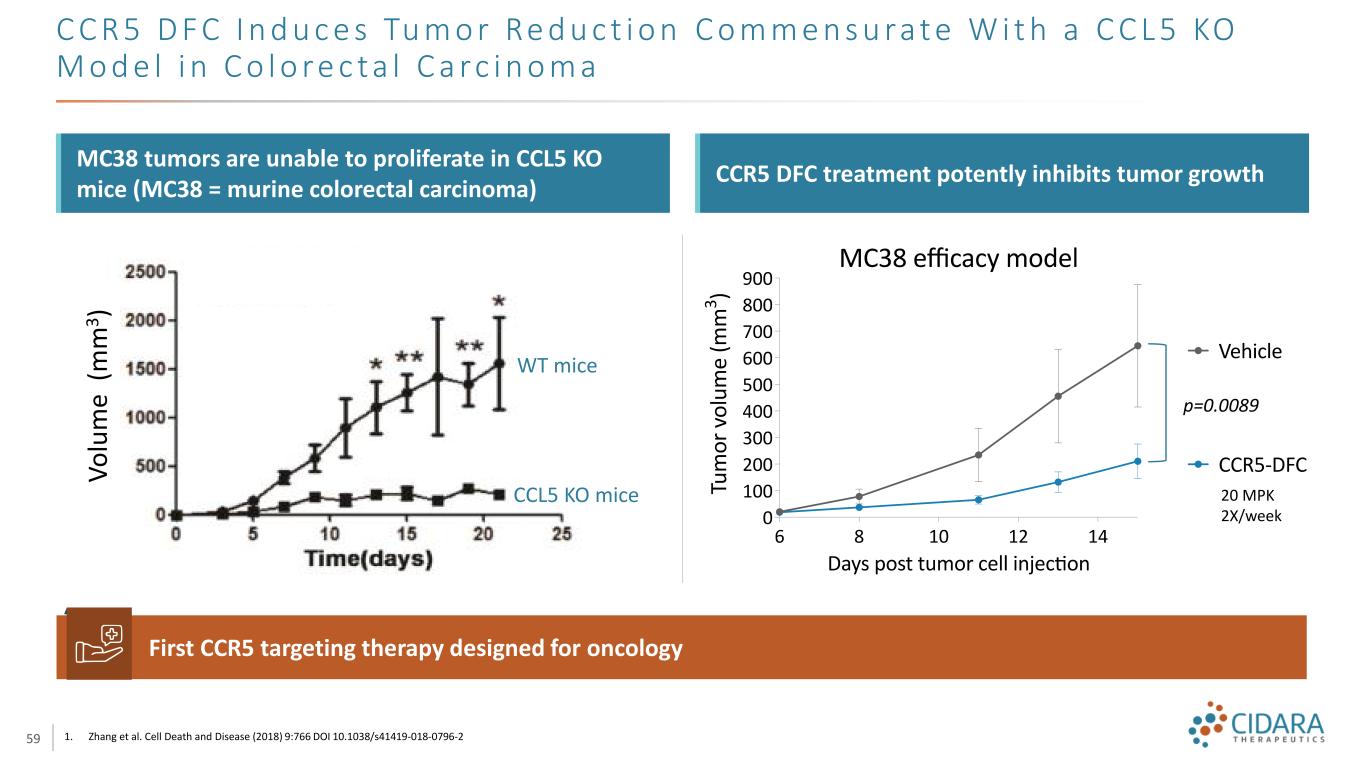 59 First CCR5 targeting therapy designed for oncology V o lu m e ( m m 3 ) WT mice CCL5 KO mice C C R 5 D F C I n d u c e s Tu m o r Re d u c t i o n C o m m e n s u rat e W i t h a C C L 5 KO M o d e l i n C o l o re c ta l C a rc i n o m a p=0.0089 20 MPK 2X/week 1. Zhang et al. Cell Death and Disease (2018) 9:766 DOI 10.1038/s41419-018-0796-2 CCR5 DFC treatment potently inhibits tumor growth MC38 tumors are unable to proliferate in CCL5 KO mice (MC38 = murine colorectal carcinoma)