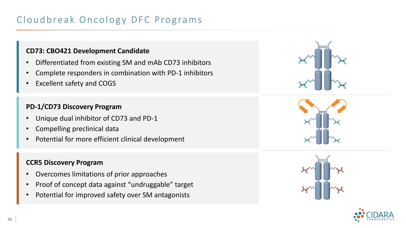 60 C l o u d b re a k O n c o l o g y D F C P ro g ra m s CD73: CBO421 Development Candidate • Differentiated from existing SM and mAb CD73 inhibitors • Complete responders in combination with PD-1 inhibitors • Excellent safety and COGS PD-1/CD73 Discovery Program • Unique dual inhibitor of CD73 and PD-1 • Compelling preclinical data • Potential for more efficient clinical development CCR5 Discovery Program • Overcomes limitations of prior approaches • Proof of concept data against “undruggable” target • Potential for improved safety over SM antagonists