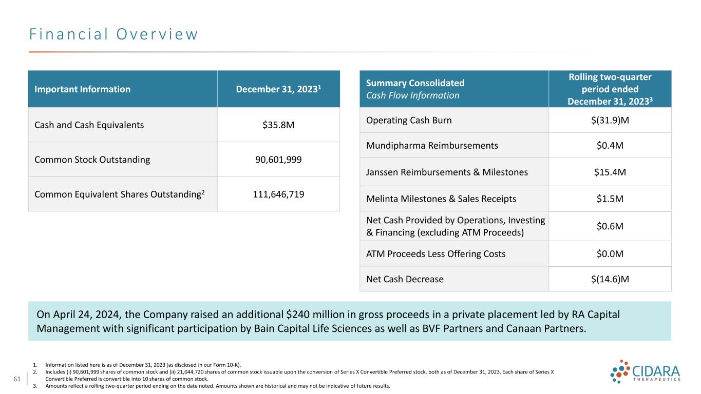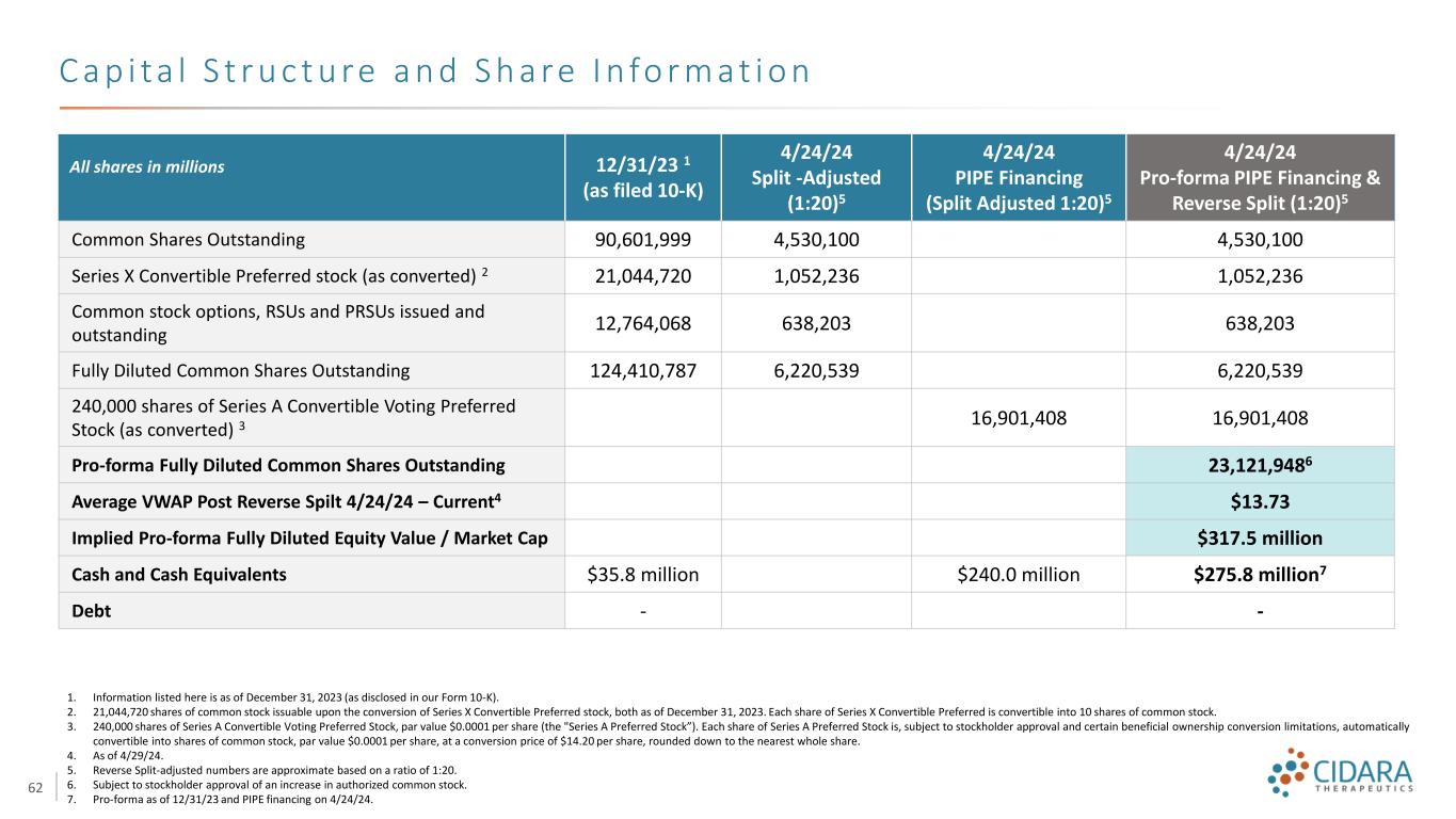 61 On April 24, 2024, the Company raised an additional $240 million in gross proceeds in a private placement led by RA Capital Management with significant participation by Bain Capital Life Sciences as well as BVF Partners and Canaan Partners. Important Information December 31, 20231 Cash and Cash Equivalents $35.8M Common Stock Outstanding 90,601,999 Common Equivalent Shares Outstanding2 111,646,719 F i n a n c i a l O v e r v i e w 1. Information listed here is as of December 31, 2023 (as disclosed in our Form 10-K). 2. Includes (i) 90,601,999 shares of common stock and (ii) 21,044,720 shares of common stock issuable upon the conversion of Series X Convertible Preferred stock, both as of December 31, 2023. Each share of Series X Convertible Preferred is convertible into 10 shares of common stock. 3. Amounts reflect a rolling two-quarter period ending on the date noted. Amounts shown are historical and may not be indicative of future results. Summary Consolidated Cash Flow Information Rolling two-quarter period ended December 31, 20233 Operating Cash Burn $(31.9)M Mundipharma Reimbursements $0.4M Janssen Reimbursements & Milestones $15.4M Melinta Milestones & Sales Receipts $1.5M Net Cash Provided by Operations, Investing & Financing (excluding ATM Proceeds) $0.6M ATM Proceeds Less Offering Costs $0.0M Net Cash Decrease $(14.6)M