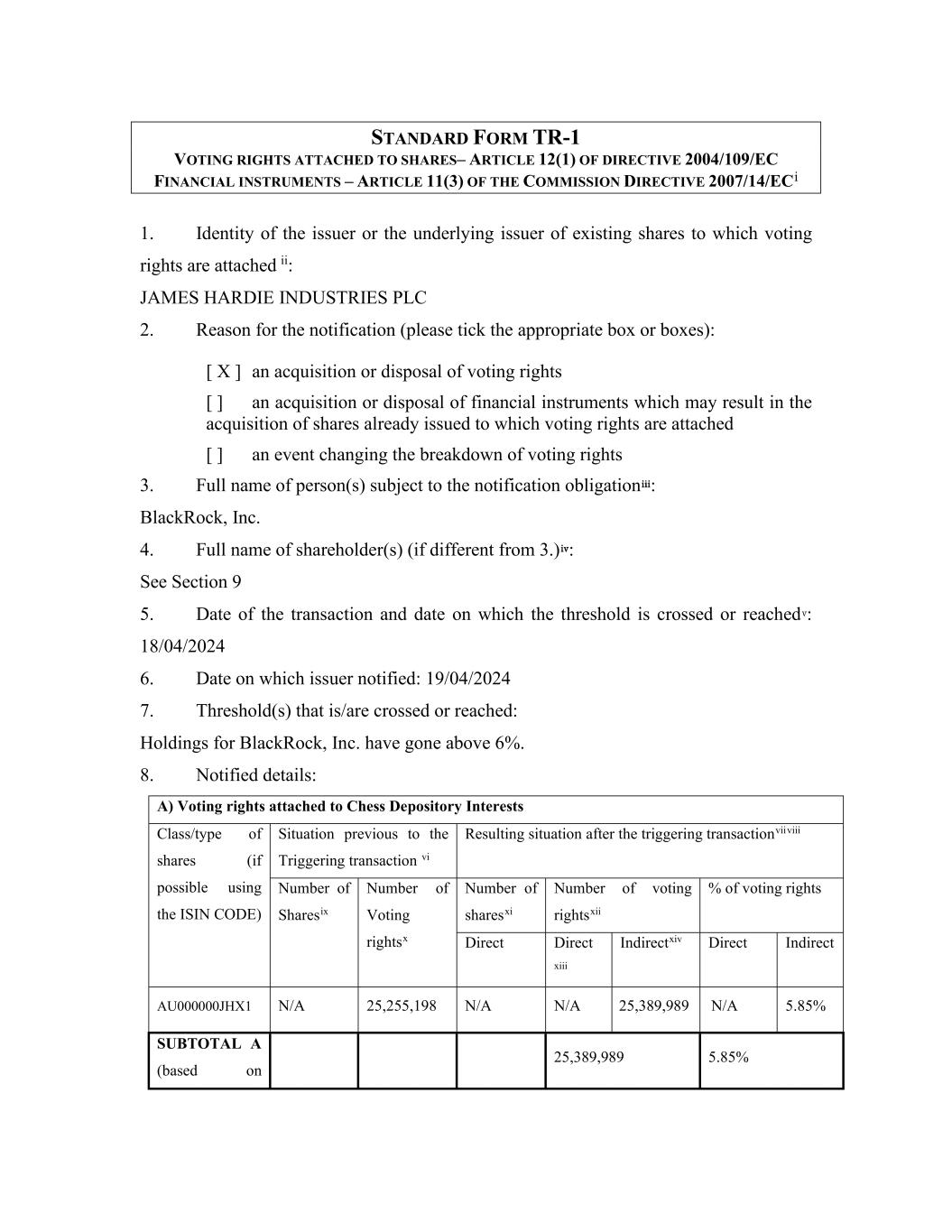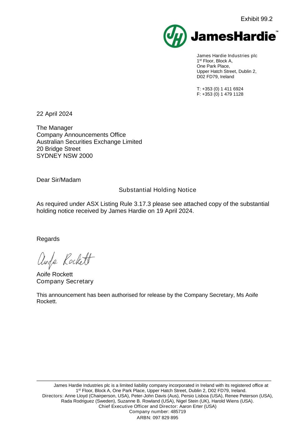 Forward-looking statements are based on the Company’s current expectations, estimates and assumptions and because forward-looking statements address future results, events and conditions, they, by their very nature, involve inherent risks and uncertainties, many of which are unforeseeable and beyond the Company’s control. Such known and unknown risks, uncertainties and other factors may cause actual results, performance or other achievements to differ materially from the anticipated results, performance or achievements expressed, projected or implied by these forward-looking statements. These factors, some of which are discussed under “Risk Factors” in Section 3 of the Form 20-F filed with the Securities and Exchange Commission on 16 May 2023, include, but are not limited to: all matters relating to or arising out of the prior manufacture of products that contained asbestos by current and former Company subsidiaries; required contributions to AICF, any shortfall in AICF funding and the effect of currency exchange rate movements on the amount recorded in the Company’s financial statements as an asbestos liability; compliance with and changes in tax laws and treatments; competition and product pricing in the markets in which the Company operates; the consequences of product failures or defects; exposure to environmental, asbestos, putative consumer class action or other legal proceedings; general economic and market conditions; the supply and cost of raw materials; possible increases in competition and the potential that competitors could copy the Company’s products; compliance with and changes in environmental and health and safety laws; risks of conducting business internationally; compliance with and changes in laws and regulations; currency exchange risks; dependence on customer preference and the concentration of the Company’s customer base; dependence on residential and commercial construction markets; the effect of adverse changes in climate or weather patterns; use of accounting estimates; and all other risks identified in the Company’s reports filed with Australian, Irish and US securities regulatory agencies and exchanges (as appropriate). The Company cautions you that the foregoing list of factors is not exhaustive and that other risks and uncertainties may cause actual results to differ materially from those referenced in the Company’s forward-looking statements. Forward-looking statements speak only as of the date they are made and are statements of the Company’s current expectations concerning future results, events and conditions. The Company assumes no obligation to update any forward-looking statements or information except as required by law.