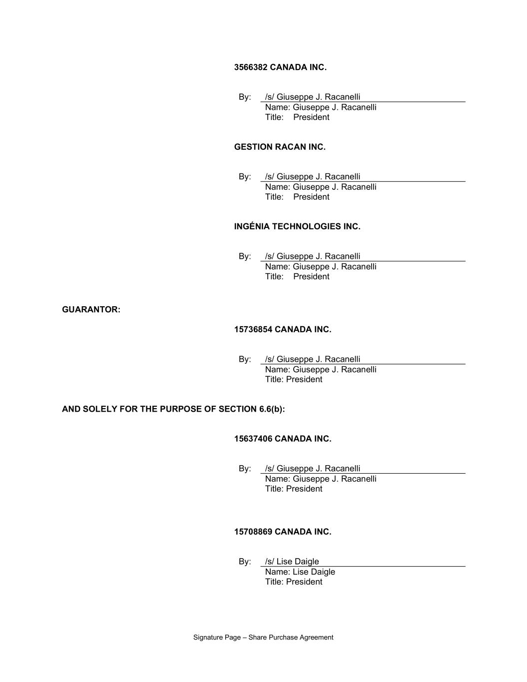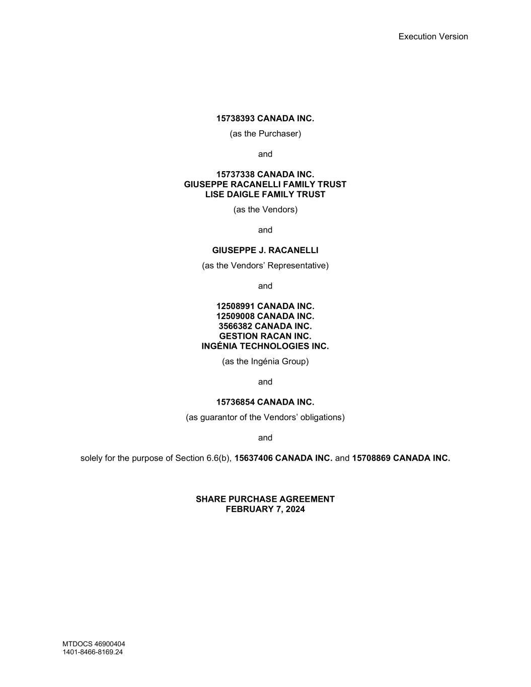 Signature Page – Share Purchase Agreement 3566382 CANADA INC. By: /s/ Giuseppe J. Racanelli Name: Giuseppe J. Racanelli Title: President GESTION RACAN INC. By: /s/ Giuseppe J. Racanelli Name: Giuseppe J. Racanelli Title: President INGÉNIA TECHNOLOGIES INC. By: /s/ Giuseppe J. Racanelli Name: Giuseppe J. Racanelli Title: President GUARANTOR: 15736854 CANADA INC. By: /s/ Giuseppe J. Racanelli Name: Giuseppe J. Racanelli Title: President AND SOLELY FOR THE PURPOSE OF SECTION 6.6(b): 15637406 CANADA INC. By: /s/ Giuseppe J. Racanelli Name: Giuseppe J. Racanelli Title: President 15708869 CANADA INC. By: /s/ Lise Daigle Name: Lise Daigle Title: President