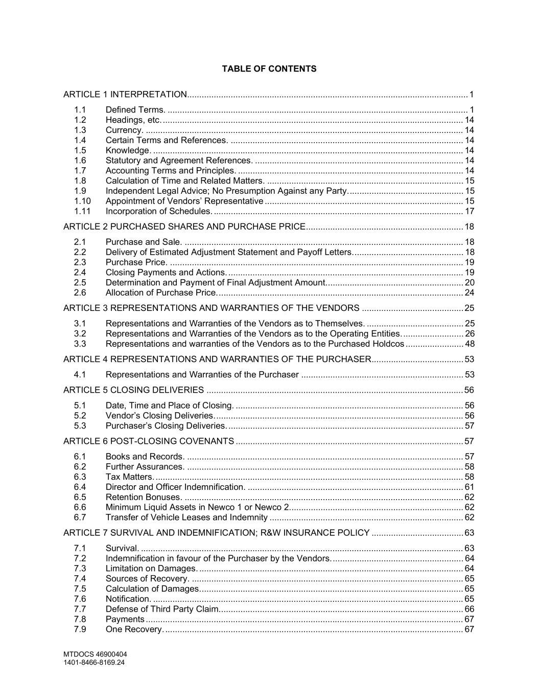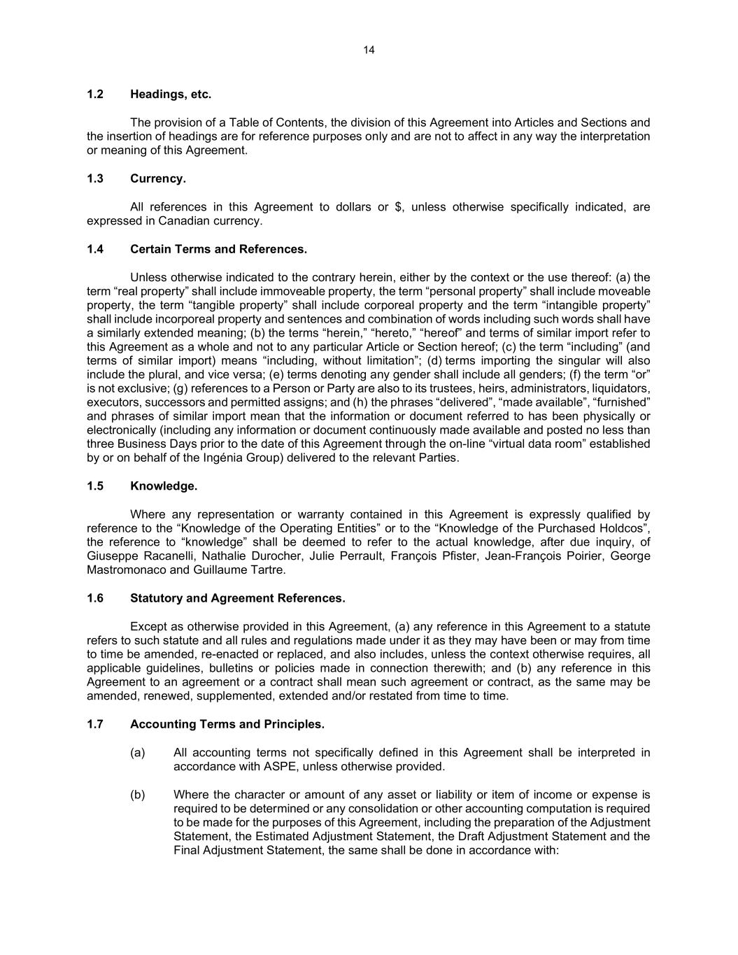 14 1.2 Headings, etc. The provision of a Table of Contents, the division of this Agreement into Articles and Sections and the insertion of headings are for reference purposes only and are not to affect in any way the interpretation or meaning of this Agreement. 1.3 Currency. All references in this Agreement to dollars or $, unless otherwise specifically indicated, are expressed in Canadian currency. 1.4 Certain Terms and References. Unless otherwise indicated to the contrary herein, either by the context or the use thereof: (a) the term “real property” shall include immoveable property, the term “personal property” shall include moveable property, the term “tangible property” shall include corporeal property and the term “intangible property” shall include incorporeal property and sentences and combination of words including such words shall have a similarly extended meaning; (b) the terms “herein,” “hereto,” “hereof” and terms of similar import refer to this Agreement as a whole and not to any particular Article or Section hereof; (c) the term “including” (and terms of similar import) means “including, without limitation”; (d) terms importing the singular will also include the plural, and vice versa; (e) terms denoting any gender shall include all genders; (f) the term “or” is not exclusive; (g) references to a Person or Party are also to its trustees, heirs, administrators, liquidators, executors, successors and permitted assigns; and (h) the phrases “delivered”, “made available”, “furnished” and phrases of similar import mean that the information or document referred to has been physically or electronically (including any information or document continuously made available and posted no less than three Business Days prior to the date of this Agreement through the on-line “virtual data room” established by or on behalf of the Ingénia Group) delivered to the relevant Parties. 1.5 Knowledge. Where any representation or warranty contained in this Agreement is expressly qualified by reference to the “Knowledge of the Operating Entities” or to the “Knowledge of the Purchased Holdcos”, the reference to “knowledge” shall be deemed to refer to the actual knowledge, after due inquiry, of Giuseppe Racanelli, Nathalie Durocher, Julie Perrault, François Pfister, Jean-François Poirier, George Mastromonaco and Guillaume Tartre. 1.6 Statutory and Agreement References. Except as otherwise provided in this Agreement, (a) any reference in this Agreement to a statute refers to such statute and all rules and regulations made under it as they may have been or may from time to time be amended, re-enacted or replaced, and also includes, unless the context otherwise requires, all applicable guidelines, bulletins or policies made in connection therewith; and (b) any reference in this Agreement to an agreement or a contract shall mean such agreement or contract, as the same may be amended, renewed, supplemented, extended and/or restated from time to time. 1.7 Accounting Terms and Principles. (a) All accounting terms not specifically defined in this Agreement shall be interpreted in accordance with ASPE, unless otherwise provided. (b) Where the character or amount of any asset or liability or item of income or expense is required to be determined or any consolidation or other accounting computation is required to be made for the purposes of this Agreement, including the preparation of the Adjustment Statement, the Estimated Adjustment Statement, the Draft Adjustment Statement and the Final Adjustment Statement, the same shall be done in accordance with: