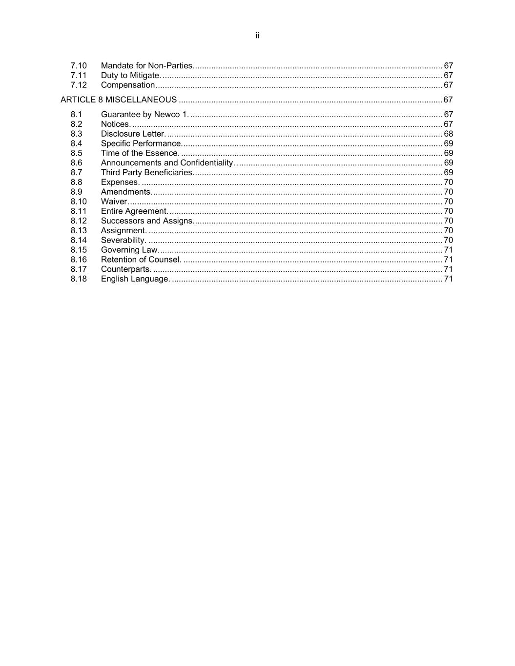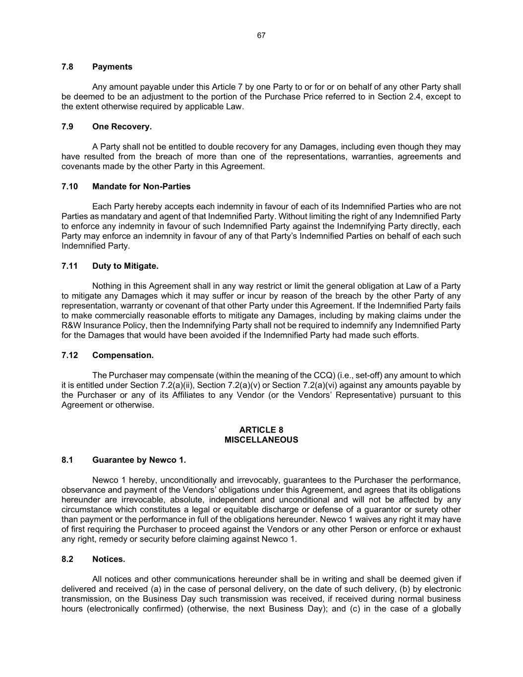 67 7.8 Payments Any amount payable under this Article 7 by one Party to or for or on behalf of any other Party shall be deemed to be an adjustment to the portion of the Purchase Price referred to in Section 2.4, except to the extent otherwise required by applicable Law. 7.9 One Recovery. A Party shall not be entitled to double recovery for any Damages, including even though they may have resulted from the breach of more than one of the representations, warranties, agreements and covenants made by the other Party in this Agreement. 7.10 Mandate for Non-Parties Each Party hereby accepts each indemnity in favour of each of its Indemnified Parties who are not Parties as mandatary and agent of that Indemnified Party. Without limiting the right of any Indemnified Party to enforce any indemnity in favour of such Indemnified Party against the Indemnifying Party directly, each Party may enforce an indemnity in favour of any of that Party’s Indemnified Parties on behalf of each such Indemnified Party. 7.11 Duty to Mitigate. Nothing in this Agreement shall in any way restrict or limit the general obligation at Law of a Party to mitigate any Damages which it may suffer or incur by reason of the breach by the other Party of any representation, warranty or covenant of that other Party under this Agreement. If the Indemnified Party fails to make commercially reasonable efforts to mitigate any Damages, including by making claims under the R&W Insurance Policy, then the Indemnifying Party shall not be required to indemnify any Indemnified Party for the Damages that would have been avoided if the Indemnified Party had made such efforts. 7.12 Compensation. The Purchaser may compensate (within the meaning of the CCQ) (i.e., set-off) any amount to which it is entitled under Section 7.2(a)(ii), Section 7.2(a)(v) or Section 7.2(a)(vi) against any amounts payable by the Purchaser or any of its Affiliates to any Vendor (or the Vendors’ Representative) pursuant to this Agreement or otherwise. ARTICLE 8 MISCELLANEOUS 8.1 Guarantee by Newco 1. Newco 1 hereby, unconditionally and irrevocably, guarantees to the Purchaser the performance, observance and payment of the Vendors’ obligations under this Agreement, and agrees that its obligations hereunder are irrevocable, absolute, independent and unconditional and will not be affected by any circumstance which constitutes a legal or equitable discharge or defense of a guarantor or surety other than payment or the performance in full of the obligations hereunder. Newco 1 waives any right it may have of first requiring the Purchaser to proceed against the Vendors or any other Person or enforce or exhaust any right, remedy or security before claiming against Newco 1. 8.2 Notices. All notices and other communications hereunder shall be in writing and shall be deemed given if delivered and received (a) in the case of personal delivery, on the date of such delivery, (b) by electronic transmission, on the Business Day such transmission was received, if received during normal business hours (electronically confirmed) (otherwise, the next Business Day); and (c) in the case of a globally