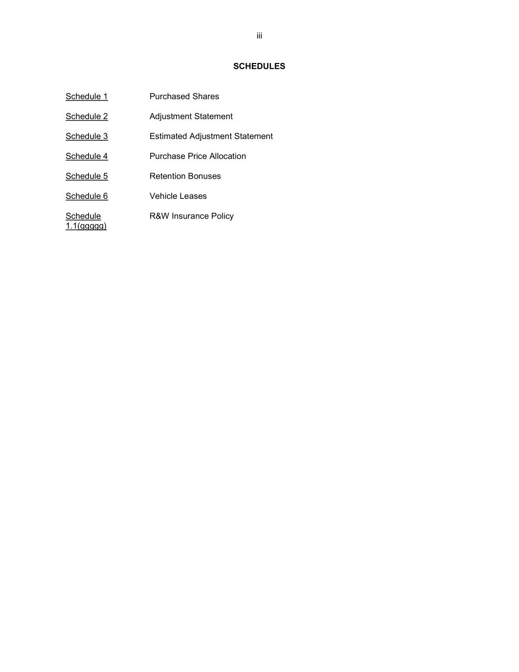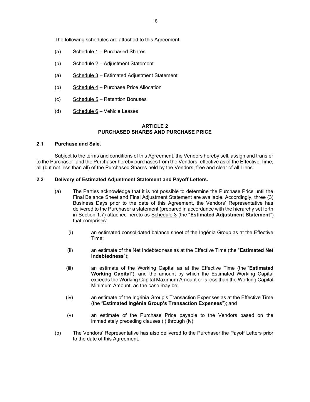 18 The following schedules are attached to this Agreement: (a) Schedule 1 – Purchased Shares (b) Schedule 2 – Adjustment Statement (a) Schedule 3 – Estimated Adjustment Statement (b) Schedule 4 – Purchase Price Allocation (c) Schedule 5 – Retention Bonuses (d) Schedule 6 – Vehicle Leases ARTICLE 2 PURCHASED SHARES AND PURCHASE PRICE 2.1 Purchase and Sale. Subject to the terms and conditions of this Agreement, the Vendors hereby sell, assign and transfer to the Purchaser, and the Purchaser hereby purchases from the Vendors, effective as of the Effective Time, all (but not less than all) of the Purchased Shares held by the Vendors, free and clear of all Liens. 2.2 Delivery of Estimated Adjustment Statement and Payoff Letters. (a) The Parties acknowledge that it is not possible to determine the Purchase Price until the Final Balance Sheet and Final Adjustment Statement are available. Accordingly, three (3) Business Days prior to the date of this Agreement, the Vendors’ Representative has delivered to the Purchaser a statement (prepared in accordance with the hierarchy set forth in Section 1.7) attached hereto as Schedule 3 (the “Estimated Adjustment Statement”) that comprises: (i) an estimated consolidated balance sheet of the Ingénia Group as at the Effective Time; (ii) an estimate of the Net Indebtedness as at the Effective Time (the “Estimated Net Indebtedness”); (iii) an estimate of the Working Capital as at the Effective Time (the “Estimated Working Capital”), and the amount by which the Estimated Working Capital exceeds the Working Capital Maximum Amount or is less than the Working Capital Minimum Amount, as the case may be; (iv) an estimate of the Ingénia Group’s Transaction Expenses as at the Effective Time (the “Estimated Ingénia Group’s Transaction Expenses”); and (v) an estimate of the Purchase Price payable to the Vendors based on the immediately preceding clauses (i) through (iv). (b) The Vendors’ Representative has also delivered to the Purchaser the Payoff Letters prior to the date of this Agreement.