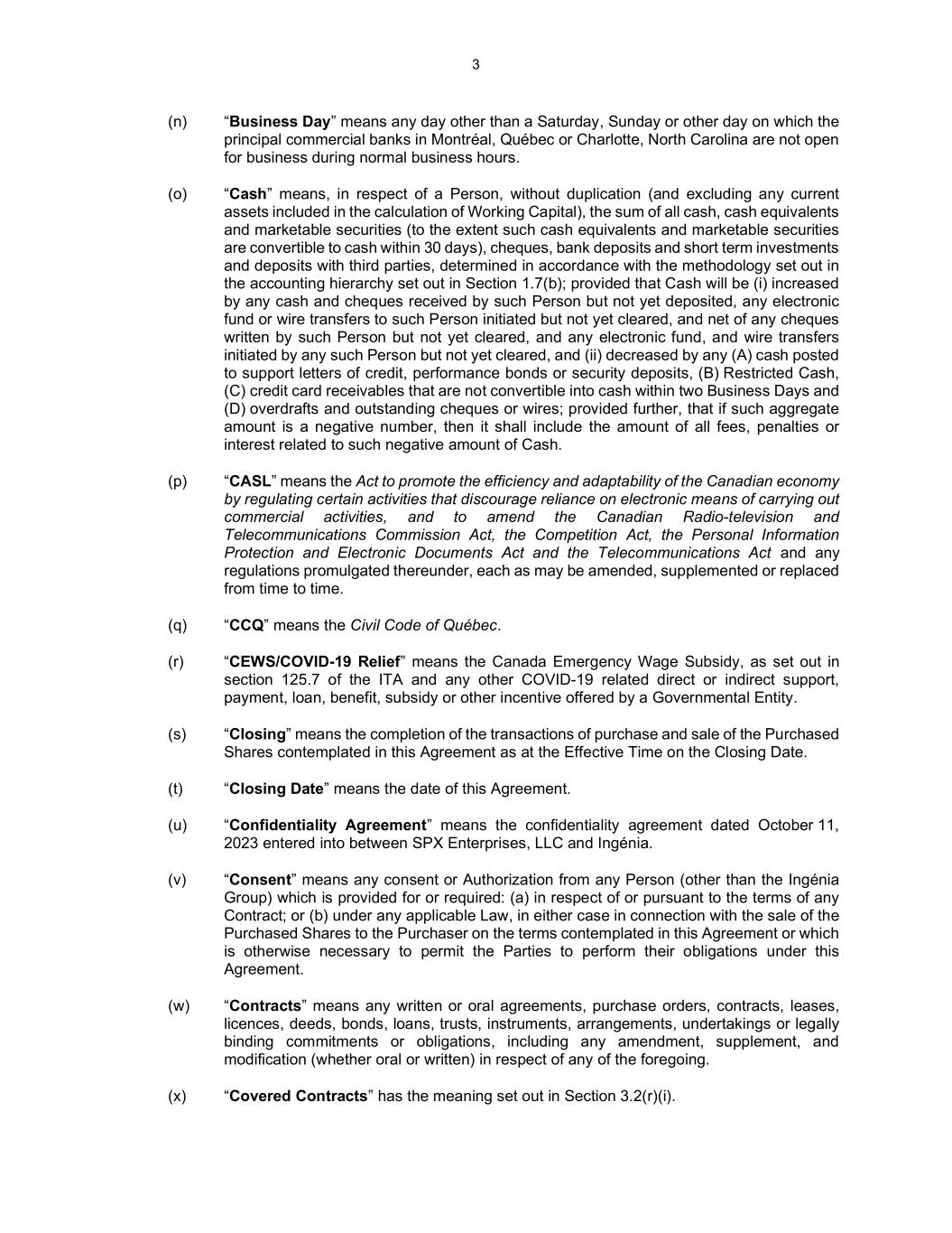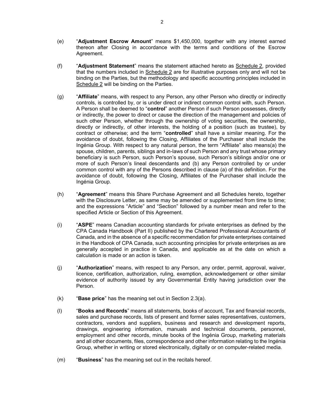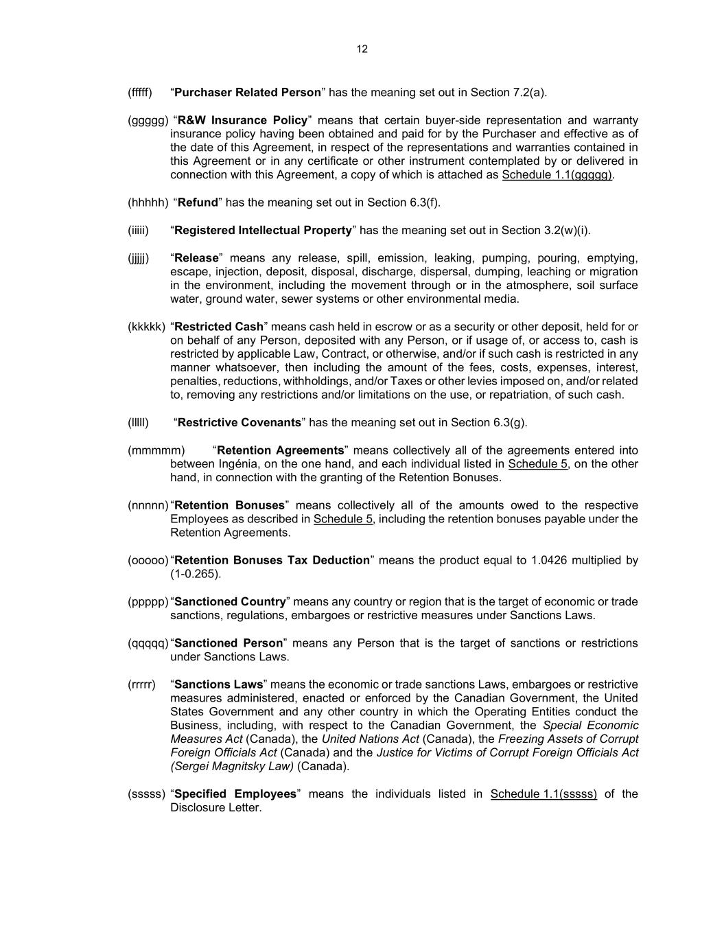 12 (fffff) “Purchaser Related Person” has the meaning set out in Section 7.2(a). (ggggg) “R&W Insurance Policy” means that certain buyer-side representation and warranty insurance policy having been obtained and paid for by the Purchaser and effective as of the date of this Agreement, in respect of the representations and warranties contained in this Agreement or in any certificate or other instrument contemplated by or delivered in connection with this Agreement, a copy of which is attached as Schedule 1.1(ggggg). (hhhhh) “Refund” has the meaning set out in Section 6.3(f). (iiiii) “Registered Intellectual Property” has the meaning set out in Section 3.2(w)(i). (jjjjj) “Release” means any release, spill, emission, leaking, pumping, pouring, emptying, escape, injection, deposit, disposal, discharge, dispersal, dumping, leaching or migration in the environment, including the movement through or in the atmosphere, soil surface water, ground water, sewer systems or other environmental media. (kkkkk) “Restricted Cash” means cash held in escrow or as a security or other deposit, held for or on behalf of any Person, deposited with any Person, or if usage of, or access to, cash is restricted by applicable Law, Contract, or otherwise, and/or if such cash is restricted in any manner whatsoever, then including the amount of the fees, costs, expenses, interest, penalties, reductions, withholdings, and/or Taxes or other levies imposed on, and/or related to, removing any restrictions and/or limitations on the use, or repatriation, of such cash. (lllll) “Restrictive Covenants” has the meaning set out in Section 6.3(g). (mmmmm) “Retention Agreements” means collectively all of the agreements entered into between Ingénia, on the one hand, and each individual listed in Schedule 5, on the other hand, in connection with the granting of the Retention Bonuses. (nnnnn) “Retention Bonuses” means collectively all of the amounts owed to the respective Employees as described in Schedule 5, including the retention bonuses payable under the Retention Agreements. (ooooo) “Retention Bonuses Tax Deduction” means the product equal to 1.0426 multiplied by (1-0.265). (ppppp) “Sanctioned Country” means any country or region that is the target of economic or trade sanctions, regulations, embargoes or restrictive measures under Sanctions Laws. (qqqqq) “Sanctioned Person” means any Person that is the target of sanctions or restrictions under Sanctions Laws. (rrrrr) “Sanctions Laws” means the economic or trade sanctions Laws, embargoes or restrictive measures administered, enacted or enforced by the Canadian Government, the United States Government and any other country in which the Operating Entities conduct the Business, including, with respect to the Canadian Government, the Special Economic Measures Act (Canada), the United Nations Act (Canada), the Freezing Assets of Corrupt Foreign Officials Act (Canada) and the Justice for Victims of Corrupt Foreign Officials Act (Sergei Magnitsky Law) (Canada). (sssss) “Specified Employees” means the individuals listed in Schedule 1.1(sssss) of the Disclosure Letter.