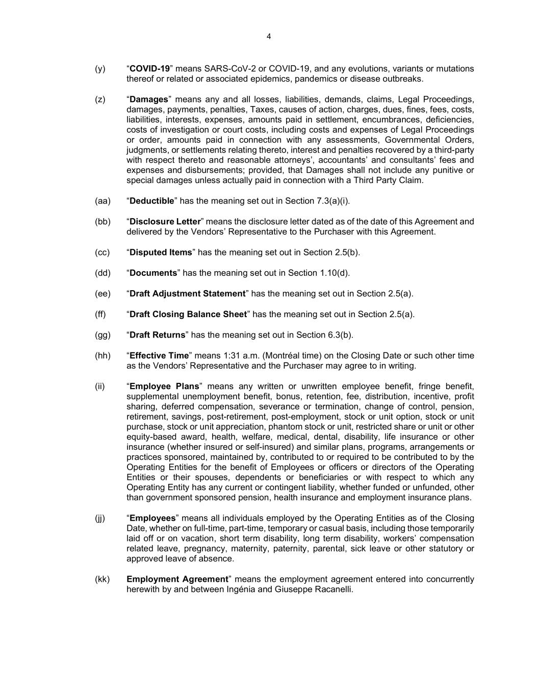 4 (y) “COVID-19” means SARS-CoV-2 or COVID-19, and any evolutions, variants or mutations thereof or related or associated epidemics, pandemics or disease outbreaks. (z) “Damages” means any and all losses, liabilities, demands, claims, Legal Proceedings, damages, payments, penalties, Taxes, causes of action, charges, dues, fines, fees, costs, liabilities, interests, expenses, amounts paid in settlement, encumbrances, deficiencies, costs of investigation or court costs, including costs and expenses of Legal Proceedings or order, amounts paid in connection with any assessments, Governmental Orders, judgments, or settlements relating thereto, interest and penalties recovered by a third-party with respect thereto and reasonable attorneys’, accountants’ and consultants’ fees and expenses and disbursements; provided, that Damages shall not include any punitive or special damages unless actually paid in connection with a Third Party Claim. (aa) “Deductible” has the meaning set out in Section 7.3(a)(i). (bb) “Disclosure Letter” means the disclosure letter dated as of the date of this Agreement and delivered by the Vendors’ Representative to the Purchaser with this Agreement. (cc) “Disputed Items” has the meaning set out in Section 2.5(b). (dd) “Documents” has the meaning set out in Section 1.10(d). (ee) “Draft Adjustment Statement” has the meaning set out in Section 2.5(a). (ff) “Draft Closing Balance Sheet” has the meaning set out in Section 2.5(a). (gg) “Draft Returns” has the meaning set out in Section 6.3(b). (hh) “Effective Time” means 1:31 a.m. (Montréal time) on the Closing Date or such other time as the Vendors’ Representative and the Purchaser may agree to in writing. (ii) “Employee Plans” means any written or unwritten employee benefit, fringe benefit, supplemental unemployment benefit, bonus, retention, fee, distribution, incentive, profit sharing, deferred compensation, severance or termination, change of control, pension, retirement, savings, post-retirement, post-employment, stock or unit option, stock or unit purchase, stock or unit appreciation, phantom stock or unit, restricted share or unit or other equity-based award, health, welfare, medical, dental, disability, life insurance or other insurance (whether insured or self-insured) and similar plans, programs, arrangements or practices sponsored, maintained by, contributed to or required to be contributed to by the Operating Entities for the benefit of Employees or officers or directors of the Operating Entities or their spouses, dependents or beneficiaries or with respect to which any Operating Entity has any current or contingent liability, whether funded or unfunded, other than government sponsored pension, health insurance and employment insurance plans. (jj) “Employees” means all individuals employed by the Operating Entities as of the Closing Date, whether on full-time, part-time, temporary or casual basis, including those temporarily laid off or on vacation, short term disability, long term disability, workers’ compensation related leave, pregnancy, maternity, paternity, parental, sick leave or other statutory or approved leave of absence. (kk) Employment Agreement” means the employment agreement entered into concurrently herewith by and between Ingénia and Giuseppe Racanelli.