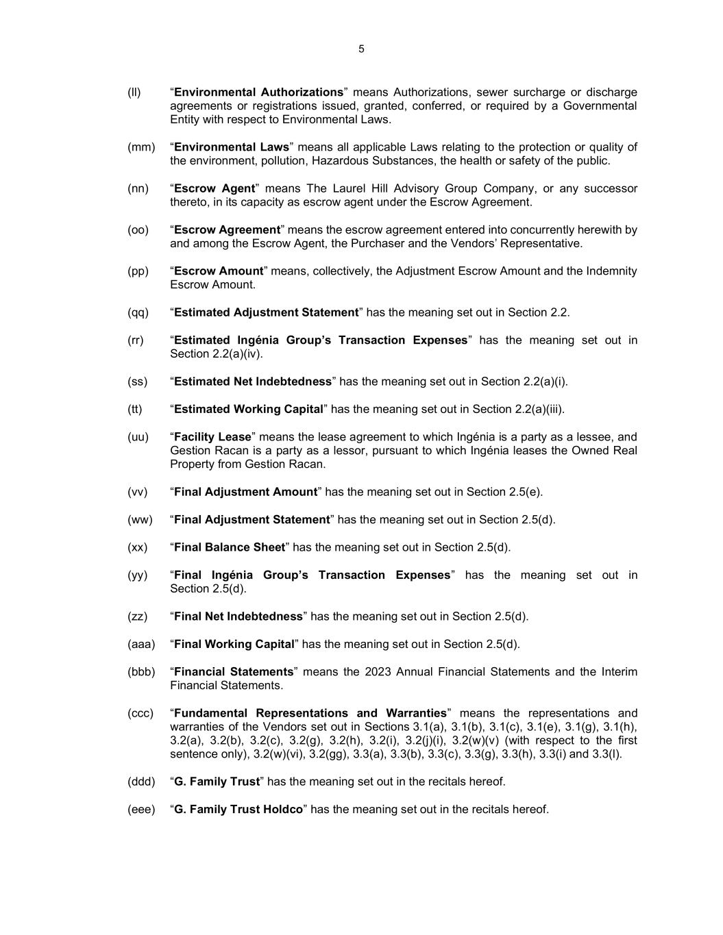 5 (ll) “Environmental Authorizations” means Authorizations, sewer surcharge or discharge agreements or registrations issued, granted, conferred, or required by a Governmental Entity with respect to Environmental Laws. (mm) “Environmental Laws” means all applicable Laws relating to the protection or quality of the environment, pollution, Hazardous Substances, the health or safety of the public. (nn) “Escrow Agent” means The Laurel Hill Advisory Group Company, or any successor thereto, in its capacity as escrow agent under the Escrow Agreement. (oo) “Escrow Agreement” means the escrow agreement entered into concurrently herewith by and among the Escrow Agent, the Purchaser and the Vendors’ Representative. (pp) “Escrow Amount” means, collectively, the Adjustment Escrow Amount and the Indemnity Escrow Amount. (qq) “Estimated Adjustment Statement” has the meaning set out in Section 2.2. (rr) “Estimated Ingénia Group’s Transaction Expenses” has the meaning set out in Section 2.2(a)(iv). (ss) “Estimated Net Indebtedness” has the meaning set out in Section 2.2(a)(i). (tt) “Estimated Working Capital” has the meaning set out in Section 2.2(a)(iii). (uu) “Facility Lease” means the lease agreement to which Ingénia is a party as a lessee, and Gestion Racan is a party as a lessor, pursuant to which Ingénia leases the Owned Real Property from Gestion Racan. (vv) “Final Adjustment Amount” has the meaning set out in Section 2.5(e). (ww) “Final Adjustment Statement” has the meaning set out in Section 2.5(d). (xx) “Final Balance Sheet” has the meaning set out in Section 2.5(d). (yy) “Final Ingénia Group’s Transaction Expenses” has the meaning set out in Section 2.5(d). (zz) “Final Net Indebtedness” has the meaning set out in Section 2.5(d). (aaa) “Final Working Capital” has the meaning set out in Section 2.5(d). (bbb) “Financial Statements” means the 2023 Annual Financial Statements and the Interim Financial Statements. (ccc) “Fundamental Representations and Warranties” means the representations and warranties of the Vendors set out in Sections 3.1(a), 3.1(b), 3.1(c), 3.1(e), 3.1(g), 3.1(h), 3.2(a), 3.2(b), 3.2(c), 3.2(g), 3.2(h), 3.2(i), 3.2(j)(i), 3.2(w)(v) (with respect to the first sentence only), 3.2(w)(vi), 3.2(gg), 3.3(a), 3.3(b), 3.3(c), 3.3(g), 3.3(h), 3.3(i) and 3.3(l). (ddd) “G. Family Trust” has the meaning set out in the recitals hereof. (eee) “G. Family Trust Holdco” has the meaning set out in the recitals hereof.