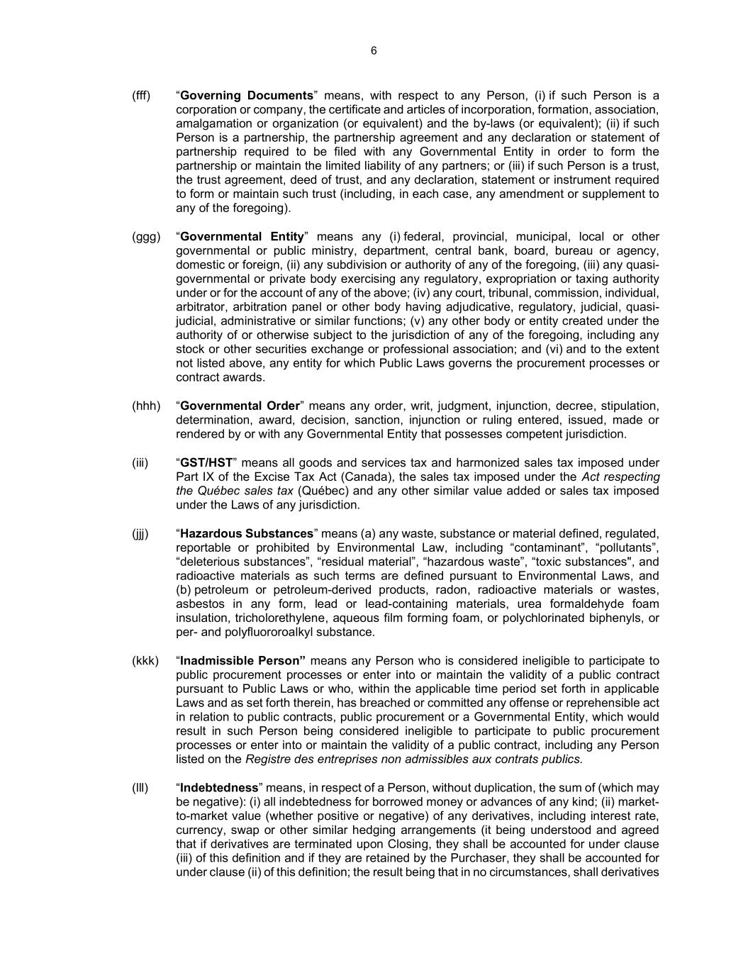 6 (fff) “Governing Documents” means, with respect to any Person, (i) if such Person is a corporation or company, the certificate and articles of incorporation, formation, association, amalgamation or organization (or equivalent) and the by-laws (or equivalent); (ii) if such Person is a partnership, the partnership agreement and any declaration or statement of partnership required to be filed with any Governmental Entity in order to form the partnership or maintain the limited liability of any partners; or (iii) if such Person is a trust, the trust agreement, deed of trust, and any declaration, statement or instrument required to form or maintain such trust (including, in each case, any amendment or supplement to any of the foregoing). (ggg) “Governmental Entity” means any (i) federal, provincial, municipal, local or other governmental or public ministry, department, central bank, board, bureau or agency, domestic or foreign, (ii) any subdivision or authority of any of the foregoing, (iii) any quasi- governmental or private body exercising any regulatory, expropriation or taxing authority under or for the account of any of the above; (iv) any court, tribunal, commission, individual, arbitrator, arbitration panel or other body having adjudicative, regulatory, judicial, quasi- judicial, administrative or similar functions; (v) any other body or entity created under the authority of or otherwise subject to the jurisdiction of any of the foregoing, including any stock or other securities exchange or professional association; and (vi) and to the extent not listed above, any entity for which Public Laws governs the procurement processes or contract awards. (hhh) “Governmental Order” means any order, writ, judgment, injunction, decree, stipulation, determination, award, decision, sanction, injunction or ruling entered, issued, made or rendered by or with any Governmental Entity that possesses competent jurisdiction. (iii) “GST/HST” means all goods and services tax and harmonized sales tax imposed under Part IX of the Excise Tax Act (Canada), the sales tax imposed under the Act respecting the Québec sales tax (Québec) and any other similar value added or sales tax imposed under the Laws of any jurisdiction. (jjj) “Hazardous Substances” means (a) any waste, substance or material defined, regulated, reportable or prohibited by Environmental Law, including “contaminant”, “pollutants”, “deleterious substances”, “residual material”, “hazardous waste”, “toxic substances", and radioactive materials as such terms are defined pursuant to Environmental Laws, and (b) petroleum or petroleum-derived products, radon, radioactive materials or wastes, asbestos in any form, lead or lead-containing materials, urea formaldehyde foam insulation, tricholorethylene, aqueous film forming foam, or polychlorinated biphenyls, or per- and polyfluororoalkyl substance. (kkk) “Inadmissible Person” means any Person who is considered ineligible to participate to public procurement processes or enter into or maintain the validity of a public contract pursuant to Public Laws or who, within the applicable time period set forth in applicable Laws and as set forth therein, has breached or committed any offense or reprehensible act in relation to public contracts, public procurement or a Governmental Entity, which would result in such Person being considered ineligible to participate to public procurement processes or enter into or maintain the validity of a public contract, including any Person listed on the Registre des entreprises non admissibles aux contrats publics. (lll) “Indebtedness” means, in respect of a Person, without duplication, the sum of (which may be negative): (i) all indebtedness for borrowed money or advances of any kind; (ii) market- to-market value (whether positive or negative) of any derivatives, including interest rate, currency, swap or other similar hedging arrangements (it being understood and agreed that if derivatives are terminated upon Closing, they shall be accounted for under clause (iii) of this definition and if they are retained by the Purchaser, they shall be accounted for under clause (ii) of this definition; the result being that in no circumstances, shall derivatives