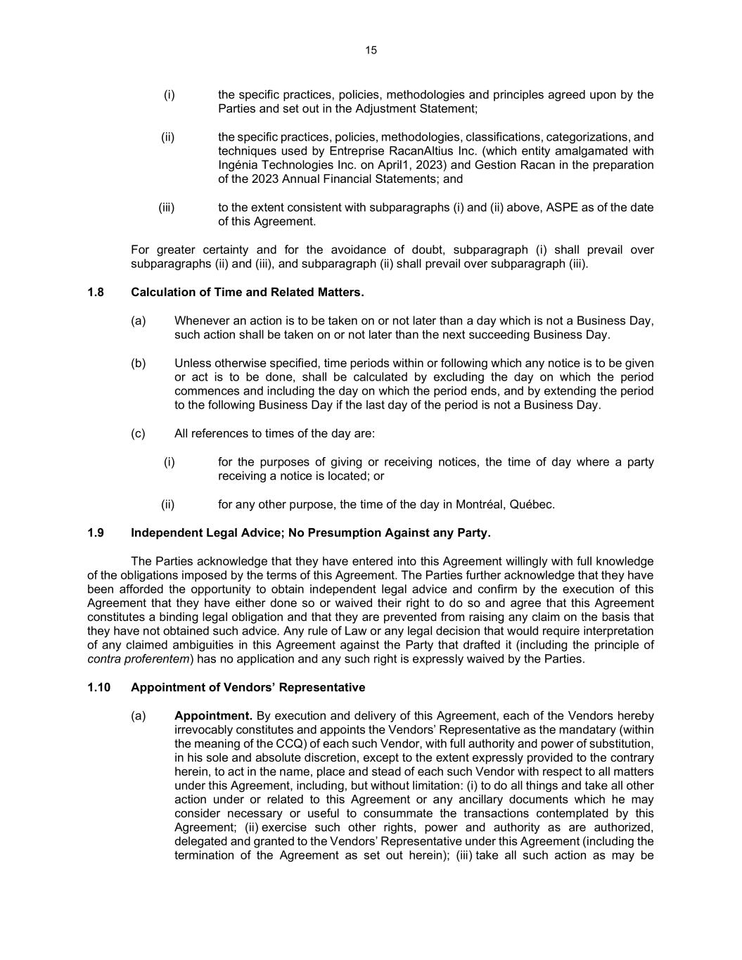 15 (i) the specific practices, policies, methodologies and principles agreed upon by the Parties and set out in the Adjustment Statement; (ii) the specific practices, policies, methodologies, classifications, categorizations, and techniques used by Entreprise RacanAltius Inc. (which entity amalgamated with Ingénia Technologies Inc. on April1, 2023) and Gestion Racan in the preparation of the 2023 Annual Financial Statements; and (iii) to the extent consistent with subparagraphs (i) and (ii) above, ASPE as of the date of this Agreement. For greater certainty and for the avoidance of doubt, subparagraph (i) shall prevail over subparagraphs (ii) and (iii), and subparagraph (ii) shall prevail over subparagraph (iii). 1.8 Calculation of Time and Related Matters. (a) Whenever an action is to be taken on or not later than a day which is not a Business Day, such action shall be taken on or not later than the next succeeding Business Day. (b) Unless otherwise specified, time periods within or following which any notice is to be given or act is to be done, shall be calculated by excluding the day on which the period commences and including the day on which the period ends, and by extending the period to the following Business Day if the last day of the period is not a Business Day. (c) All references to times of the day are: (i) for the purposes of giving or receiving notices, the time of day where a party receiving a notice is located; or (ii) for any other purpose, the time of the day in Montréal, Québec. 1.9 Independent Legal Advice; No Presumption Against any Party. The Parties acknowledge that they have entered into this Agreement willingly with full knowledge of the obligations imposed by the terms of this Agreement. The Parties further acknowledge that they have been afforded the opportunity to obtain independent legal advice and confirm by the execution of this Agreement that they have either done so or waived their right to do so and agree that this Agreement constitutes a binding legal obligation and that they are prevented from raising any claim on the basis that they have not obtained such advice. Any rule of Law or any legal decision that would require interpretation of any claimed ambiguities in this Agreement against the Party that drafted it (including the principle of contra proferentem) has no application and any such right is expressly waived by the Parties. 1.10 Appointment of Vendors’ Representative (a) Appointment. By execution and delivery of this Agreement, each of the Vendors hereby irrevocably constitutes and appoints the Vendors’ Representative as the mandatary (within the meaning of the CCQ) of each such Vendor, with full authority and power of substitution, in his sole and absolute discretion, except to the extent expressly provided to the contrary herein, to act in the name, place and stead of each such Vendor with respect to all matters under this Agreement, including, but without limitation: (i) to do all things and take all other action under or related to this Agreement or any ancillary documents which he may consider necessary or useful to consummate the transactions contemplated by this Agreement; (ii) exercise such other rights, power and authority as are authorized, delegated and granted to the Vendors’ Representative under this Agreement (including the termination of the Agreement as set out herein); (iii) take all such action as may be