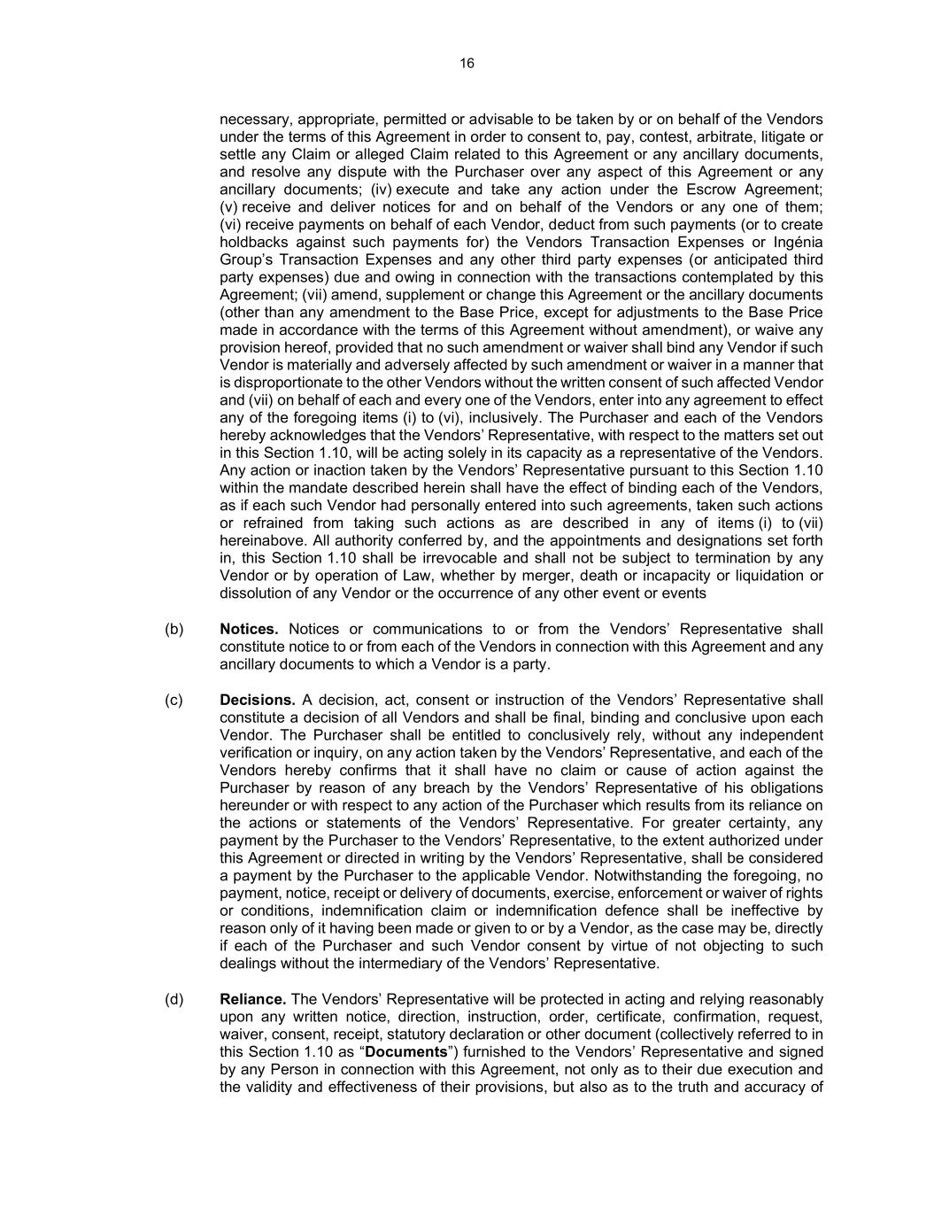 16 necessary, appropriate, permitted or advisable to be taken by or on behalf of the Vendors under the terms of this Agreement in order to consent to, pay, contest, arbitrate, litigate or settle any Claim or alleged Claim related to this Agreement or any ancillary documents, and resolve any dispute with the Purchaser over any aspect of this Agreement or any ancillary documents; (iv) execute and take any action under the Escrow Agreement; (v) receive and deliver notices for and on behalf of the Vendors or any one of them; (vi) receive payments on behalf of each Vendor, deduct from such payments (or to create holdbacks against such payments for) the Vendors Transaction Expenses or Ingénia Group’s Transaction Expenses and any other third party expenses (or anticipated third party expenses) due and owing in connection with the transactions contemplated by this Agreement; (vii) amend, supplement or change this Agreement or the ancillary documents (other than any amendment to the Base Price, except for adjustments to the Base Price made in accordance with the terms of this Agreement without amendment), or waive any provision hereof, provided that no such amendment or waiver shall bind any Vendor if such Vendor is materially and adversely affected by such amendment or waiver in a manner that is disproportionate to the other Vendors without the written consent of such affected Vendor and (vii) on behalf of each and every one of the Vendors, enter into any agreement to effect any of the foregoing items (i) to (vi), inclusively. The Purchaser and each of the Vendors hereby acknowledges that the Vendors’ Representative, with respect to the matters set out in this Section 1.10, will be acting solely in its capacity as a representative of the Vendors. Any action or inaction taken by the Vendors’ Representative pursuant to this Section 1.10 within the mandate described herein shall have the effect of binding each of the Vendors, as if each such Vendor had personally entered into such agreements, taken such actions or refrained from taking such actions as are described in any of items (i) to (vii) hereinabove. All authority conferred by, and the appointments and designations set forth in, this Section 1.10 shall be irrevocable and shall not be subject to termination by any Vendor or by operation of Law, whether by merger, death or incapacity or liquidation or dissolution of any Vendor or the occurrence of any other event or events (b) Notices. Notices or communications to or from the Vendors’ Representative shall constitute notice to or from each of the Vendors in connection with this Agreement and any ancillary documents to which a Vendor is a party. (c) Decisions. A decision, act, consent or instruction of the Vendors’ Representative shall constitute a decision of all Vendors and shall be final, binding and conclusive upon each Vendor. The Purchaser shall be entitled to conclusively rely, without any independent verification or inquiry, on any action taken by the Vendors’ Representative, and each of the Vendors hereby confirms that it shall have no claim or cause of action against the Purchaser by reason of any breach by the Vendors’ Representative of his obligations hereunder or with respect to any action of the Purchaser which results from its reliance on the actions or statements of the Vendors’ Representative. For greater certainty, any payment by the Purchaser to the Vendors’ Representative, to the extent authorized under this Agreement or directed in writing by the Vendors’ Representative, shall be considered a payment by the Purchaser to the applicable Vendor. Notwithstanding the foregoing, no payment, notice, receipt or delivery of documents, exercise, enforcement or waiver of rights or conditions, indemnification claim or indemnification defence shall be ineffective by reason only of it having been made or given to or by a Vendor, as the case may be, directly if each of the Purchaser and such Vendor consent by virtue of not objecting to such dealings without the intermediary of the Vendors’ Representative. (d) Reliance. The Vendors’ Representative will be protected in acting and relying reasonably upon any written notice, direction, instruction, order, certificate, confirmation, request, waiver, consent, receipt, statutory declaration or other document (collectively referred to in this Section 1.10 as “Documents”) furnished to the Vendors’ Representative and signed by any Person in connection with this Agreement, not only as to their due execution and the validity and effectiveness of their provisions, but also as to the truth and accuracy of
