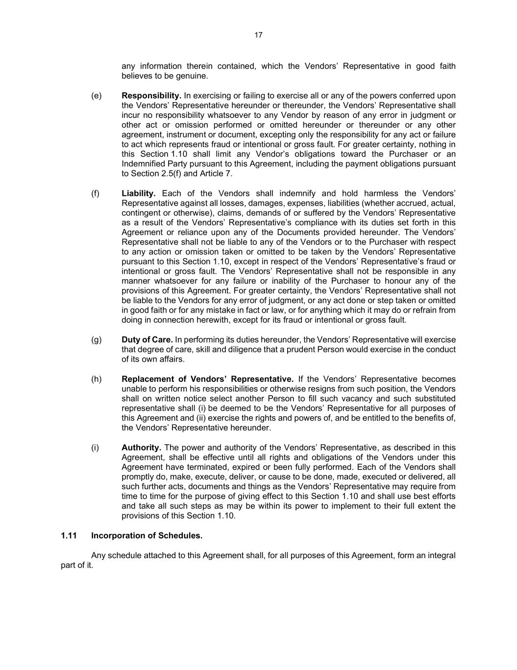 17 any information therein contained, which the Vendors’ Representative in good faith believes to be genuine. (e) Responsibility. In exercising or failing to exercise all or any of the powers conferred upon the Vendors’ Representative hereunder or thereunder, the Vendors’ Representative shall incur no responsibility whatsoever to any Vendor by reason of any error in judgment or other act or omission performed or omitted hereunder or thereunder or any other agreement, instrument or document, excepting only the responsibility for any act or failure to act which represents fraud or intentional or gross fault. For greater certainty, nothing in this Section 1.10 shall limit any Vendor’s obligations toward the Purchaser or an Indemnified Party pursuant to this Agreement, including the payment obligations pursuant to Section 2.5(f) and Article 7. (f) Liability. Each of the Vendors shall indemnify and hold harmless the Vendors’ Representative against all losses, damages, expenses, liabilities (whether accrued, actual, contingent or otherwise), claims, demands of or suffered by the Vendors’ Representative as a result of the Vendors’ Representative’s compliance with its duties set forth in this Agreement or reliance upon any of the Documents provided hereunder. The Vendors’ Representative shall not be liable to any of the Vendors or to the Purchaser with respect to any action or omission taken or omitted to be taken by the Vendors’ Representative pursuant to this Section 1.10, except in respect of the Vendors’ Representative’s fraud or intentional or gross fault. The Vendors’ Representative shall not be responsible in any manner whatsoever for any failure or inability of the Purchaser to honour any of the provisions of this Agreement. For greater certainty, the Vendors’ Representative shall not be liable to the Vendors for any error of judgment, or any act done or step taken or omitted in good faith or for any mistake in fact or law, or for anything which it may do or refrain from doing in connection herewith, except for its fraud or intentional or gross fault. (g) Duty of Care. In performing its duties hereunder, the Vendors’ Representative will exercise that degree of care, skill and diligence that a prudent Person would exercise in the conduct of its own affairs. (h) Replacement of Vendors’ Representative. If the Vendors’ Representative becomes unable to perform his responsibilities or otherwise resigns from such position, the Vendors shall on written notice select another Person to fill such vacancy and such substituted representative shall (i) be deemed to be the Vendors’ Representative for all purposes of this Agreement and (ii) exercise the rights and powers of, and be entitled to the benefits of, the Vendors’ Representative hereunder. (i) Authority. The power and authority of the Vendors’ Representative, as described in this Agreement, shall be effective until all rights and obligations of the Vendors under this Agreement have terminated, expired or been fully performed. Each of the Vendors shall promptly do, make, execute, deliver, or cause to be done, made, executed or delivered, all such further acts, documents and things as the Vendors’ Representative may require from time to time for the purpose of giving effect to this Section 1.10 and shall use best efforts and take all such steps as may be within its power to implement to their full extent the provisions of this Section 1.10. 1.11 Incorporation of Schedules. Any schedule attached to this Agreement shall, for all purposes of this Agreement, form an integral part of it.