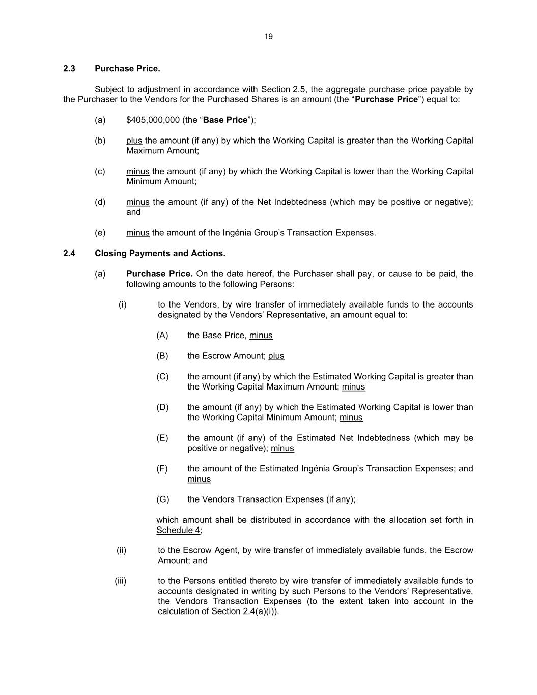 19 2.3 Purchase Price. Subject to adjustment in accordance with Section 2.5, the aggregate purchase price payable by the Purchaser to the Vendors for the Purchased Shares is an amount (the “Purchase Price”) equal to: (a) $405,000,000 (the “Base Price”); (b) plus the amount (if any) by which the Working Capital is greater than the Working Capital Maximum Amount; (c) minus the amount (if any) by which the Working Capital is lower than the Working Capital Minimum Amount; (d) minus the amount (if any) of the Net Indebtedness (which may be positive or negative); and (e) minus the amount of the Ingénia Group’s Transaction Expenses. 2.4 Closing Payments and Actions. (a) Purchase Price. On the date hereof, the Purchaser shall pay, or cause to be paid, the following amounts to the following Persons: (i) to the Vendors, by wire transfer of immediately available funds to the accounts designated by the Vendors’ Representative, an amount equal to: (A) the Base Price, minus (B) the Escrow Amount; plus (C) the amount (if any) by which the Estimated Working Capital is greater than the Working Capital Maximum Amount; minus (D) the amount (if any) by which the Estimated Working Capital is lower than the Working Capital Minimum Amount; minus (E) the amount (if any) of the Estimated Net Indebtedness (which may be positive or negative); minus (F) the amount of the Estimated Ingénia Group’s Transaction Expenses; and minus (G) the Vendors Transaction Expenses (if any); which amount shall be distributed in accordance with the allocation set forth in Schedule 4; (ii) to the Escrow Agent, by wire transfer of immediately available funds, the Escrow Amount; and (iii) to the Persons entitled thereto by wire transfer of immediately available funds to accounts designated in writing by such Persons to the Vendors’ Representative, the Vendors Transaction Expenses (to the extent taken into account in the calculation of Section 2.4(a)(i)).