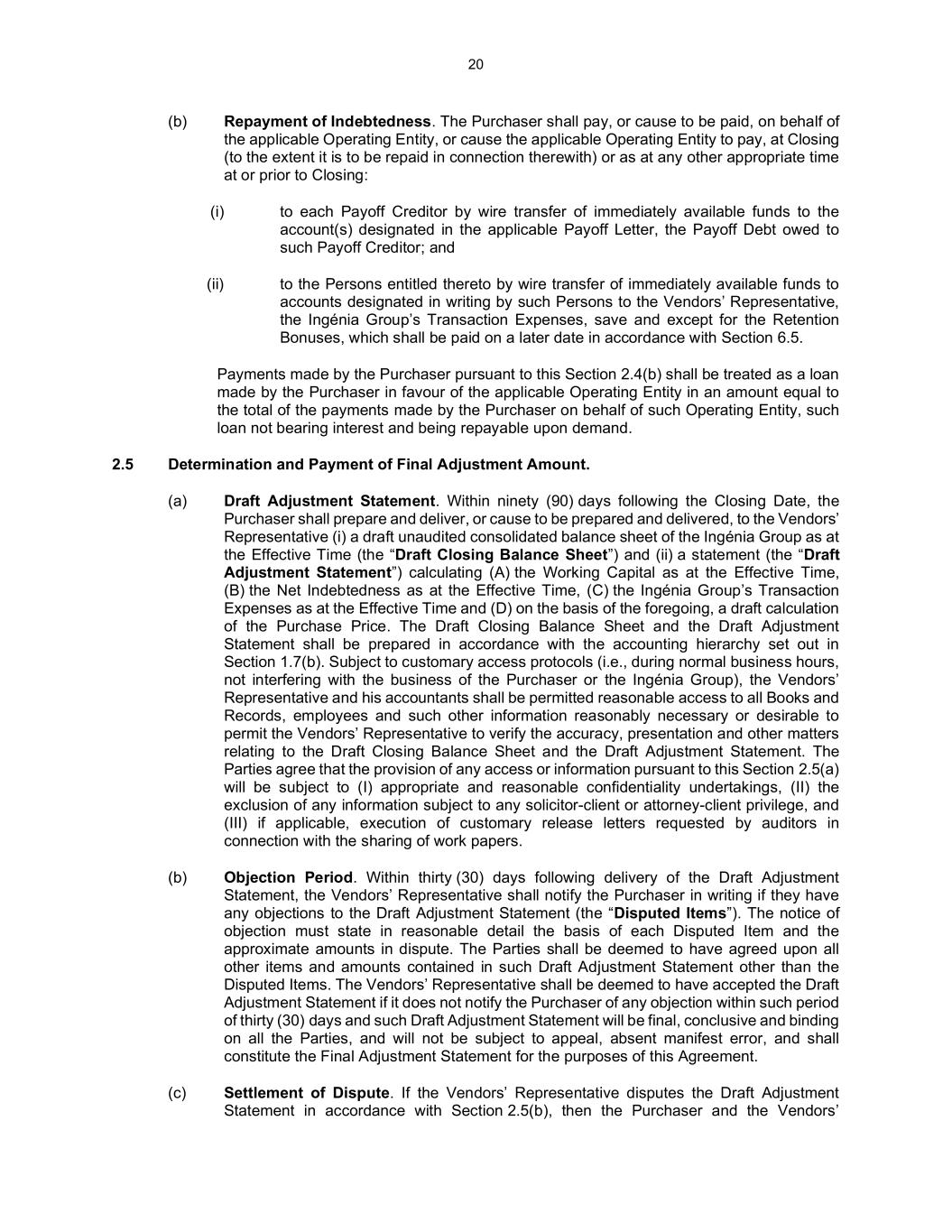 20 (b) Repayment of Indebtedness. The Purchaser shall pay, or cause to be paid, on behalf of the applicable Operating Entity, or cause the applicable Operating Entity to pay, at Closing (to the extent it is to be repaid in connection therewith) or as at any other appropriate time at or prior to Closing: (i) to each Payoff Creditor by wire transfer of immediately available funds to the account(s) designated in the applicable Payoff Letter, the Payoff Debt owed to such Payoff Creditor; and (ii) to the Persons entitled thereto by wire transfer of immediately available funds to accounts designated in writing by such Persons to the Vendors’ Representative, the Ingénia Group’s Transaction Expenses, save and except for the Retention Bonuses, which shall be paid on a later date in accordance with Section 6.5. Payments made by the Purchaser pursuant to this Section 2.4(b) shall be treated as a loan made by the Purchaser in favour of the applicable Operating Entity in an amount equal to the total of the payments made by the Purchaser on behalf of such Operating Entity, such loan not bearing interest and being repayable upon demand. 2.5 Determination and Payment of Final Adjustment Amount. (a) Draft Adjustment Statement. Within ninety (90) days following the Closing Date, the Purchaser shall prepare and deliver, or cause to be prepared and delivered, to the Vendors’ Representative (i) a draft unaudited consolidated balance sheet of the Ingénia Group as at the Effective Time (the “Draft Closing Balance Sheet”) and (ii) a statement (the “Draft Adjustment Statement”) calculating (A) the Working Capital as at the Effective Time, (B) the Net Indebtedness as at the Effective Time, (C) the Ingénia Group’s Transaction Expenses as at the Effective Time and (D) on the basis of the foregoing, a draft calculation of the Purchase Price. The Draft Closing Balance Sheet and the Draft Adjustment Statement shall be prepared in accordance with the accounting hierarchy set out in Section 1.7(b). Subject to customary access protocols (i.e., during normal business hours, not interfering with the business of the Purchaser or the Ingénia Group), the Vendors’ Representative and his accountants shall be permitted reasonable access to all Books and Records, employees and such other information reasonably necessary or desirable to permit the Vendors’ Representative to verify the accuracy, presentation and other matters relating to the Draft Closing Balance Sheet and the Draft Adjustment Statement. The Parties agree that the provision of any access or information pursuant to this Section 2.5(a) will be subject to (I) appropriate and reasonable confidentiality undertakings, (II) the exclusion of any information subject to any solicitor-client or attorney-client privilege, and (III) if applicable, execution of customary release letters requested by auditors in connection with the sharing of work papers. (b) Objection Period. Within thirty (30) days following delivery of the Draft Adjustment Statement, the Vendors’ Representative shall notify the Purchaser in writing if they have any objections to the Draft Adjustment Statement (the “Disputed Items”). The notice of objection must state in reasonable detail the basis of each Disputed Item and the approximate amounts in dispute. The Parties shall be deemed to have agreed upon all other items and amounts contained in such Draft Adjustment Statement other than the Disputed Items. The Vendors’ Representative shall be deemed to have accepted the Draft Adjustment Statement if it does not notify the Purchaser of any objection within such period of thirty (30) days and such Draft Adjustment Statement will be final, conclusive and binding on all the Parties, and will not be subject to appeal, absent manifest error, and shall constitute the Final Adjustment Statement for the purposes of this Agreement. (c) Settlement of Dispute. If the Vendors’ Representative disputes the Draft Adjustment Statement in accordance with Section 2.5(b), then the Purchaser and the Vendors’