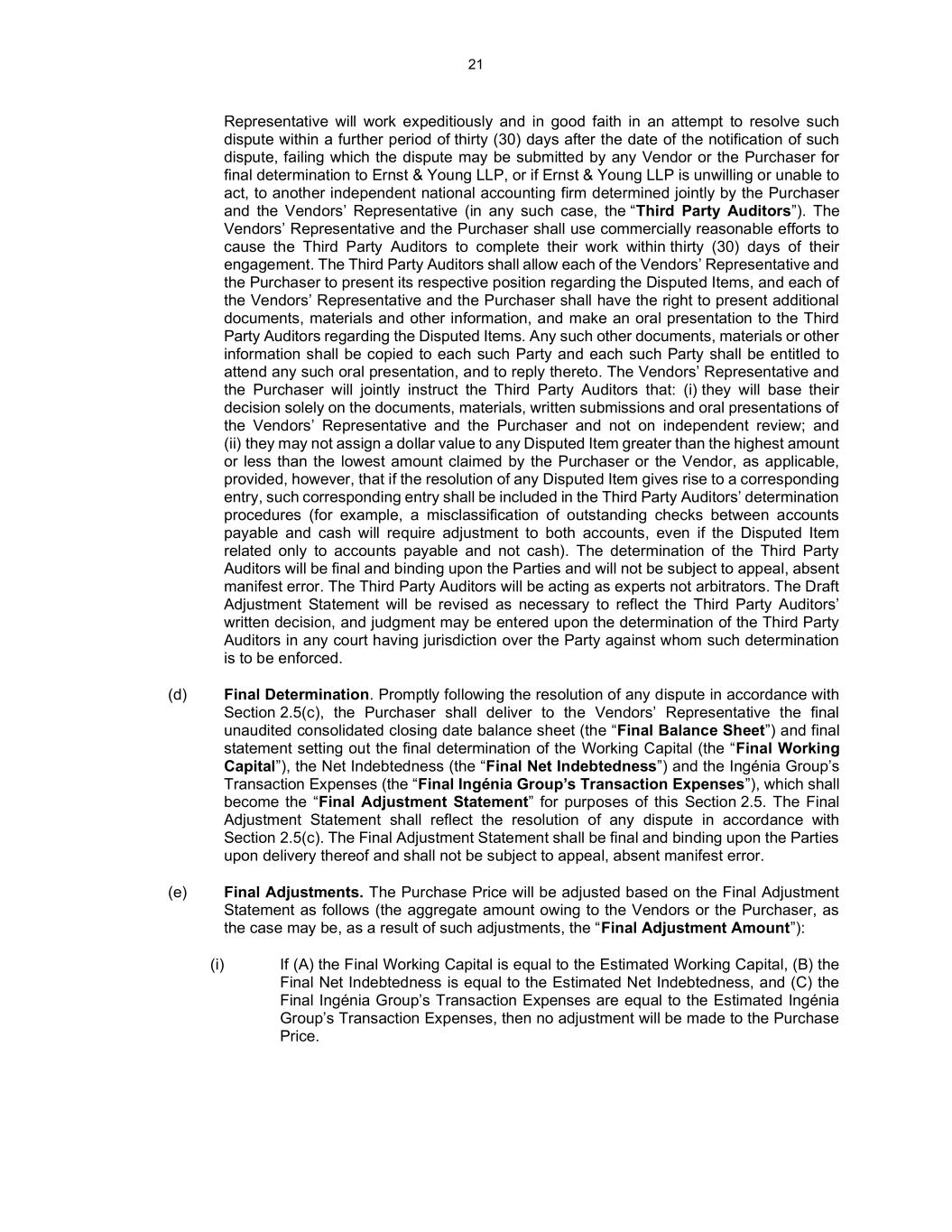21 Representative will work expeditiously and in good faith in an attempt to resolve such dispute within a further period of thirty (30) days after the date of the notification of such dispute, failing which the dispute may be submitted by any Vendor or the Purchaser for final determination to Ernst & Young LLP, or if Ernst & Young LLP is unwilling or unable to act, to another independent national accounting firm determined jointly by the Purchaser and the Vendors’ Representative (in any such case, the “Third Party Auditors”). The Vendors’ Representative and the Purchaser shall use commercially reasonable efforts to cause the Third Party Auditors to complete their work within thirty (30) days of their engagement. The Third Party Auditors shall allow each of the Vendors’ Representative and the Purchaser to present its respective position regarding the Disputed Items, and each of the Vendors’ Representative and the Purchaser shall have the right to present additional documents, materials and other information, and make an oral presentation to the Third Party Auditors regarding the Disputed Items. Any such other documents, materials or other information shall be copied to each such Party and each such Party shall be entitled to attend any such oral presentation, and to reply thereto. The Vendors’ Representative and the Purchaser will jointly instruct the Third Party Auditors that: (i) they will base their decision solely on the documents, materials, written submissions and oral presentations of the Vendors’ Representative and the Purchaser and not on independent review; and (ii) they may not assign a dollar value to any Disputed Item greater than the highest amount or less than the lowest amount claimed by the Purchaser or the Vendor, as applicable, provided, however, that if the resolution of any Disputed Item gives rise to a corresponding entry, such corresponding entry shall be included in the Third Party Auditors’ determination procedures (for example, a misclassification of outstanding checks between accounts payable and cash will require adjustment to both accounts, even if the Disputed Item related only to accounts payable and not cash). The determination of the Third Party Auditors will be final and binding upon the Parties and will not be subject to appeal, absent manifest error. The Third Party Auditors will be acting as experts not arbitrators. The Draft Adjustment Statement will be revised as necessary to reflect the Third Party Auditors’ written decision, and judgment may be entered upon the determination of the Third Party Auditors in any court having jurisdiction over the Party against whom such determination is to be enforced. (d) Final Determination. Promptly following the resolution of any dispute in accordance with Section 2.5(c), the Purchaser shall deliver to the Vendors’ Representative the final unaudited consolidated closing date balance sheet (the “Final Balance Sheet”) and final statement setting out the final determination of the Working Capital (the “Final Working Capital”), the Net Indebtedness (the “Final Net Indebtedness”) and the Ingénia Group’s Transaction Expenses (the “Final Ingénia Group’s Transaction Expenses”), which shall become the “Final Adjustment Statement” for purposes of this Section 2.5. The Final Adjustment Statement shall reflect the resolution of any dispute in accordance with Section 2.5(c). The Final Adjustment Statement shall be final and binding upon the Parties upon delivery thereof and shall not be subject to appeal, absent manifest error. (e) Final Adjustments. The Purchase Price will be adjusted based on the Final Adjustment Statement as follows (the aggregate amount owing to the Vendors or the Purchaser, as the case may be, as a result of such adjustments, the “Final Adjustment Amount”): (i) If (A) the Final Working Capital is equal to the Estimated Working Capital, (B) the Final Net Indebtedness is equal to the Estimated Net Indebtedness, and (C) the Final Ingénia Group’s Transaction Expenses are equal to the Estimated Ingénia Group’s Transaction Expenses, then no adjustment will be made to the Purchase Price.