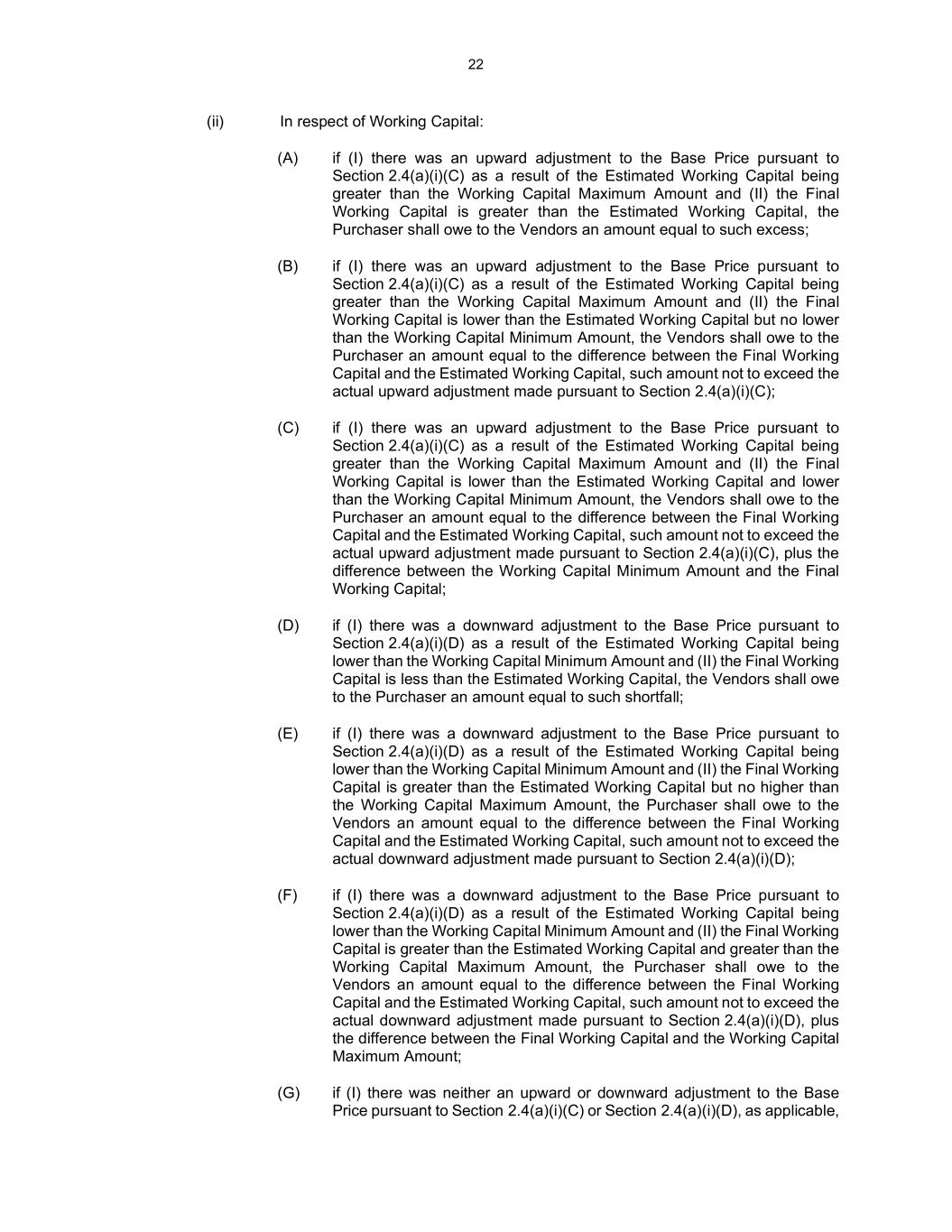 22 (ii) In respect of Working Capital: (A) if (I) there was an upward adjustment to the Base Price pursuant to Section 2.4(a)(i)(C) as a result of the Estimated Working Capital being greater than the Working Capital Maximum Amount and (II) the Final Working Capital is greater than the Estimated Working Capital, the Purchaser shall owe to the Vendors an amount equal to such excess; (B) if (I) there was an upward adjustment to the Base Price pursuant to Section 2.4(a)(i)(C) as a result of the Estimated Working Capital being greater than the Working Capital Maximum Amount and (II) the Final Working Capital is lower than the Estimated Working Capital but no lower than the Working Capital Minimum Amount, the Vendors shall owe to the Purchaser an amount equal to the difference between the Final Working Capital and the Estimated Working Capital, such amount not to exceed the actual upward adjustment made pursuant to Section 2.4(a)(i)(C); (C) if (I) there was an upward adjustment to the Base Price pursuant to Section 2.4(a)(i)(C) as a result of the Estimated Working Capital being greater than the Working Capital Maximum Amount and (II) the Final Working Capital is lower than the Estimated Working Capital and lower than the Working Capital Minimum Amount, the Vendors shall owe to the Purchaser an amount equal to the difference between the Final Working Capital and the Estimated Working Capital, such amount not to exceed the actual upward adjustment made pursuant to Section 2.4(a)(i)(C), plus the difference between the Working Capital Minimum Amount and the Final Working Capital; (D) if (I) there was a downward adjustment to the Base Price pursuant to Section 2.4(a)(i)(D) as a result of the Estimated Working Capital being lower than the Working Capital Minimum Amount and (II) the Final Working Capital is less than the Estimated Working Capital, the Vendors shall owe to the Purchaser an amount equal to such shortfall; (E) if (I) there was a downward adjustment to the Base Price pursuant to Section 2.4(a)(i)(D) as a result of the Estimated Working Capital being lower than the Working Capital Minimum Amount and (II) the Final Working Capital is greater than the Estimated Working Capital but no higher than the Working Capital Maximum Amount, the Purchaser shall owe to the Vendors an amount equal to the difference between the Final Working Capital and the Estimated Working Capital, such amount not to exceed the actual downward adjustment made pursuant to Section 2.4(a)(i)(D); (F) if (I) there was a downward adjustment to the Base Price pursuant to Section 2.4(a)(i)(D) as a result of the Estimated Working Capital being lower than the Working Capital Minimum Amount and (II) the Final Working Capital is greater than the Estimated Working Capital and greater than the Working Capital Maximum Amount, the Purchaser shall owe to the Vendors an amount equal to the difference between the Final Working Capital and the Estimated Working Capital, such amount not to exceed the actual downward adjustment made pursuant to Section 2.4(a)(i)(D), plus the difference between the Final Working Capital and the Working Capital Maximum Amount; (G) if (I) there was neither an upward or downward adjustment to the Base Price pursuant to Section 2.4(a)(i)(C) or Section 2.4(a)(i)(D), as applicable,