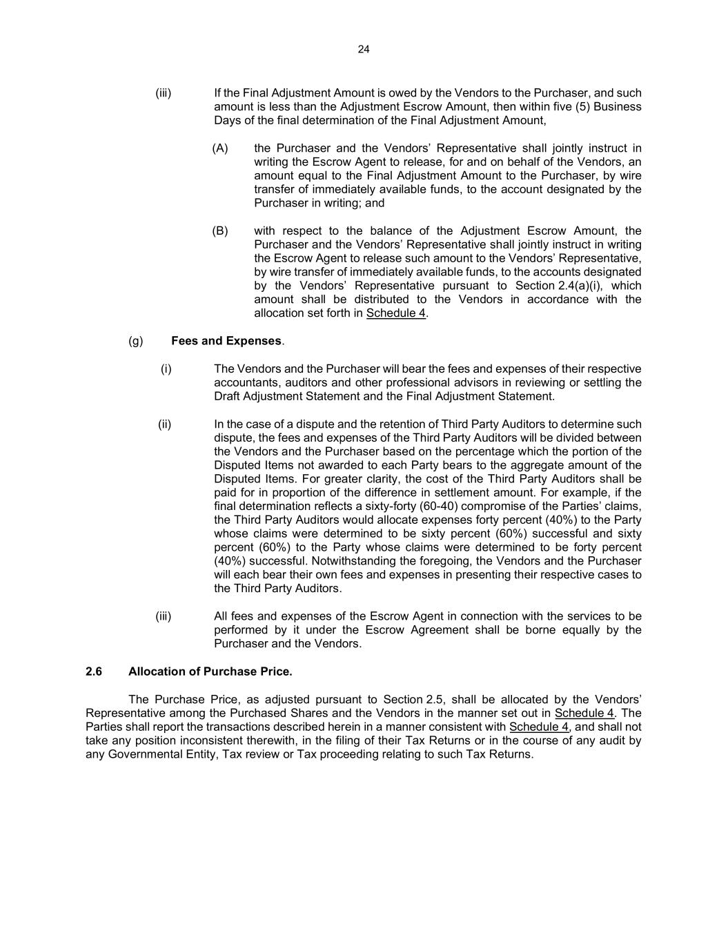 24 (iii) If the Final Adjustment Amount is owed by the Vendors to the Purchaser, and such amount is less than the Adjustment Escrow Amount, then within five (5) Business Days of the final determination of the Final Adjustment Amount, (A) the Purchaser and the Vendors’ Representative shall jointly instruct in writing the Escrow Agent to release, for and on behalf of the Vendors, an amount equal to the Final Adjustment Amount to the Purchaser, by wire transfer of immediately available funds, to the account designated by the Purchaser in writing; and (B) with respect to the balance of the Adjustment Escrow Amount, the Purchaser and the Vendors’ Representative shall jointly instruct in writing the Escrow Agent to release such amount to the Vendors’ Representative, by wire transfer of immediately available funds, to the accounts designated by the Vendors’ Representative pursuant to Section 2.4(a)(i), which amount shall be distributed to the Vendors in accordance with the allocation set forth in Schedule 4. (g) Fees and Expenses. (i) The Vendors and the Purchaser will bear the fees and expenses of their respective accountants, auditors and other professional advisors in reviewing or settling the Draft Adjustment Statement and the Final Adjustment Statement. (ii) In the case of a dispute and the retention of Third Party Auditors to determine such dispute, the fees and expenses of the Third Party Auditors will be divided between the Vendors and the Purchaser based on the percentage which the portion of the Disputed Items not awarded to each Party bears to the aggregate amount of the Disputed Items. For greater clarity, the cost of the Third Party Auditors shall be paid for in proportion of the difference in settlement amount. For example, if the final determination reflects a sixty-forty (60-40) compromise of the Parties’ claims, the Third Party Auditors would allocate expenses forty percent (40%) to the Party whose claims were determined to be sixty percent (60%) successful and sixty percent (60%) to the Party whose claims were determined to be forty percent (40%) successful. Notwithstanding the foregoing, the Vendors and the Purchaser will each bear their own fees and expenses in presenting their respective cases to the Third Party Auditors. (iii) All fees and expenses of the Escrow Agent in connection with the services to be performed by it under the Escrow Agreement shall be borne equally by the Purchaser and the Vendors. 2.6 Allocation of Purchase Price. The Purchase Price, as adjusted pursuant to Section 2.5, shall be allocated by the Vendors’ Representative among the Purchased Shares and the Vendors in the manner set out in Schedule 4. The Parties shall report the transactions described herein in a manner consistent with Schedule 4, and shall not take any position inconsistent therewith, in the filing of their Tax Returns or in the course of any audit by any Governmental Entity, Tax review or Tax proceeding relating to such Tax Returns.