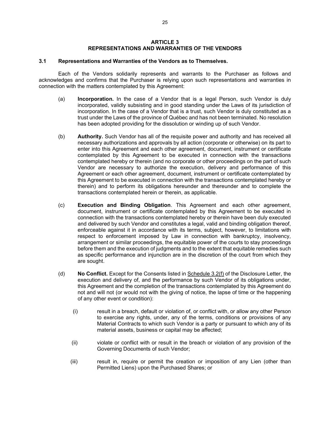 25 ARTICLE 3 REPRESENTATIONS AND WARRANTIES OF THE VENDORS 3.1 Representations and Warranties of the Vendors as to Themselves. Each of the Vendors solidarily represents and warrants to the Purchaser as follows and acknowledges and confirms that the Purchaser is relying upon such representations and warranties in connection with the matters contemplated by this Agreement: (a) Incorporation. In the case of a Vendor that is a legal Person, such Vendor is duly incorporated, validly subsisting and in good standing under the Laws of its jurisdiction of incorporation. In the case of a Vendor that is a trust, such Vendor is duly constituted as a trust under the Laws of the province of Québec and has not been terminated. No resolution has been adopted providing for the dissolution or winding up of such Vendor. (b) Authority. Such Vendor has all of the requisite power and authority and has received all necessary authorizations and approvals by all action (corporate or otherwise) on its part to enter into this Agreement and each other agreement, document, instrument or certificate contemplated by this Agreement to be executed in connection with the transactions contemplated hereby or therein (and no corporate or other proceedings on the part of such Vendor are necessary to authorize the execution, delivery and performance of this Agreement or each other agreement, document, instrument or certificate contemplated by this Agreement to be executed in connection with the transactions contemplated hereby or therein) and to perform its obligations hereunder and thereunder and to complete the transactions contemplated herein or therein, as applicable. (c) Execution and Binding Obligation. This Agreement and each other agreement, document, instrument or certificate contemplated by this Agreement to be executed in connection with the transactions contemplated hereby or therein have been duly executed and delivered by such Vendor and constitutes a legal, valid and binding obligation thereof, enforceable against it in accordance with its terms, subject, however, to limitations with respect to enforcement imposed by Law in connection with bankruptcy, insolvency, arrangement or similar proceedings, the equitable power of the courts to stay proceedings before them and the execution of judgments and to the extent that equitable remedies such as specific performance and injunction are in the discretion of the court from which they are sought. (d) No Conflict. Except for the Consents listed in Schedule 3.2(f) of the Disclosure Letter, the execution and delivery of, and the performance by such Vendor of its obligations under, this Agreement and the completion of the transactions contemplated by this Agreement do not and will not (or would not with the giving of notice, the lapse of time or the happening of any other event or condition): (i) result in a breach, default or violation of, or conflict with, or allow any other Person to exercise any rights, under, any of the terms, conditions or provisions of any Material Contracts to which such Vendor is a party or pursuant to which any of its material assets, business or capital may be affected; (ii) violate or conflict with or result in the breach or violation of any provision of the Governing Documents of such Vendor; (iii) result in, require or permit the creation or imposition of any Lien (other than Permitted Liens) upon the Purchased Shares; or