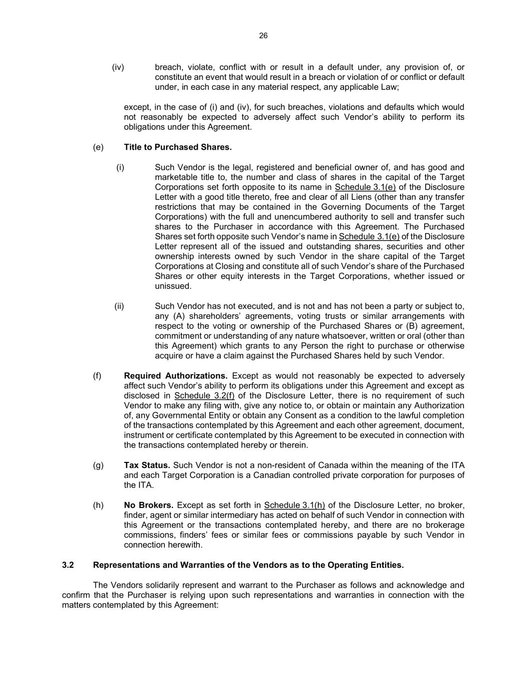 26 (iv) breach, violate, conflict with or result in a default under, any provision of, or constitute an event that would result in a breach or violation of or conflict or default under, in each case in any material respect, any applicable Law; except, in the case of (i) and (iv), for such breaches, violations and defaults which would not reasonably be expected to adversely affect such Vendor’s ability to perform its obligations under this Agreement. (e) Title to Purchased Shares. (i) Such Vendor is the legal, registered and beneficial owner of, and has good and marketable title to, the number and class of shares in the capital of the Target Corporations set forth opposite to its name in Schedule 3.1(e) of the Disclosure Letter with a good title thereto, free and clear of all Liens (other than any transfer restrictions that may be contained in the Governing Documents of the Target Corporations) with the full and unencumbered authority to sell and transfer such shares to the Purchaser in accordance with this Agreement. The Purchased Shares set forth opposite such Vendor’s name in Schedule 3.1(e) of the Disclosure Letter represent all of the issued and outstanding shares, securities and other ownership interests owned by such Vendor in the share capital of the Target Corporations at Closing and constitute all of such Vendor’s share of the Purchased Shares or other equity interests in the Target Corporations, whether issued or unissued. (ii) Such Vendor has not executed, and is not and has not been a party or subject to, any (A) shareholders’ agreements, voting trusts or similar arrangements with respect to the voting or ownership of the Purchased Shares or (B) agreement, commitment or understanding of any nature whatsoever, written or oral (other than this Agreement) which grants to any Person the right to purchase or otherwise acquire or have a claim against the Purchased Shares held by such Vendor. (f) Required Authorizations. Except as would not reasonably be expected to adversely affect such Vendor’s ability to perform its obligations under this Agreement and except as disclosed in Schedule 3.2(f) of the Disclosure Letter, there is no requirement of such Vendor to make any filing with, give any notice to, or obtain or maintain any Authorization of, any Governmental Entity or obtain any Consent as a condition to the lawful completion of the transactions contemplated by this Agreement and each other agreement, document, instrument or certificate contemplated by this Agreement to be executed in connection with the transactions contemplated hereby or therein. (g) Tax Status. Such Vendor is not a non-resident of Canada within the meaning of the ITA and each Target Corporation is a Canadian controlled private corporation for purposes of the ITA. (h) No Brokers. Except as set forth in Schedule 3.1(h) of the Disclosure Letter, no broker, finder, agent or similar intermediary has acted on behalf of such Vendor in connection with this Agreement or the transactions contemplated hereby, and there are no brokerage commissions, finders’ fees or similar fees or commissions payable by such Vendor in connection herewith. 3.2 Representations and Warranties of the Vendors as to the Operating Entities. The Vendors solidarily represent and warrant to the Purchaser as follows and acknowledge and confirm that the Purchaser is relying upon such representations and warranties in connection with the matters contemplated by this Agreement: