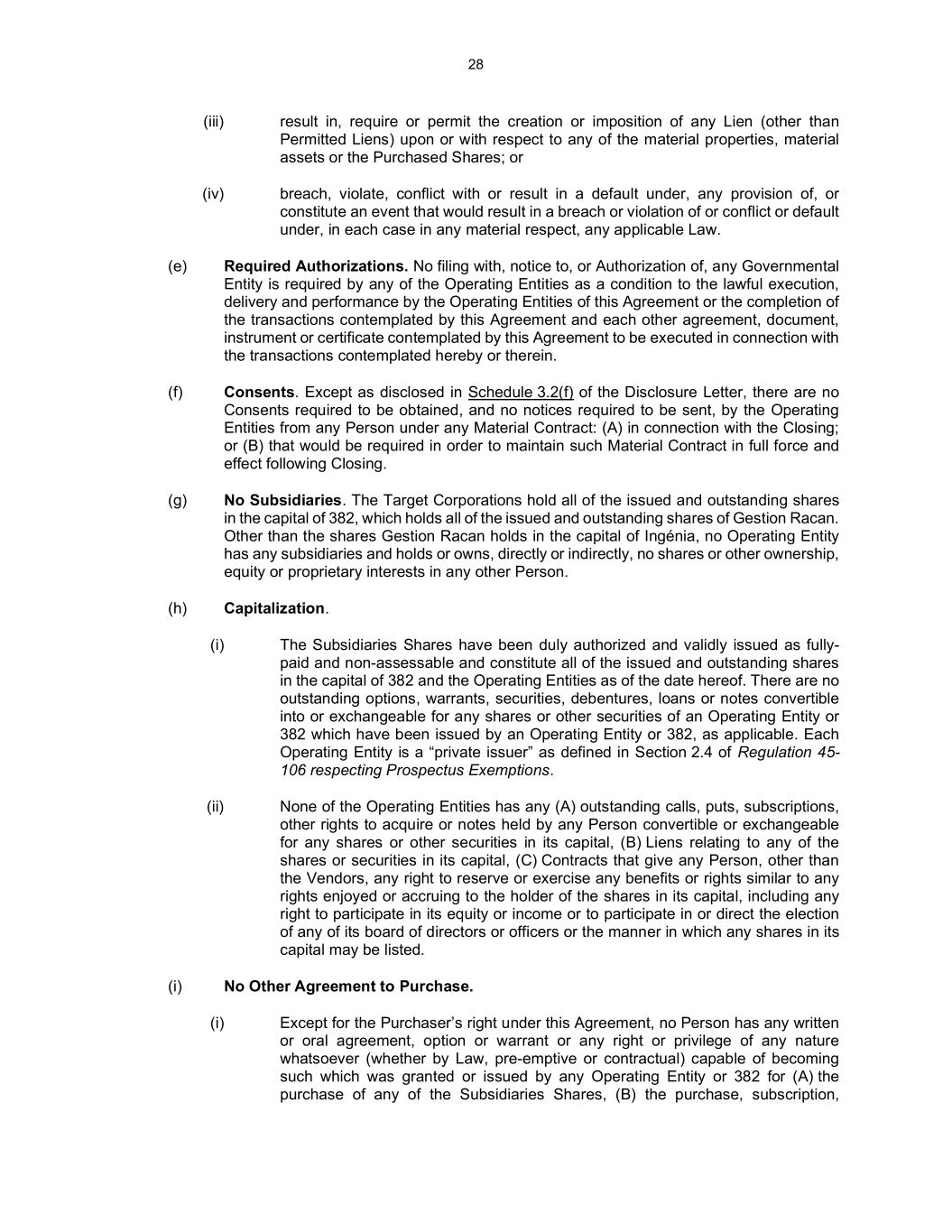 28 (iii) result in, require or permit the creation or imposition of any Lien (other than Permitted Liens) upon or with respect to any of the material properties, material assets or the Purchased Shares; or (iv) breach, violate, conflict with or result in a default under, any provision of, or constitute an event that would result in a breach or violation of or conflict or default under, in each case in any material respect, any applicable Law. (e) Required Authorizations. No filing with, notice to, or Authorization of, any Governmental Entity is required by any of the Operating Entities as a condition to the lawful execution, delivery and performance by the Operating Entities of this Agreement or the completion of the transactions contemplated by this Agreement and each other agreement, document, instrument or certificate contemplated by this Agreement to be executed in connection with the transactions contemplated hereby or therein. (f) Consents. Except as disclosed in Schedule 3.2(f) of the Disclosure Letter, there are no Consents required to be obtained, and no notices required to be sent, by the Operating Entities from any Person under any Material Contract: (A) in connection with the Closing; or (B) that would be required in order to maintain such Material Contract in full force and effect following Closing. (g) No Subsidiaries. The Target Corporations hold all of the issued and outstanding shares in the capital of 382, which holds all of the issued and outstanding shares of Gestion Racan. Other than the shares Gestion Racan holds in the capital of Ingénia, no Operating Entity has any subsidiaries and holds or owns, directly or indirectly, no shares or other ownership, equity or proprietary interests in any other Person. (h) Capitalization. (i) The Subsidiaries Shares have been duly authorized and validly issued as fully- paid and non-assessable and constitute all of the issued and outstanding shares in the capital of 382 and the Operating Entities as of the date hereof. There are no outstanding options, warrants, securities, debentures, loans or notes convertible into or exchangeable for any shares or other securities of an Operating Entity or 382 which have been issued by an Operating Entity or 382, as applicable. Each Operating Entity is a “private issuer” as defined in Section 2.4 of Regulation 45- 106 respecting Prospectus Exemptions. (ii) None of the Operating Entities has any (A) outstanding calls, puts, subscriptions, other rights to acquire or notes held by any Person convertible or exchangeable for any shares or other securities in its capital, (B) Liens relating to any of the shares or securities in its capital, (C) Contracts that give any Person, other than the Vendors, any right to reserve or exercise any benefits or rights similar to any rights enjoyed or accruing to the holder of the shares in its capital, including any right to participate in its equity or income or to participate in or direct the election of any of its board of directors or officers or the manner in which any shares in its capital may be listed. (i) No Other Agreement to Purchase. (i) Except for the Purchaser’s right under this Agreement, no Person has any written or oral agreement, option or warrant or any right or privilege of any nature whatsoever (whether by Law, pre-emptive or contractual) capable of becoming such which was granted or issued by any Operating Entity or 382 for (A) the purchase of any of the Subsidiaries Shares, (B) the purchase, subscription,