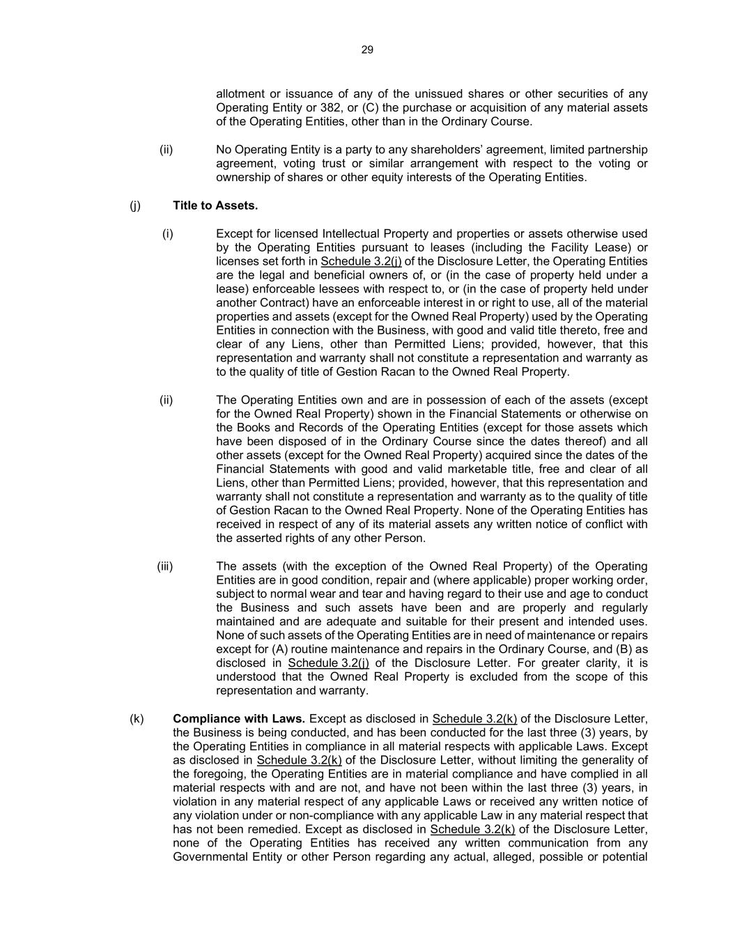 29 allotment or issuance of any of the unissued shares or other securities of any Operating Entity or 382, or (C) the purchase or acquisition of any material assets of the Operating Entities, other than in the Ordinary Course. (ii) No Operating Entity is a party to any shareholders’ agreement, limited partnership agreement, voting trust or similar arrangement with respect to the voting or ownership of shares or other equity interests of the Operating Entities. (j) Title to Assets. (i) Except for licensed Intellectual Property and properties or assets otherwise used by the Operating Entities pursuant to leases (including the Facility Lease) or licenses set forth in Schedule 3.2(j) of the Disclosure Letter, the Operating Entities are the legal and beneficial owners of, or (in the case of property held under a lease) enforceable lessees with respect to, or (in the case of property held under another Contract) have an enforceable interest in or right to use, all of the material properties and assets (except for the Owned Real Property) used by the Operating Entities in connection with the Business, with good and valid title thereto, free and clear of any Liens, other than Permitted Liens; provided, however, that this representation and warranty shall not constitute a representation and warranty as to the quality of title of Gestion Racan to the Owned Real Property. (ii) The Operating Entities own and are in possession of each of the assets (except for the Owned Real Property) shown in the Financial Statements or otherwise on the Books and Records of the Operating Entities (except for those assets which have been disposed of in the Ordinary Course since the dates thereof) and all other assets (except for the Owned Real Property) acquired since the dates of the Financial Statements with good and valid marketable title, free and clear of all Liens, other than Permitted Liens; provided, however, that this representation and warranty shall not constitute a representation and warranty as to the quality of title of Gestion Racan to the Owned Real Property. None of the Operating Entities has received in respect of any of its material assets any written notice of conflict with the asserted rights of any other Person. (iii) The assets (with the exception of the Owned Real Property) of the Operating Entities are in good condition, repair and (where applicable) proper working order, subject to normal wear and tear and having regard to their use and age to conduct the Business and such assets have been and are properly and regularly maintained and are adequate and suitable for their present and intended uses. None of such assets of the Operating Entities are in need of maintenance or repairs except for (A) routine maintenance and repairs in the Ordinary Course, and (B) as disclosed in Schedule 3.2(j) of the Disclosure Letter. For greater clarity, it is understood that the Owned Real Property is excluded from the scope of this representation and warranty. (k) Compliance with Laws. Except as disclosed in Schedule 3.2(k) of the Disclosure Letter, the Business is being conducted, and has been conducted for the last three (3) years, by the Operating Entities in compliance in all material respects with applicable Laws. Except as disclosed in Schedule 3.2(k) of the Disclosure Letter, without limiting the generality of the foregoing, the Operating Entities are in material compliance and have complied in all material respects with and are not, and have not been within the last three (3) years, in violation in any material respect of any applicable Laws or received any written notice of any violation under or non-compliance with any applicable Law in any material respect that has not been remedied. Except as disclosed in Schedule 3.2(k) of the Disclosure Letter, none of the Operating Entities has received any written communication from any Governmental Entity or other Person regarding any actual, alleged, possible or potential