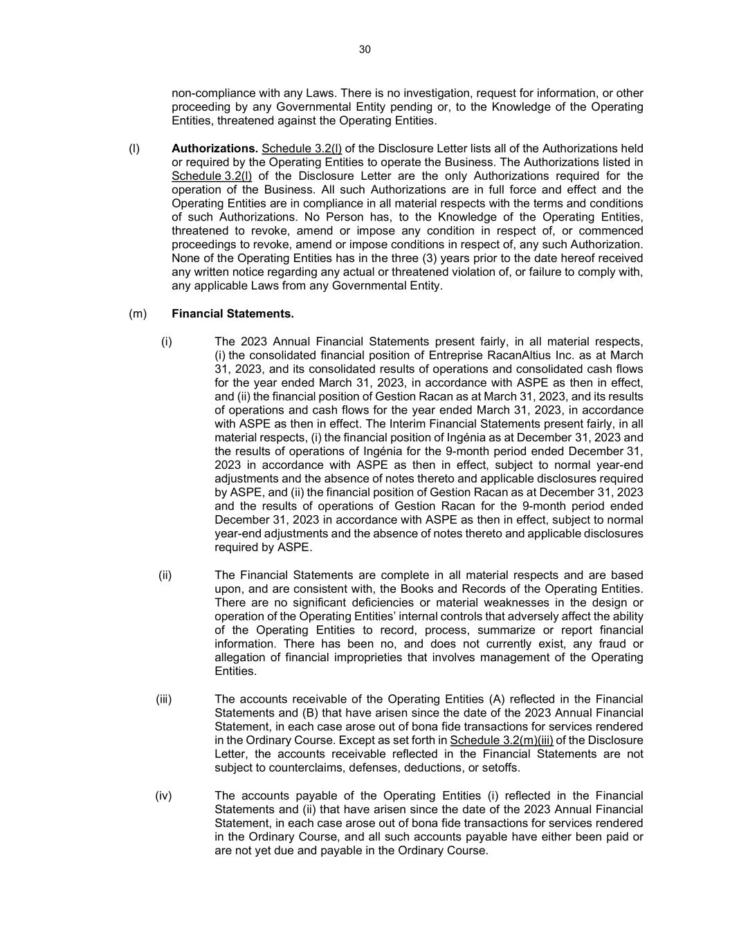 30 non-compliance with any Laws. There is no investigation, request for information, or other proceeding by any Governmental Entity pending or, to the Knowledge of the Operating Entities, threatened against the Operating Entities. (l) Authorizations. Schedule 3.2(l) of the Disclosure Letter lists all of the Authorizations held or required by the Operating Entities to operate the Business. The Authorizations listed in Schedule 3.2(l) of the Disclosure Letter are the only Authorizations required for the operation of the Business. All such Authorizations are in full force and effect and the Operating Entities are in compliance in all material respects with the terms and conditions of such Authorizations. No Person has, to the Knowledge of the Operating Entities, threatened to revoke, amend or impose any condition in respect of, or commenced proceedings to revoke, amend or impose conditions in respect of, any such Authorization. None of the Operating Entities has in the three (3) years prior to the date hereof received any written notice regarding any actual or threatened violation of, or failure to comply with, any applicable Laws from any Governmental Entity. (m) Financial Statements. (i) The 2023 Annual Financial Statements present fairly, in all material respects, (i) the consolidated financial position of Entreprise RacanAltius Inc. as at March 31, 2023, and its consolidated results of operations and consolidated cash flows for the year ended March 31, 2023, in accordance with ASPE as then in effect, and (ii) the financial position of Gestion Racan as at March 31, 2023, and its results of operations and cash flows for the year ended March 31, 2023, in accordance with ASPE as then in effect. The Interim Financial Statements present fairly, in all material respects, (i) the financial position of Ingénia as at December 31, 2023 and the results of operations of Ingénia for the 9-month period ended December 31, 2023 in accordance with ASPE as then in effect, subject to normal year-end adjustments and the absence of notes thereto and applicable disclosures required by ASPE, and (ii) the financial position of Gestion Racan as at December 31, 2023 and the results of operations of Gestion Racan for the 9-month period ended December 31, 2023 in accordance with ASPE as then in effect, subject to normal year-end adjustments and the absence of notes thereto and applicable disclosures required by ASPE. (ii) The Financial Statements are complete in all material respects and are based upon, and are consistent with, the Books and Records of the Operating Entities. There are no significant deficiencies or material weaknesses in the design or operation of the Operating Entities’ internal controls that adversely affect the ability of the Operating Entities to record, process, summarize or report financial information. There has been no, and does not currently exist, any fraud or allegation of financial improprieties that involves management of the Operating Entities. (iii) The accounts receivable of the Operating Entities (A) reflected in the Financial Statements and (B) that have arisen since the date of the 2023 Annual Financial Statement, in each case arose out of bona fide transactions for services rendered in the Ordinary Course. Except as set forth in Schedule 3.2(m)(iii) of the Disclosure Letter, the accounts receivable reflected in the Financial Statements are not subject to counterclaims, defenses, deductions, or setoffs. (iv) The accounts payable of the Operating Entities (i) reflected in the Financial Statements and (ii) that have arisen since the date of the 2023 Annual Financial Statement, in each case arose out of bona fide transactions for services rendered in the Ordinary Course, and all such accounts payable have either been paid or are not yet due and payable in the Ordinary Course.