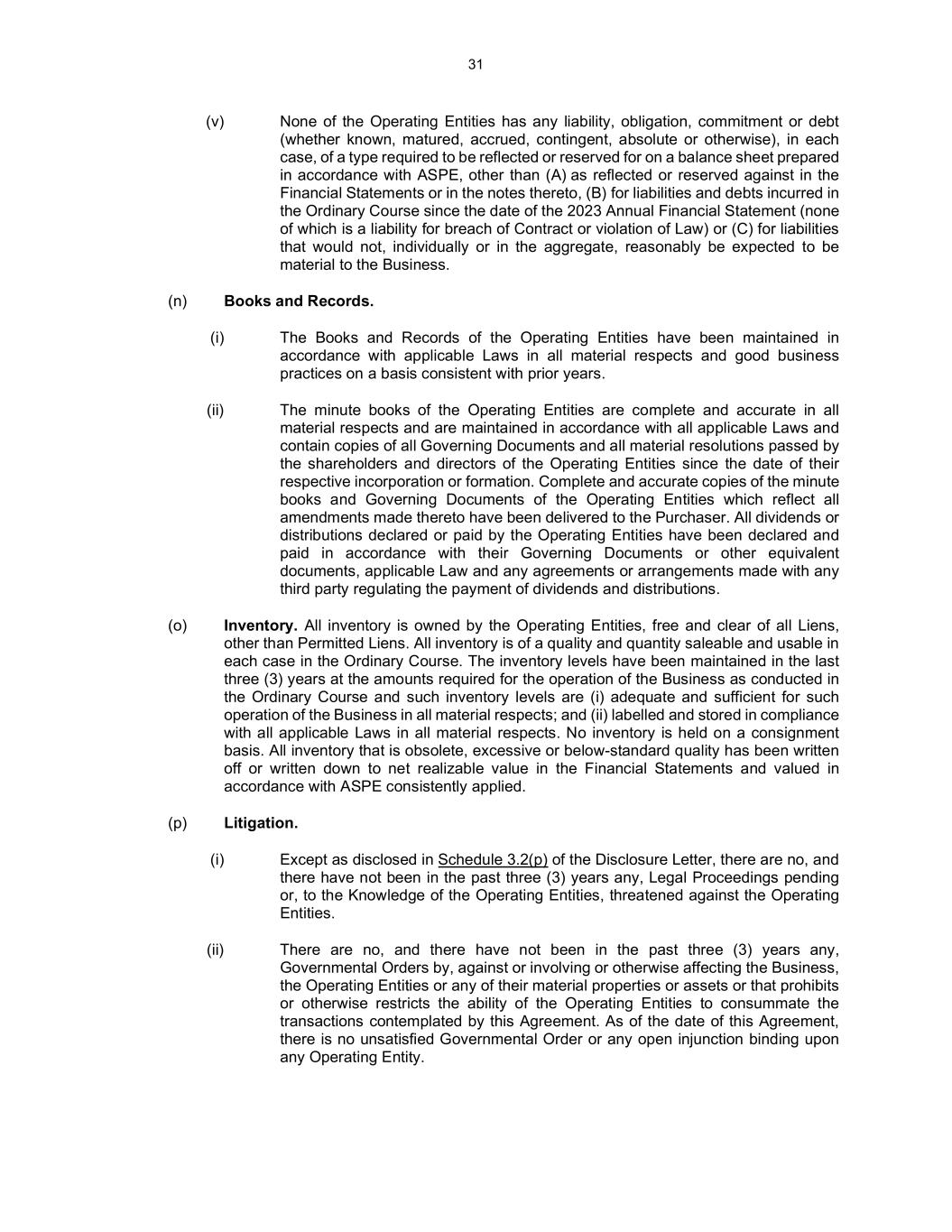 31 (v) None of the Operating Entities has any liability, obligation, commitment or debt (whether known, matured, accrued, contingent, absolute or otherwise), in each case, of a type required to be reflected or reserved for on a balance sheet prepared in accordance with ASPE, other than (A) as reflected or reserved against in the Financial Statements or in the notes thereto, (B) for liabilities and debts incurred in the Ordinary Course since the date of the 2023 Annual Financial Statement (none of which is a liability for breach of Contract or violation of Law) or (C) for liabilities that would not, individually or in the aggregate, reasonably be expected to be material to the Business. (n) Books and Records. (i) The Books and Records of the Operating Entities have been maintained in accordance with applicable Laws in all material respects and good business practices on a basis consistent with prior years. (ii) The minute books of the Operating Entities are complete and accurate in all material respects and are maintained in accordance with all applicable Laws and contain copies of all Governing Documents and all material resolutions passed by the shareholders and directors of the Operating Entities since the date of their respective incorporation or formation. Complete and accurate copies of the minute books and Governing Documents of the Operating Entities which reflect all amendments made thereto have been delivered to the Purchaser. All dividends or distributions declared or paid by the Operating Entities have been declared and paid in accordance with their Governing Documents or other equivalent documents, applicable Law and any agreements or arrangements made with any third party regulating the payment of dividends and distributions. (o) Inventory. All inventory is owned by the Operating Entities, free and clear of all Liens, other than Permitted Liens. All inventory is of a quality and quantity saleable and usable in each case in the Ordinary Course. The inventory levels have been maintained in the last three (3) years at the amounts required for the operation of the Business as conducted in the Ordinary Course and such inventory levels are (i) adequate and sufficient for such operation of the Business in all material respects; and (ii) labelled and stored in compliance with all applicable Laws in all material respects. No inventory is held on a consignment basis. All inventory that is obsolete, excessive or below-standard quality has been written off or written down to net realizable value in the Financial Statements and valued in accordance with ASPE consistently applied. (p) Litigation. (i) Except as disclosed in Schedule 3.2(p) of the Disclosure Letter, there are no, and there have not been in the past three (3) years any, Legal Proceedings pending or, to the Knowledge of the Operating Entities, threatened against the Operating Entities. (ii) There are no, and there have not been in the past three (3) years any, Governmental Orders by, against or involving or otherwise affecting the Business, the Operating Entities or any of their material properties or assets or that prohibits or otherwise restricts the ability of the Operating Entities to consummate the transactions contemplated by this Agreement. As of the date of this Agreement, there is no unsatisfied Governmental Order or any open injunction binding upon any Operating Entity.