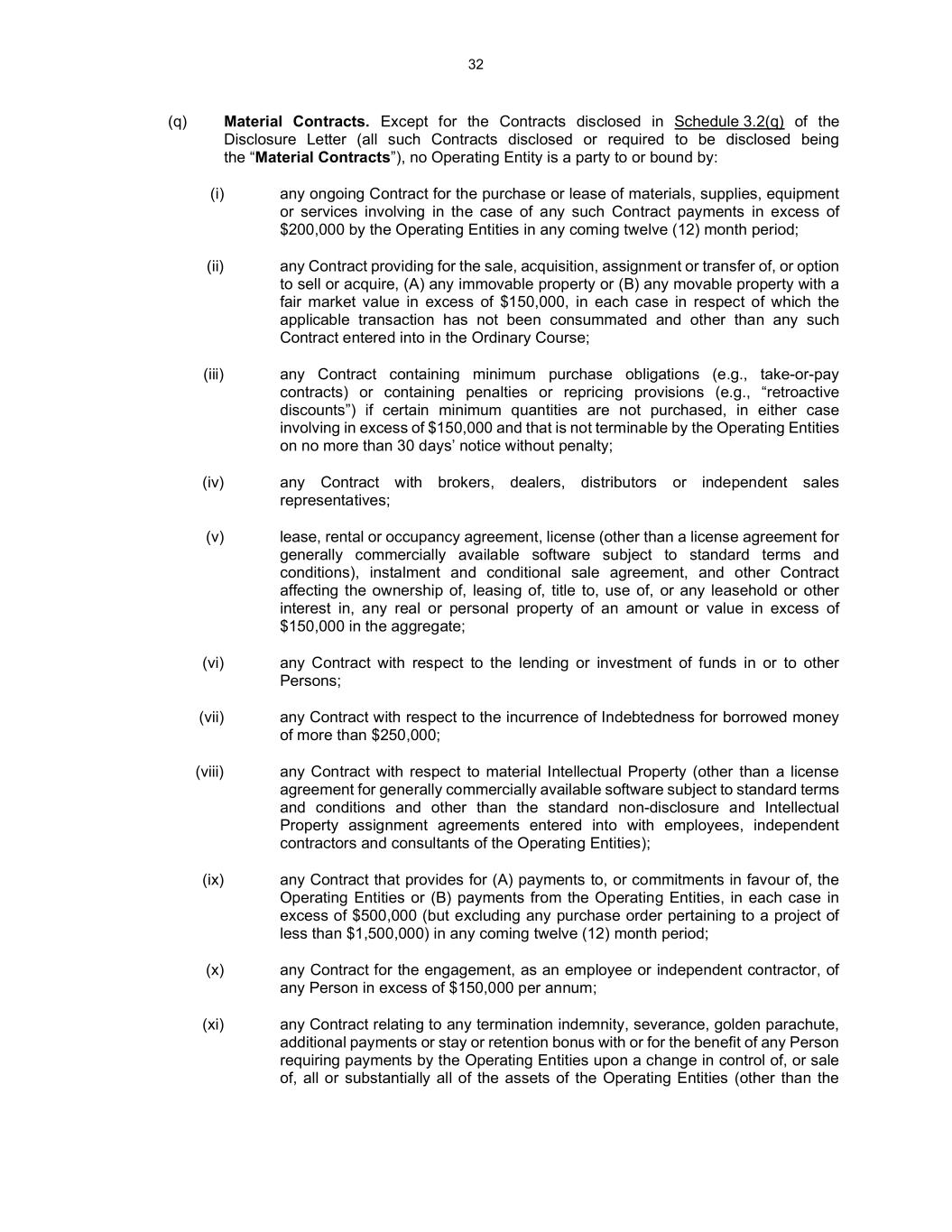 32 (q) Material Contracts. Except for the Contracts disclosed in Schedule 3.2(q) of the Disclosure Letter (all such Contracts disclosed or required to be disclosed being the “Material Contracts”), no Operating Entity is a party to or bound by: (i) any ongoing Contract for the purchase or lease of materials, supplies, equipment or services involving in the case of any such Contract payments in excess of $200,000 by the Operating Entities in any coming twelve (12) month period; (ii) any Contract providing for the sale, acquisition, assignment or transfer of, or option to sell or acquire, (A) any immovable property or (B) any movable property with a fair market value in excess of $150,000, in each case in respect of which the applicable transaction has not been consummated and other than any such Contract entered into in the Ordinary Course; (iii) any Contract containing minimum purchase obligations (e.g., take-or-pay contracts) or containing penalties or repricing provisions (e.g., “retroactive discounts”) if certain minimum quantities are not purchased, in either case involving in excess of $150,000 and that is not terminable by the Operating Entities on no more than 30 days’ notice without penalty; (iv) any Contract with brokers, dealers, distributors or independent sales representatives; (v) lease, rental or occupancy agreement, license (other than a license agreement for generally commercially available software subject to standard terms and conditions), instalment and conditional sale agreement, and other Contract affecting the ownership of, leasing of, title to, use of, or any leasehold or other interest in, any real or personal property of an amount or value in excess of $150,000 in the aggregate; (vi) any Contract with respect to the lending or investment of funds in or to other Persons; (vii) any Contract with respect to the incurrence of Indebtedness for borrowed money of more than $250,000; (viii) any Contract with respect to material Intellectual Property (other than a license agreement for generally commercially available software subject to standard terms and conditions and other than the standard non-disclosure and Intellectual Property assignment agreements entered into with employees, independent contractors and consultants of the Operating Entities); (ix) any Contract that provides for (A) payments to, or commitments in favour of, the Operating Entities or (B) payments from the Operating Entities, in each case in excess of $500,000 (but excluding any purchase order pertaining to a project of less than $1,500,000) in any coming twelve (12) month period; (x) any Contract for the engagement, as an employee or independent contractor, of any Person in excess of $150,000 per annum; (xi) any Contract relating to any termination indemnity, severance, golden parachute, additional payments or stay or retention bonus with or for the benefit of any Person requiring payments by the Operating Entities upon a change in control of, or sale of, all or substantially all of the assets of the Operating Entities (other than the