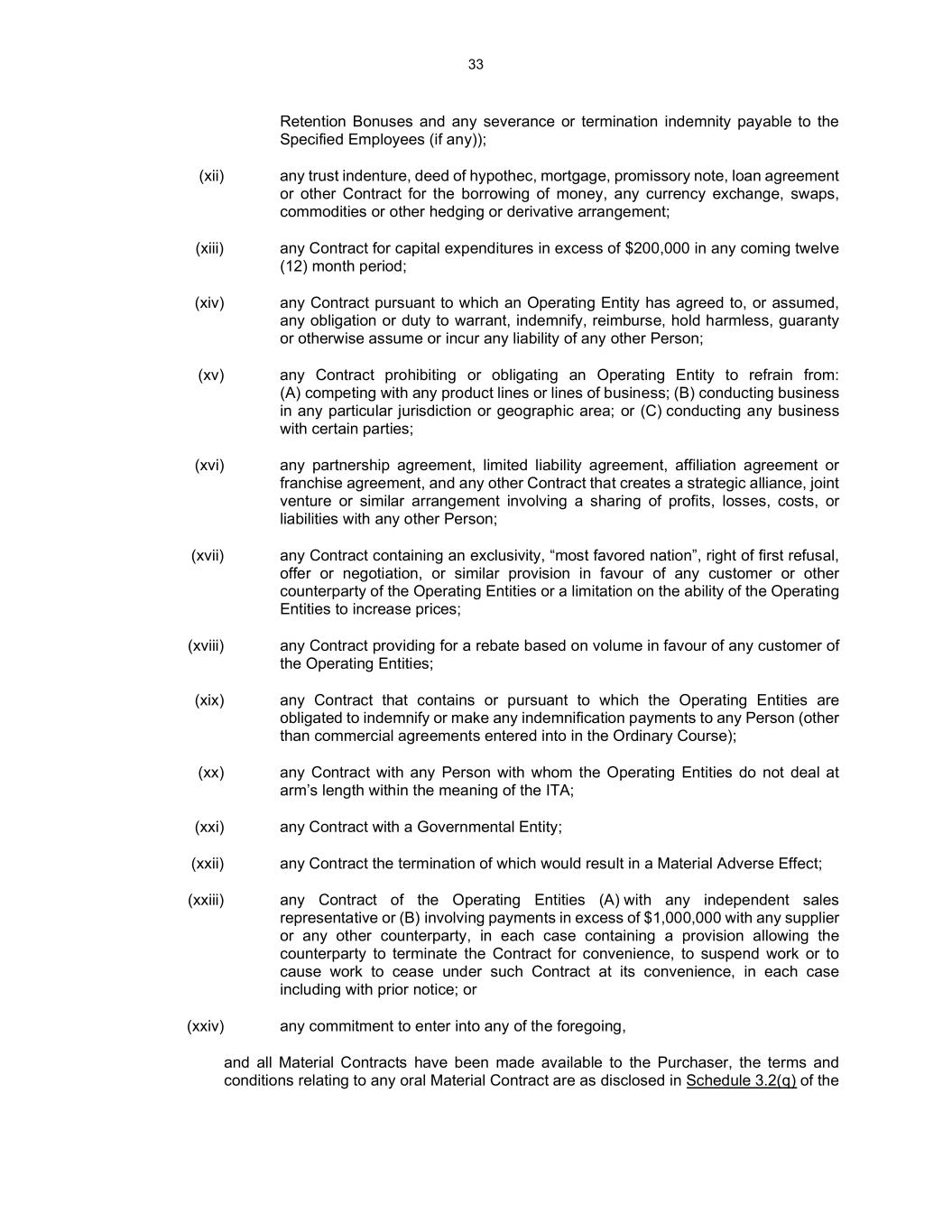 33 Retention Bonuses and any severance or termination indemnity payable to the Specified Employees (if any)); (xii) any trust indenture, deed of hypothec, mortgage, promissory note, loan agreement or other Contract for the borrowing of money, any currency exchange, swaps, commodities or other hedging or derivative arrangement; (xiii) any Contract for capital expenditures in excess of $200,000 in any coming twelve (12) month period; (xiv) any Contract pursuant to which an Operating Entity has agreed to, or assumed, any obligation or duty to warrant, indemnify, reimburse, hold harmless, guaranty or otherwise assume or incur any liability of any other Person; (xv) any Contract prohibiting or obligating an Operating Entity to refrain from: (A) competing with any product lines or lines of business; (B) conducting business in any particular jurisdiction or geographic area; or (C) conducting any business with certain parties; (xvi) any partnership agreement, limited liability agreement, affiliation agreement or franchise agreement, and any other Contract that creates a strategic alliance, joint venture or similar arrangement involving a sharing of profits, losses, costs, or liabilities with any other Person; (xvii) any Contract containing an exclusivity, “most favored nation”, right of first refusal, offer or negotiation, or similar provision in favour of any customer or other counterparty of the Operating Entities or a limitation on the ability of the Operating Entities to increase prices; (xviii) any Contract providing for a rebate based on volume in favour of any customer of the Operating Entities; (xix) any Contract that contains or pursuant to which the Operating Entities are obligated to indemnify or make any indemnification payments to any Person (other than commercial agreements entered into in the Ordinary Course); (xx) any Contract with any Person with whom the Operating Entities do not deal at arm’s length within the meaning of the ITA; (xxi) any Contract with a Governmental Entity; (xxii) any Contract the termination of which would result in a Material Adverse Effect; (xxiii) any Contract of the Operating Entities (A) with any independent sales representative or (B) involving payments in excess of $1,000,000 with any supplier or any other counterparty, in each case containing a provision allowing the counterparty to terminate the Contract for convenience, to suspend work or to cause work to cease under such Contract at its convenience, in each case including with prior notice; or (xxiv) any commitment to enter into any of the foregoing, and all Material Contracts have been made available to the Purchaser, the terms and conditions relating to any oral Material Contract are as disclosed in Schedule 3.2(q) of the