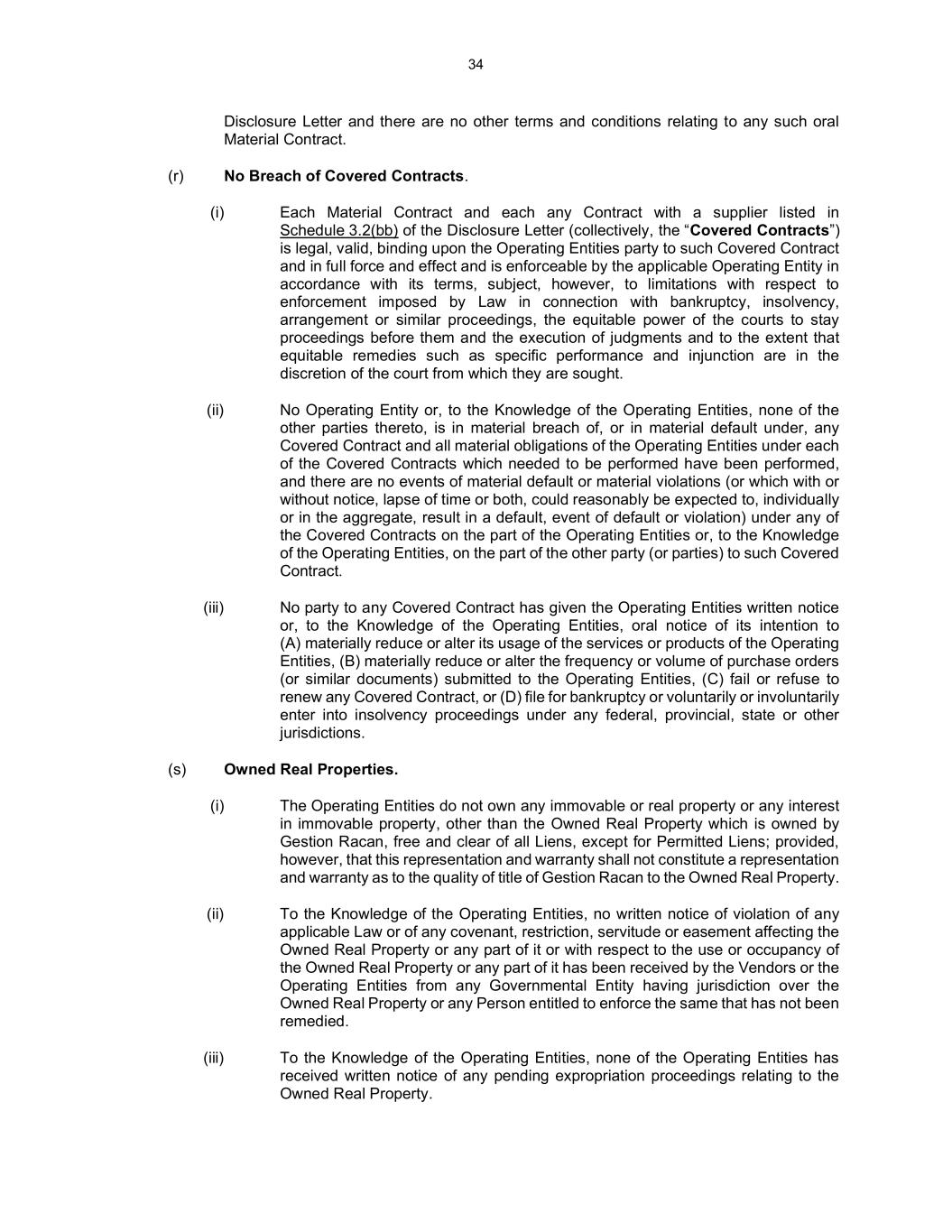 34 Disclosure Letter and there are no other terms and conditions relating to any such oral Material Contract. (r) No Breach of Covered Contracts. (i) Each Material Contract and each any Contract with a supplier listed in Schedule 3.2(bb) of the Disclosure Letter (collectively, the “Covered Contracts”) is legal, valid, binding upon the Operating Entities party to such Covered Contract and in full force and effect and is enforceable by the applicable Operating Entity in accordance with its terms, subject, however, to limitations with respect to enforcement imposed by Law in connection with bankruptcy, insolvency, arrangement or similar proceedings, the equitable power of the courts to stay proceedings before them and the execution of judgments and to the extent that equitable remedies such as specific performance and injunction are in the discretion of the court from which they are sought. (ii) No Operating Entity or, to the Knowledge of the Operating Entities, none of the other parties thereto, is in material breach of, or in material default under, any Covered Contract and all material obligations of the Operating Entities under each of the Covered Contracts which needed to be performed have been performed, and there are no events of material default or material violations (or which with or without notice, lapse of time or both, could reasonably be expected to, individually or in the aggregate, result in a default, event of default or violation) under any of the Covered Contracts on the part of the Operating Entities or, to the Knowledge of the Operating Entities, on the part of the other party (or parties) to such Covered Contract. (iii) No party to any Covered Contract has given the Operating Entities written notice or, to the Knowledge of the Operating Entities, oral notice of its intention to (A) materially reduce or alter its usage of the services or products of the Operating Entities, (B) materially reduce or alter the frequency or volume of purchase orders (or similar documents) submitted to the Operating Entities, (C) fail or refuse to renew any Covered Contract, or (D) file for bankruptcy or voluntarily or involuntarily enter into insolvency proceedings under any federal, provincial, state or other jurisdictions. (s) Owned Real Properties. (i) The Operating Entities do not own any immovable or real property or any interest in immovable property, other than the Owned Real Property which is owned by Gestion Racan, free and clear of all Liens, except for Permitted Liens; provided, however, that this representation and warranty shall not constitute a representation and warranty as to the quality of title of Gestion Racan to the Owned Real Property. (ii) To the Knowledge of the Operating Entities, no written notice of violation of any applicable Law or of any covenant, restriction, servitude or easement affecting the Owned Real Property or any part of it or with respect to the use or occupancy of the Owned Real Property or any part of it has been received by the Vendors or the Operating Entities from any Governmental Entity having jurisdiction over the Owned Real Property or any Person entitled to enforce the same that has not been remedied. (iii) To the Knowledge of the Operating Entities, none of the Operating Entities has received written notice of any pending expropriation proceedings relating to the Owned Real Property.