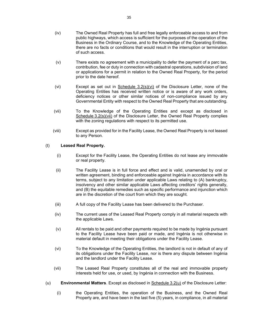 35 (iv) The Owned Real Property has full and free legally enforceable access to and from public highways, which access is sufficient for the purposes of the operation of the Business in the Ordinary Course, and to the Knowledge of the Operating Entities, there are no facts or conditions that would result in the interruption or termination of such access. (v) There exists no agreement with a municipality to defer the payment of a parc tax, contribution, fee or duty in connection with cadastral operations, subdivision of land or applications for a permit in relation to the Owned Real Property, for the period prior to the date hereof. (vi) Except as set out in Schedule 3.2(s)(vi) of the Disclosure Letter, none of the Operating Entities has received written notice or is aware of any work orders, deficiency notices or other similar notices of non-compliance issued by any Governmental Entity with respect to the Owned Real Property that are outstanding. (vii) To the Knowledge of the Operating Entities and except as disclosed in Schedule 3.2(s)(vii) of the Disclosure Letter, the Owned Real Property complies with the zoning regulations with respect to its permitted use. (viii) Except as provided for in the Facility Lease, the Owned Real Property is not leased to any Person. (t) Leased Real Property. (i) Except for the Facility Lease, the Operating Entities do not lease any immovable or real property. (ii) The Facility Lease is in full force and effect and is valid, unamended by oral or written agreement, binding and enforceable against Ingénia in accordance with its terms, subject to any limitation under applicable Laws relating to (A) bankruptcy, insolvency and other similar applicable Laws affecting creditors’ rights generally, and (B) the equitable remedies such as specific performance and injunction which are in the discretion of the court from which they are sought. (iii) A full copy of the Facility Lease has been delivered to the Purchaser. (iv) The current uses of the Leased Real Property comply in all material respects with the applicable Laws. (v) All rentals to be paid and other payments required to be made by Ingénia pursuant to the Facility Lease have been paid or made, and Ingénia is not otherwise in material default in meeting their obligations under the Facility Lease. (vi) To the Knowledge of the Operating Entities, the landlord is not in default of any of its obligations under the Facility Lease, nor is there any dispute between Ingénia and the landlord under the Facility Lease. (vii) The Leased Real Property constitutes all of the real and immovable property interests held for use, or used, by Ingénia in connection with the Business. (u) Environmental Matters. Except as disclosed in Schedule 3.2(u) of the Disclosure Letter: (i) the Operating Entities, the operation of the Business, and the Owned Real Property are, and have been in the last five (5) years, in compliance, in all material
