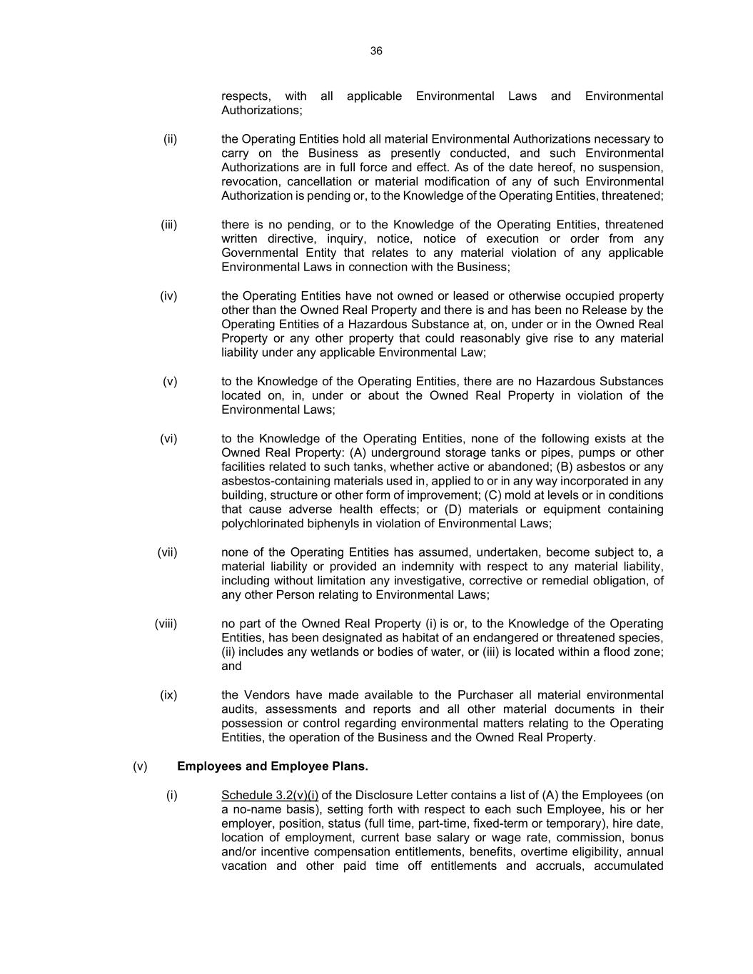 36 respects, with all applicable Environmental Laws and Environmental Authorizations; (ii) the Operating Entities hold all material Environmental Authorizations necessary to carry on the Business as presently conducted, and such Environmental Authorizations are in full force and effect. As of the date hereof, no suspension, revocation, cancellation or material modification of any of such Environmental Authorization is pending or, to the Knowledge of the Operating Entities, threatened; (iii) there is no pending, or to the Knowledge of the Operating Entities, threatened written directive, inquiry, notice, notice of execution or order from any Governmental Entity that relates to any material violation of any applicable Environmental Laws in connection with the Business; (iv) the Operating Entities have not owned or leased or otherwise occupied property other than the Owned Real Property and there is and has been no Release by the Operating Entities of a Hazardous Substance at, on, under or in the Owned Real Property or any other property that could reasonably give rise to any material liability under any applicable Environmental Law; (v) to the Knowledge of the Operating Entities, there are no Hazardous Substances located on, in, under or about the Owned Real Property in violation of the Environmental Laws; (vi) to the Knowledge of the Operating Entities, none of the following exists at the Owned Real Property: (A) underground storage tanks or pipes, pumps or other facilities related to such tanks, whether active or abandoned; (B) asbestos or any asbestos-containing materials used in, applied to or in any way incorporated in any building, structure or other form of improvement; (C) mold at levels or in conditions that cause adverse health effects; or (D) materials or equipment containing polychlorinated biphenyls in violation of Environmental Laws; (vii) none of the Operating Entities has assumed, undertaken, become subject to, a material liability or provided an indemnity with respect to any material liability, including without limitation any investigative, corrective or remedial obligation, of any other Person relating to Environmental Laws; (viii) no part of the Owned Real Property (i) is or, to the Knowledge of the Operating Entities, has been designated as habitat of an endangered or threatened species, (ii) includes any wetlands or bodies of water, or (iii) is located within a flood zone; and (ix) the Vendors have made available to the Purchaser all material environmental audits, assessments and reports and all other material documents in their possession or control regarding environmental matters relating to the Operating Entities, the operation of the Business and the Owned Real Property. (v) Employees and Employee Plans. (i) Schedule 3.2(v)(i) of the Disclosure Letter contains a list of (A) the Employees (on a no-name basis), setting forth with respect to each such Employee, his or her employer, position, status (full time, part-time, fixed-term or temporary), hire date, location of employment, current base salary or wage rate, commission, bonus and/or incentive compensation entitlements, benefits, overtime eligibility, annual vacation and other paid time off entitlements and accruals, accumulated