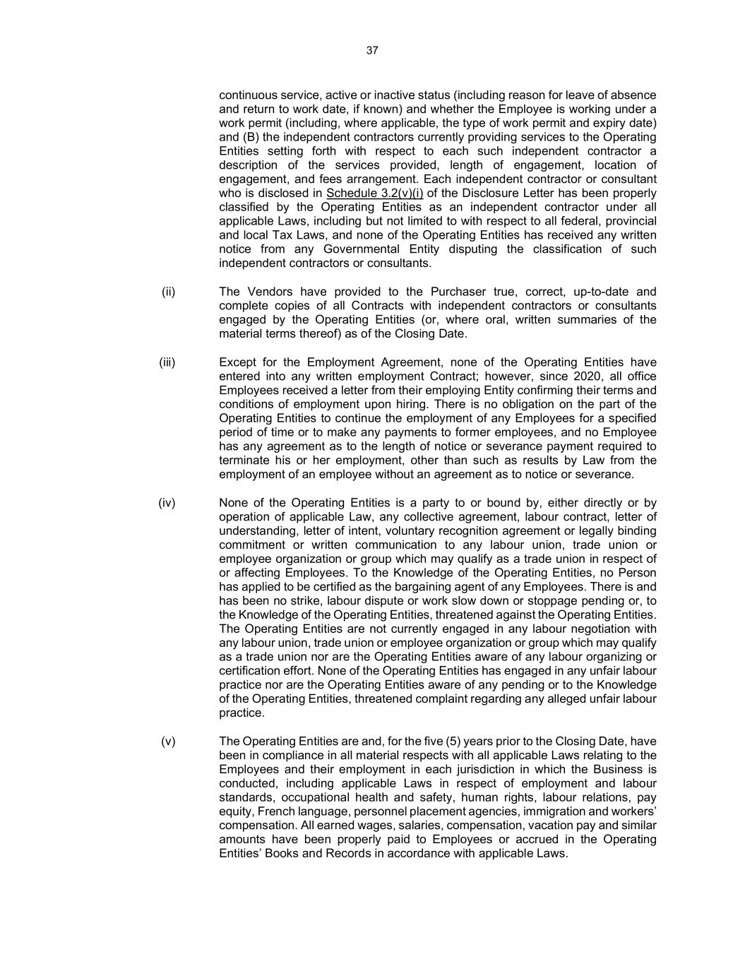 37 continuous service, active or inactive status (including reason for leave of absence and return to work date, if known) and whether the Employee is working under a work permit (including, where applicable, the type of work permit and expiry date) and (B) the independent contractors currently providing services to the Operating Entities setting forth with respect to each such independent contractor a description of the services provided, length of engagement, location of engagement, and fees arrangement. Each independent contractor or consultant who is disclosed in Schedule 3.2(v)(i) of the Disclosure Letter has been properly classified by the Operating Entities as an independent contractor under all applicable Laws, including but not limited to with respect to all federal, provincial and local Tax Laws, and none of the Operating Entities has received any written notice from any Governmental Entity disputing the classification of such independent contractors or consultants. (ii) The Vendors have provided to the Purchaser true, correct, up-to-date and complete copies of all Contracts with independent contractors or consultants engaged by the Operating Entities (or, where oral, written summaries of the material terms thereof) as of the Closing Date. (iii) Except for the Employment Agreement, none of the Operating Entities have entered into any written employment Contract; however, since 2020, all office Employees received a letter from their employing Entity confirming their terms and conditions of employment upon hiring. There is no obligation on the part of the Operating Entities to continue the employment of any Employees for a specified period of time or to make any payments to former employees, and no Employee has any agreement as to the length of notice or severance payment required to terminate his or her employment, other than such as results by Law from the employment of an employee without an agreement as to notice or severance. (iv) None of the Operating Entities is a party to or bound by, either directly or by operation of applicable Law, any collective agreement, labour contract, letter of understanding, letter of intent, voluntary recognition agreement or legally binding commitment or written communication to any labour union, trade union or employee organization or group which may qualify as a trade union in respect of or affecting Employees. To the Knowledge of the Operating Entities, no Person has applied to be certified as the bargaining agent of any Employees. There is and has been no strike, labour dispute or work slow down or stoppage pending or, to the Knowledge of the Operating Entities, threatened against the Operating Entities. The Operating Entities are not currently engaged in any labour negotiation with any labour union, trade union or employee organization or group which may qualify as a trade union nor are the Operating Entities aware of any labour organizing or certification effort. None of the Operating Entities has engaged in any unfair labour practice nor are the Operating Entities aware of any pending or to the Knowledge of the Operating Entities, threatened complaint regarding any alleged unfair labour practice. (v) The Operating Entities are and, for the five (5) years prior to the Closing Date, have been in compliance in all material respects with all applicable Laws relating to the Employees and their employment in each jurisdiction in which the Business is conducted, including applicable Laws in respect of employment and labour standards, occupational health and safety, human rights, labour relations, pay equity, French language, personnel placement agencies, immigration and workers’ compensation. All earned wages, salaries, compensation, vacation pay and similar amounts have been properly paid to Employees or accrued in the Operating Entities’ Books and Records in accordance with applicable Laws.