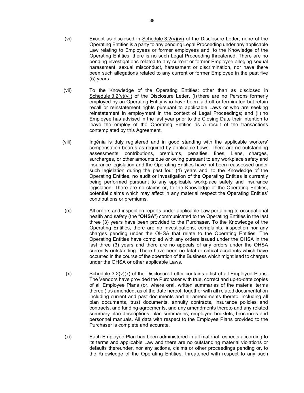 38 (vi) Except as disclosed in Schedule 3.2(v)(vi) of the Disclosure Letter, none of the Operating Entities is a party to any pending Legal Proceeding under any applicable Law relating to Employees or former employees and, to the Knowledge of the Operating Entities, there is no such Legal Proceeding threatened. There are no pending investigations related to any current or former Employee alleging sexual harassment, sexual misconduct, harassment or discrimination, nor have there been such allegations related to any current or former Employee in the past five (5) years. (vii) To the Knowledge of the Operating Entities: other than as disclosed in Schedule 3.2(v)(vii) of the Disclosure Letter, (i) there are no Persons formerly employed by an Operating Entity who have been laid off or terminated but retain recall or reinstatement rights pursuant to applicable Laws or who are seeking reinstatement in employment in the context of Legal Proceedings; and (ii) no Employee has advised in the last year prior to the Closing Date their intention to leave the employ of the Operating Entities as a result of the transactions contemplated by this Agreement. (viii) Ingénia is duly registered and in good standing with the applicable workers’ compensation boards as required by applicable Laws. There are no outstanding assessments, contributions, premiums, penalties, fines, Liens, charges, surcharges, or other amounts due or owing pursuant to any workplace safety and insurance legislation and the Operating Entities have not been reassessed under such legislation during the past four (4) years and, to the Knowledge of the Operating Entities, no audit or investigation of the Operating Entities is currently being performed pursuant to any applicable workplace safety and insurance legislation. There are no claims or, to the Knowledge of the Operating Entities, potential claims which may affect in any material respect the Operating Entities’ contributions or premiums. (ix) All orders and inspection reports under applicable Law pertaining to occupational health and safety (the “OHSA”) communicated to the Operating Entities in the last three (3) years have been provided to the Purchaser. To the Knowledge of the Operating Entities, there are no investigations, complaints, inspection nor any charges pending under the OHSA that relate to the Operating Entities. The Operating Entities have complied with any orders issued under the OHSA in the last three (3) years and there are no appeals of any orders under the OHSA currently outstanding. There have been no fatal or critical accidents which have occurred in the course of the operation of the Business which might lead to charges under the OHSA or other applicable Laws. (x) Schedule 3.2(v)(x) of the Disclosure Letter contains a list of all Employee Plans. The Vendors have provided the Purchaser with true, correct and up-to-date copies of all Employee Plans (or, where oral, written summaries of the material terms thereof) as amended, as of the date hereof, together with all related documentation including current and past documents and all amendments thereto, including all plan documents, trust documents, annuity contracts, insurance policies and contracts, and funding agreements, and any amendments thereto and any related summary plan descriptions, plan summaries, employee booklets, brochures and personnel manuals. All data with respect to the Employee Plans provided to the Purchaser is complete and accurate. (xi) Each Employee Plan has been administered in all material respects according to its terms and applicable Law and there are no outstanding material violations or defaults thereunder, nor any actions, claims or other proceedings pending or, to the Knowledge of the Operating Entities, threatened with respect to any such