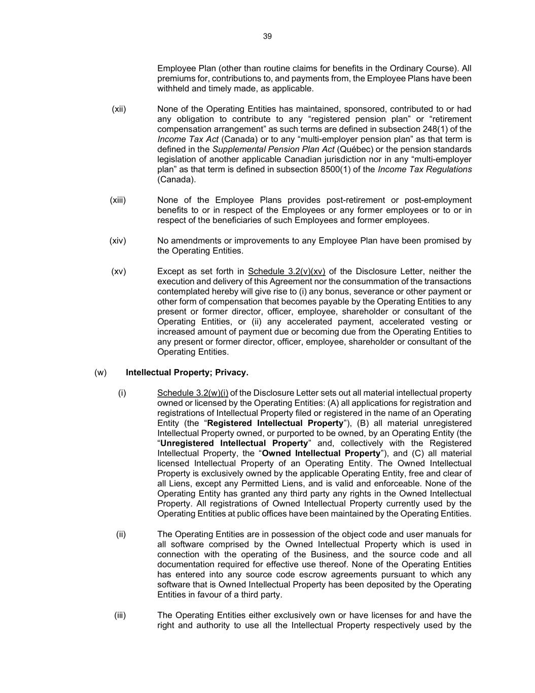 39 Employee Plan (other than routine claims for benefits in the Ordinary Course). All premiums for, contributions to, and payments from, the Employee Plans have been withheld and timely made, as applicable. (xii) None of the Operating Entities has maintained, sponsored, contributed to or had any obligation to contribute to any “registered pension plan” or “retirement compensation arrangement” as such terms are defined in subsection 248(1) of the Income Tax Act (Canada) or to any “multi-employer pension plan” as that term is defined in the Supplemental Pension Plan Act (Québec) or the pension standards legislation of another applicable Canadian jurisdiction nor in any “multi-employer plan” as that term is defined in subsection 8500(1) of the Income Tax Regulations (Canada). (xiii) None of the Employee Plans provides post-retirement or post-employment benefits to or in respect of the Employees or any former employees or to or in respect of the beneficiaries of such Employees and former employees. (xiv) No amendments or improvements to any Employee Plan have been promised by the Operating Entities. (xv) Except as set forth in Schedule 3.2(v)(xv) of the Disclosure Letter, neither the execution and delivery of this Agreement nor the consummation of the transactions contemplated hereby will give rise to (i) any bonus, severance or other payment or other form of compensation that becomes payable by the Operating Entities to any present or former director, officer, employee, shareholder or consultant of the Operating Entities, or (ii) any accelerated payment, accelerated vesting or increased amount of payment due or becoming due from the Operating Entities to any present or former director, officer, employee, shareholder or consultant of the Operating Entities. (w) Intellectual Property; Privacy. (i) Schedule 3.2(w)(i) of the Disclosure Letter sets out all material intellectual property owned or licensed by the Operating Entities: (A) all applications for registration and registrations of Intellectual Property filed or registered in the name of an Operating Entity (the “Registered Intellectual Property”), (B) all material unregistered Intellectual Property owned, or purported to be owned, by an Operating Entity (the “Unregistered Intellectual Property” and, collectively with the Registered Intellectual Property, the “Owned Intellectual Property”), and (C) all material licensed Intellectual Property of an Operating Entity. The Owned Intellectual Property is exclusively owned by the applicable Operating Entity, free and clear of all Liens, except any Permitted Liens, and is valid and enforceable. None of the Operating Entity has granted any third party any rights in the Owned Intellectual Property. All registrations of Owned Intellectual Property currently used by the Operating Entities at public offices have been maintained by the Operating Entities. (ii) The Operating Entities are in possession of the object code and user manuals for all software comprised by the Owned Intellectual Property which is used in connection with the operating of the Business, and the source code and all documentation required for effective use thereof. None of the Operating Entities has entered into any source code escrow agreements pursuant to which any software that is Owned Intellectual Property has been deposited by the Operating Entities in favour of a third party. (iii) The Operating Entities either exclusively own or have licenses for and have the right and authority to use all the Intellectual Property respectively used by the