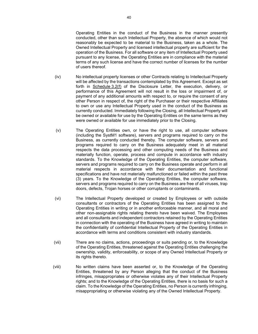 40 Operating Entities in the conduct of the Business in the manner presently conducted, other than such Intellectual Property, the absence of which would not reasonably be expected to be material to the Business, taken as a whole. The Owned Intellectual Property and licensed intellectual property are sufficient for the operation of the Business. For all software or any item of Intellectual Property used pursuant to any license, the Operating Entities are in compliance with the material terms of any such license and have the correct number of licenses for the number of users thereof. (iv) No intellectual property licenses or other Contracts relating to Intellectual Property will be affected by the transactions contemplated by this Agreement. Except as set forth in Schedule 3.2(f) of the Disclosure Letter, the execution, delivery, or performance of this Agreement will not result in the loss or impairment of, or payment of any additional amounts with respect to, or require the consent of any other Person in respect of, the right of the Purchaser or their respective Affiliates to own or use any Intellectual Property used in the conduct of the Business as currently conducted. Immediately following the Closing, all Intellectual Property will be owned or available for use by the Operating Entities on the same terms as they were owned or available for use immediately prior to the Closing. (v) The Operating Entities own, or have the right to use, all computer software (including the SystM1 software), servers and programs required to carry on the Business, as currently conducted thereby. The computer software, servers and programs required to carry on the Business adequately meet in all material respects the data processing and other computing needs of the Business and materially function, operate, process and compute in accordance with industry standards. To the Knowledge of the Operating Entities, the computer software, servers and programs required to carry on the Business operate and perform in all material respects in accordance with their documentation and functional specifications and have not materially malfunctioned or failed within the past three (3) years. To the Knowledge of the Operating Entities, the computer software, servers and programs required to carry on the Business are free of all viruses, trap doors, defects, Trojan horses or other corruptants or contaminants. (vi) The Intellectual Property developed or created by Employees or with outside consultants or contractors of the Operating Entities has been assigned to the Operating Entities in writing or in another enforceable manner, and all moral and other non-assignable rights relating thereto have been waived. The Employees and all consultants and independent contractors retained by the Operating Entities in connection with the operating of the Business have agreed in writing to maintain the confidentiality of confidential Intellectual Property of the Operating Entities in accordance with terms and conditions consistent with industry standards. (vii) There are no claims, actions, proceedings or suits pending or, to the Knowledge of the Operating Entities, threatened against the Operating Entities challenging the ownership, validity, enforceability, or scope of any Owned Intellectual Property or its rights thereto. (viii) No written claims have been asserted or, to the Knowledge of the Operating Entities, threatened by any Person alleging that the conduct of the Business infringes, misappropriates or otherwise violates any of their Intellectual Property rights; and to the Knowledge of the Operating Entities, there is no basis for such a claim. To the Knowledge of the Operating Entities, no Person is currently infringing, misappropriating or otherwise violating any of the Owned Intellectual Property.