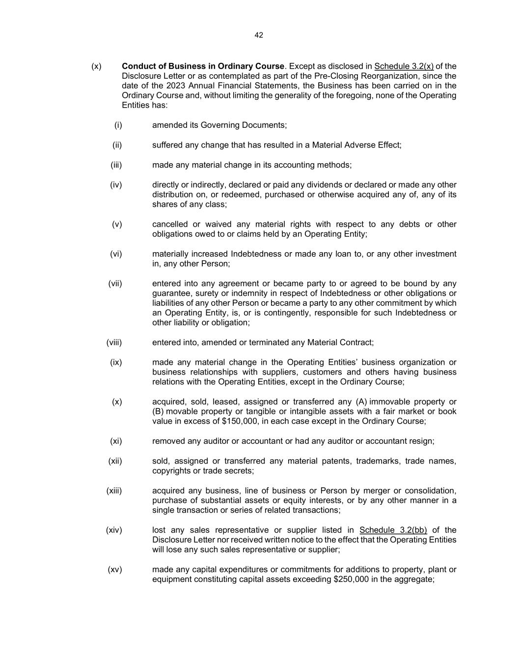 42 (x) Conduct of Business in Ordinary Course. Except as disclosed in Schedule 3.2(x) of the Disclosure Letter or as contemplated as part of the Pre-Closing Reorganization, since the date of the 2023 Annual Financial Statements, the Business has been carried on in the Ordinary Course and, without limiting the generality of the foregoing, none of the Operating Entities has: (i) amended its Governing Documents; (ii) suffered any change that has resulted in a Material Adverse Effect; (iii) made any material change in its accounting methods; (iv) directly or indirectly, declared or paid any dividends or declared or made any other distribution on, or redeemed, purchased or otherwise acquired any of, any of its shares of any class; (v) cancelled or waived any material rights with respect to any debts or other obligations owed to or claims held by an Operating Entity; (vi) materially increased Indebtedness or made any loan to, or any other investment in, any other Person; (vii) entered into any agreement or became party to or agreed to be bound by any guarantee, surety or indemnity in respect of Indebtedness or other obligations or liabilities of any other Person or became a party to any other commitment by which an Operating Entity, is, or is contingently, responsible for such Indebtedness or other liability or obligation; (viii) entered into, amended or terminated any Material Contract; (ix) made any material change in the Operating Entities’ business organization or business relationships with suppliers, customers and others having business relations with the Operating Entities, except in the Ordinary Course; (x) acquired, sold, leased, assigned or transferred any (A) immovable property or (B) movable property or tangible or intangible assets with a fair market or book value in excess of $150,000, in each case except in the Ordinary Course; (xi) removed any auditor or accountant or had any auditor or accountant resign; (xii) sold, assigned or transferred any material patents, trademarks, trade names, copyrights or trade secrets; (xiii) acquired any business, line of business or Person by merger or consolidation, purchase of substantial assets or equity interests, or by any other manner in a single transaction or series of related transactions; (xiv) lost any sales representative or supplier listed in Schedule 3.2(bb) of the Disclosure Letter nor received written notice to the effect that the Operating Entities will lose any such sales representative or supplier; (xv) made any capital expenditures or commitments for additions to property, plant or equipment constituting capital assets exceeding $250,000 in the aggregate;