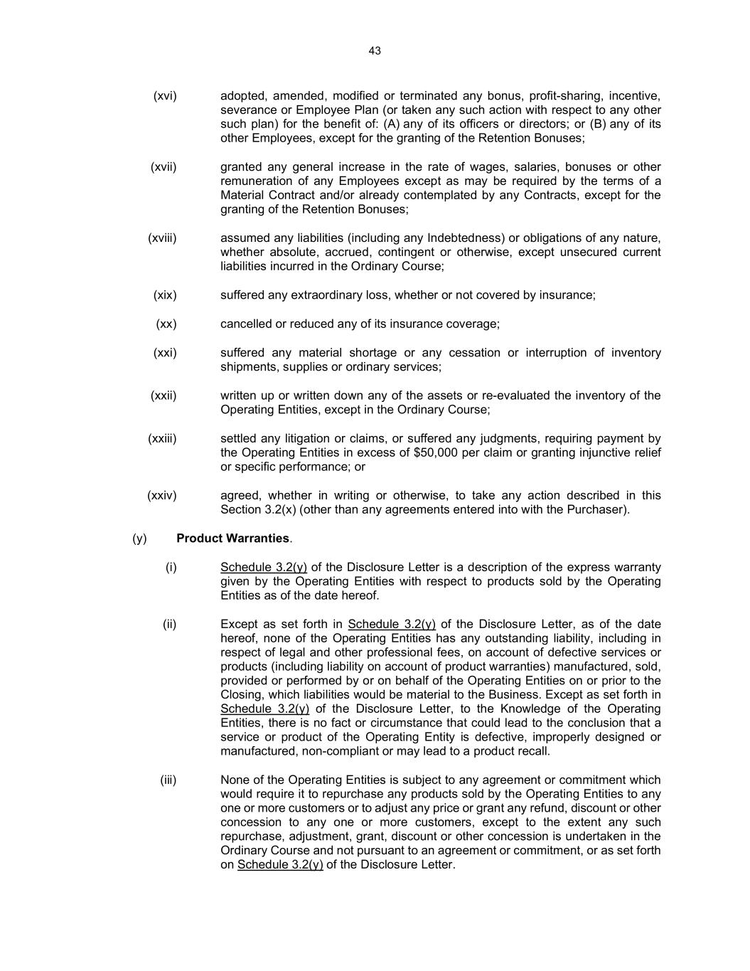 43 (xvi) adopted, amended, modified or terminated any bonus, profit-sharing, incentive, severance or Employee Plan (or taken any such action with respect to any other such plan) for the benefit of: (A) any of its officers or directors; or (B) any of its other Employees, except for the granting of the Retention Bonuses; (xvii) granted any general increase in the rate of wages, salaries, bonuses or other remuneration of any Employees except as may be required by the terms of a Material Contract and/or already contemplated by any Contracts, except for the granting of the Retention Bonuses; (xviii) assumed any liabilities (including any Indebtedness) or obligations of any nature, whether absolute, accrued, contingent or otherwise, except unsecured current liabilities incurred in the Ordinary Course; (xix) suffered any extraordinary loss, whether or not covered by insurance; (xx) cancelled or reduced any of its insurance coverage; (xxi) suffered any material shortage or any cessation or interruption of inventory shipments, supplies or ordinary services; (xxii) written up or written down any of the assets or re-evaluated the inventory of the Operating Entities, except in the Ordinary Course; (xxiii) settled any litigation or claims, or suffered any judgments, requiring payment by the Operating Entities in excess of $50,000 per claim or granting injunctive relief or specific performance; or (xxiv) agreed, whether in writing or otherwise, to take any action described in this Section 3.2(x) (other than any agreements entered into with the Purchaser). (y) Product Warranties. (i) Schedule 3.2(y) of the Disclosure Letter is a description of the express warranty given by the Operating Entities with respect to products sold by the Operating Entities as of the date hereof. (ii) Except as set forth in Schedule 3.2(y) of the Disclosure Letter, as of the date hereof, none of the Operating Entities has any outstanding liability, including in respect of legal and other professional fees, on account of defective services or products (including liability on account of product warranties) manufactured, sold, provided or performed by or on behalf of the Operating Entities on or prior to the Closing, which liabilities would be material to the Business. Except as set forth in Schedule 3.2(y) of the Disclosure Letter, to the Knowledge of the Operating Entities, there is no fact or circumstance that could lead to the conclusion that a service or product of the Operating Entity is defective, improperly designed or manufactured, non-compliant or may lead to a product recall. (iii) None of the Operating Entities is subject to any agreement or commitment which would require it to repurchase any products sold by the Operating Entities to any one or more customers or to adjust any price or grant any refund, discount or other concession to any one or more customers, except to the extent any such repurchase, adjustment, grant, discount or other concession is undertaken in the Ordinary Course and not pursuant to an agreement or commitment, or as set forth on Schedule 3.2(y) of the Disclosure Letter.