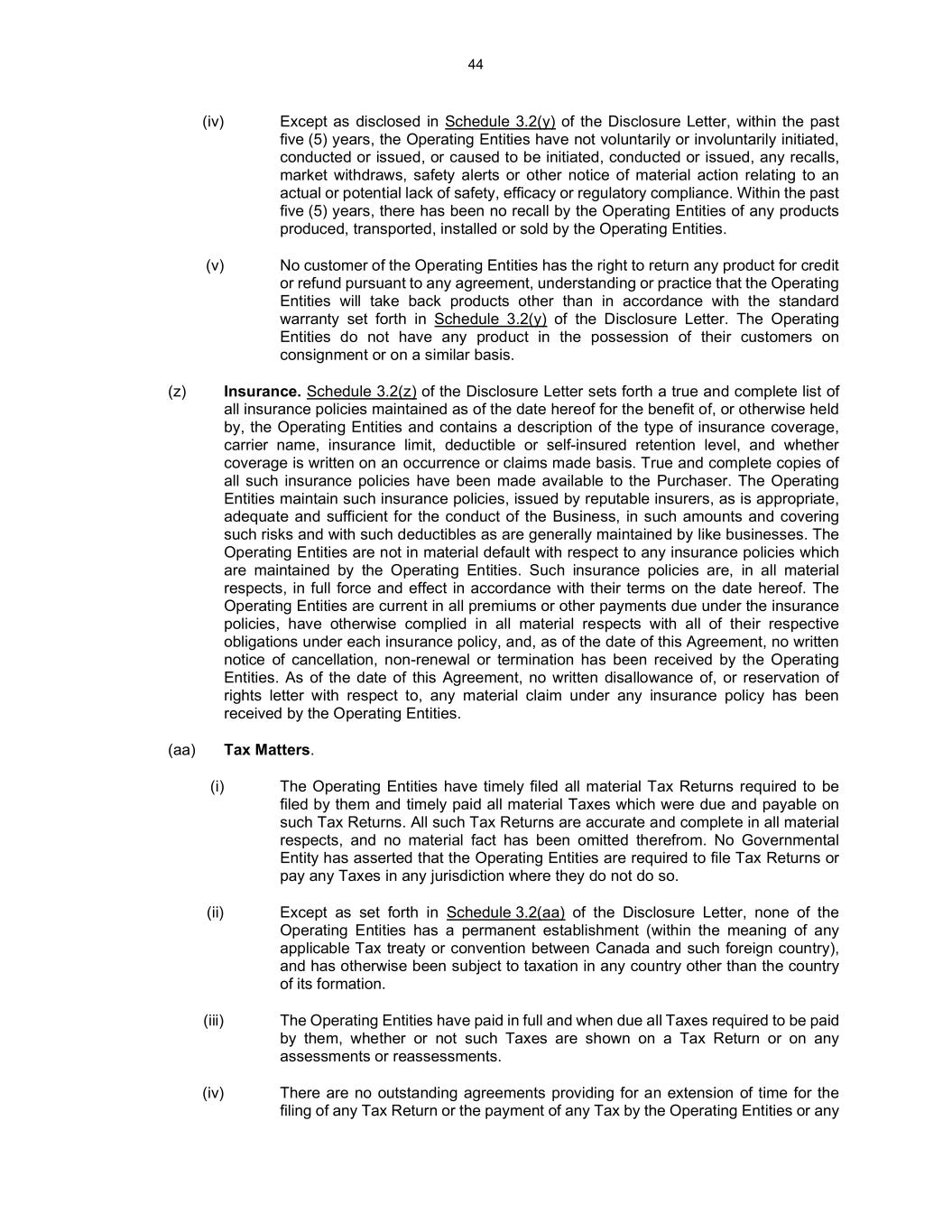 44 (iv) Except as disclosed in Schedule 3.2(y) of the Disclosure Letter, within the past five (5) years, the Operating Entities have not voluntarily or involuntarily initiated, conducted or issued, or caused to be initiated, conducted or issued, any recalls, market withdraws, safety alerts or other notice of material action relating to an actual or potential lack of safety, efficacy or regulatory compliance. Within the past five (5) years, there has been no recall by the Operating Entities of any products produced, transported, installed or sold by the Operating Entities. (v) No customer of the Operating Entities has the right to return any product for credit or refund pursuant to any agreement, understanding or practice that the Operating Entities will take back products other than in accordance with the standard warranty set forth in Schedule 3.2(y) of the Disclosure Letter. The Operating Entities do not have any product in the possession of their customers on consignment or on a similar basis. (z) Insurance. Schedule 3.2(z) of the Disclosure Letter sets forth a true and complete list of all insurance policies maintained as of the date hereof for the benefit of, or otherwise held by, the Operating Entities and contains a description of the type of insurance coverage, carrier name, insurance limit, deductible or self-insured retention level, and whether coverage is written on an occurrence or claims made basis. True and complete copies of all such insurance policies have been made available to the Purchaser. The Operating Entities maintain such insurance policies, issued by reputable insurers, as is appropriate, adequate and sufficient for the conduct of the Business, in such amounts and covering such risks and with such deductibles as are generally maintained by like businesses. The Operating Entities are not in material default with respect to any insurance policies which are maintained by the Operating Entities. Such insurance policies are, in all material respects, in full force and effect in accordance with their terms on the date hereof. The Operating Entities are current in all premiums or other payments due under the insurance policies, have otherwise complied in all material respects with all of their respective obligations under each insurance policy, and, as of the date of this Agreement, no written notice of cancellation, non-renewal or termination has been received by the Operating Entities. As of the date of this Agreement, no written disallowance of, or reservation of rights letter with respect to, any material claim under any insurance policy has been received by the Operating Entities. (aa) Tax Matters. (i) The Operating Entities have timely filed all material Tax Returns required to be filed by them and timely paid all material Taxes which were due and payable on such Tax Returns. All such Tax Returns are accurate and complete in all material respects, and no material fact has been omitted therefrom. No Governmental Entity has asserted that the Operating Entities are required to file Tax Returns or pay any Taxes in any jurisdiction where they do not do so. (ii) Except as set forth in Schedule 3.2(aa) of the Disclosure Letter, none of the Operating Entities has a permanent establishment (within the meaning of any applicable Tax treaty or convention between Canada and such foreign country), and has otherwise been subject to taxation in any country other than the country of its formation. (iii) The Operating Entities have paid in full and when due all Taxes required to be paid by them, whether or not such Taxes are shown on a Tax Return or on any assessments or reassessments. (iv) There are no outstanding agreements providing for an extension of time for the filing of any Tax Return or the payment of any Tax by the Operating Entities or any