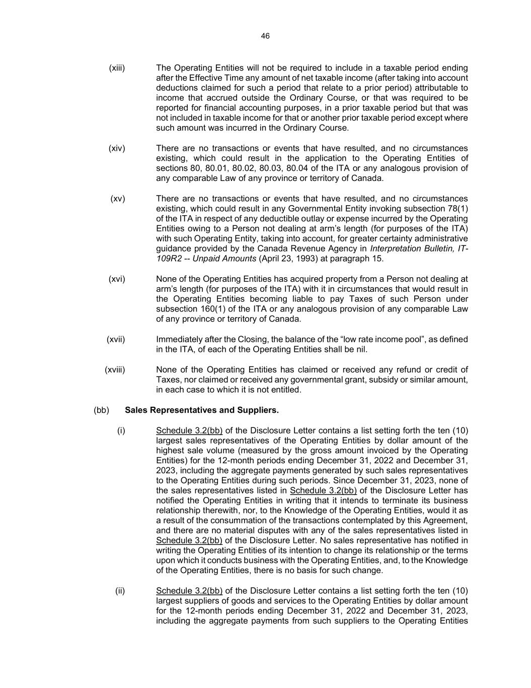 46 (xiii) The Operating Entities will not be required to include in a taxable period ending after the Effective Time any amount of net taxable income (after taking into account deductions claimed for such a period that relate to a prior period) attributable to income that accrued outside the Ordinary Course, or that was required to be reported for financial accounting purposes, in a prior taxable period but that was not included in taxable income for that or another prior taxable period except where such amount was incurred in the Ordinary Course. (xiv) There are no transactions or events that have resulted, and no circumstances existing, which could result in the application to the Operating Entities of sections 80, 80.01, 80.02, 80.03, 80.04 of the ITA or any analogous provision of any comparable Law of any province or territory of Canada. (xv) There are no transactions or events that have resulted, and no circumstances existing, which could result in any Governmental Entity invoking subsection 78(1) of the ITA in respect of any deductible outlay or expense incurred by the Operating Entities owing to a Person not dealing at arm’s length (for purposes of the ITA) with such Operating Entity, taking into account, for greater certainty administrative guidance provided by the Canada Revenue Agency in Interpretation Bulletin, IT- 109R2 -- Unpaid Amounts (April 23, 1993) at paragraph 15. (xvi) None of the Operating Entities has acquired property from a Person not dealing at arm’s length (for purposes of the ITA) with it in circumstances that would result in the Operating Entities becoming liable to pay Taxes of such Person under subsection 160(1) of the ITA or any analogous provision of any comparable Law of any province or territory of Canada. (xvii) Immediately after the Closing, the balance of the “low rate income pool”, as defined in the ITA, of each of the Operating Entities shall be nil. (xviii) None of the Operating Entities has claimed or received any refund or credit of Taxes, nor claimed or received any governmental grant, subsidy or similar amount, in each case to which it is not entitled. (bb) Sales Representatives and Suppliers. (i) Schedule 3.2(bb) of the Disclosure Letter contains a list setting forth the ten (10) largest sales representatives of the Operating Entities by dollar amount of the highest sale volume (measured by the gross amount invoiced by the Operating Entities) for the 12-month periods ending December 31, 2022 and December 31, 2023, including the aggregate payments generated by such sales representatives to the Operating Entities during such periods. Since December 31, 2023, none of the sales representatives listed in Schedule 3.2(bb) of the Disclosure Letter has notified the Operating Entities in writing that it intends to terminate its business relationship therewith, nor, to the Knowledge of the Operating Entities, would it as a result of the consummation of the transactions contemplated by this Agreement, and there are no material disputes with any of the sales representatives listed in Schedule 3.2(bb) of the Disclosure Letter. No sales representative has notified in writing the Operating Entities of its intention to change its relationship or the terms upon which it conducts business with the Operating Entities, and, to the Knowledge of the Operating Entities, there is no basis for such change. (ii) Schedule 3.2(bb) of the Disclosure Letter contains a list setting forth the ten (10) largest suppliers of goods and services to the Operating Entities by dollar amount for the 12-month periods ending December 31, 2022 and December 31, 2023, including the aggregate payments from such suppliers to the Operating Entities