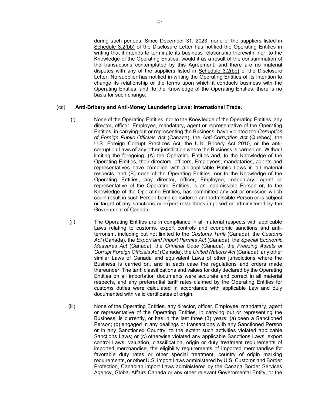 47 during such periods. Since December 31, 2023, none of the suppliers listed in Schedule 3.2(bb) of the Disclosure Letter has notified the Operating Entities in writing that it intends to terminate its business relationship therewith, nor, to the Knowledge of the Operating Entities, would it as a result of the consummation of the transactions contemplated by this Agreement, and there are no material disputes with any of the suppliers listed in Schedule 3.2(bb) of the Disclosure Letter. No supplier has notified in writing the Operating Entities of its intention to change its relationship or the terms upon which it conducts business with the Operating Entities, and, to the Knowledge of the Operating Entities, there is no basis for such change. (cc) Anti-Bribery and Anti-Money Laundering Laws; International Trade. (i) None of the Operating Entities, nor to the Knowledge of the Operating Entities, any director, officer, Employee, mandatary, agent or representative of the Operating Entities, in carrying out or representing the Business, have violated the Corruption of Foreign Public Officials Act (Canada), the Anti-Corruption Act (Québec), the U.S. Foreign Corrupt Practices Act, the U.K. Bribery Act 2010, or the anti- corruption Laws of any other jurisdiction where the Business is carried on. Without limiting the foregoing, (A) the Operating Entities and, to the Knowledge of the Operating Entities, their directors, officers, Employees, mandataries, agents and representatives have complied with all applicable Public Laws in all material respects, and (B) none of the Operating Entities, nor to the Knowledge of the Operating Entities, any director, officer, Employee, mandatary, agent or representative of the Operating Entities, is an Inadmissible Person or, to the Knowledge of the Operating Entities, has committed any act or omission which could result in such Person being considered an Inadmissible Person or is subject or target of any sanctions or export restrictions imposed or administered by the Government of Canada. (ii) The Operating Entities are in compliance in all material respects with applicable Laws relating to customs, export controls and economic sanctions and anti- terrorism, including but not limited to the Customs Tariff (Canada), the Customs Act (Canada), the Export and Import Permits Act (Canada), the Special Economic Measures Act (Canada), the Criminal Code (Canada), the Freezing Assets of Corrupt Foreign Officials Act (Canada), the United Nations Act (Canada), any other similar Laws of Canada and equivalent Laws of other jurisdictions where the Business is carried on, and in each case the regulations and orders made thereunder. The tariff classifications and values for duty declared by the Operating Entities on all importation documents were accurate and correct in all material respects, and any preferential tariff rates claimed by the Operating Entities for customs duties were calculated in accordance with applicable Law and duly documented with valid certificates of origin. (iii) None of the Operating Entities, any director, officer, Employee, mandatary, agent or representative of the Operating Entities, in carrying out or representing the Business, is currently, or has in the last three (3) years: (a) been a Sanctioned Person; (b) engaged in any dealings or transactions with any Sanctioned Person or in any Sanctioned Country, to the extent such activities violated applicable Sanctions Laws; or (c) otherwise violated any applicable Sanctions Laws, export control Laws, valuation, classification, origin or duty treatment requirements of imported merchandise, the eligibility requirements of imported merchandise for favorable duty rates or other special treatment, country of origin marking requirements, or other U.S. import Laws administered by U.S. Customs and Border Protection, Canadian import Laws administered by the Canada Border Services Agency, Global Affairs Canada or any other relevant Governmental Entity, or the