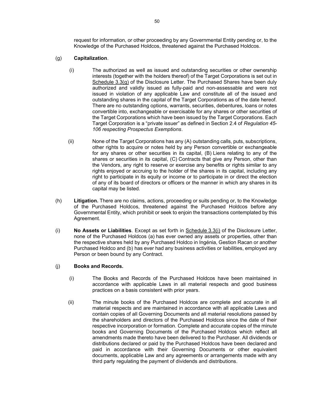 50 request for information, or other proceeding by any Governmental Entity pending or, to the Knowledge of the Purchased Holdcos, threatened against the Purchased Holdcos. (g) Capitalization. (i) The authorized as well as issued and outstanding securities or other ownership interests (together with the holders thereof) of the Target Corporations is set out in Schedule 3.3(g) of the Disclosure Letter. The Purchased Shares have been duly authorized and validly issued as fully-paid and non-assessable and were not issued in violation of any applicable Law and constitute all of the issued and outstanding shares in the capital of the Target Corporations as of the date hereof. There are no outstanding options, warrants, securities, debentures, loans or notes convertible into, exchangeable or exercisable for any shares or other securities of the Target Corporations which have been issued by the Target Corporations. Each Target Corporation is a “private issuer” as defined in Section 2.4 of Regulation 45- 106 respecting Prospectus Exemptions. (ii) None of the Target Corporations has any (A) outstanding calls, puts, subscriptions, other rights to acquire or notes held by any Person convertible or exchangeable for any shares or other securities in its capital, (B) Liens relating to any of the shares or securities in its capital, (C) Contracts that give any Person, other than the Vendors, any right to reserve or exercise any benefits or rights similar to any rights enjoyed or accruing to the holder of the shares in its capital, including any right to participate in its equity or income or to participate in or direct the election of any of its board of directors or officers or the manner in which any shares in its capital may be listed. (h) Litigation. There are no claims, actions, proceeding or suits pending or, to the Knowledge of the Purchased Holdcos, threatened against the Purchased Holdcos before any Governmental Entity, which prohibit or seek to enjoin the transactions contemplated by this Agreement. (i) No Assets or Liabilities. Except as set forth in Schedule 3.3(i) of the Disclosure Letter, none of the Purchased Holdcos (a) has ever owned any assets or properties, other than the respective shares held by any Purchased Holdco in Ingénia, Gestion Racan or another Purchased Holdco and (b) has ever had any business activities or liabilities, employed any Person or been bound by any Contract. (j) Books and Records. (i) The Books and Records of the Purchased Holdcos have been maintained in accordance with applicable Laws in all material respects and good business practices on a basis consistent with prior years. (ii) The minute books of the Purchased Holdcos are complete and accurate in all material respects and are maintained in accordance with all applicable Laws and contain copies of all Governing Documents and all material resolutions passed by the shareholders and directors of the Purchased Holdcos since the date of their respective incorporation or formation. Complete and accurate copies of the minute books and Governing Documents of the Purchased Holdcos which reflect all amendments made thereto have been delivered to the Purchaser. All dividends or distributions declared or paid by the Purchased Holdcos have been declared and paid in accordance with their Governing Documents or other equivalent documents, applicable Law and any agreements or arrangements made with any third party regulating the payment of dividends and distributions.