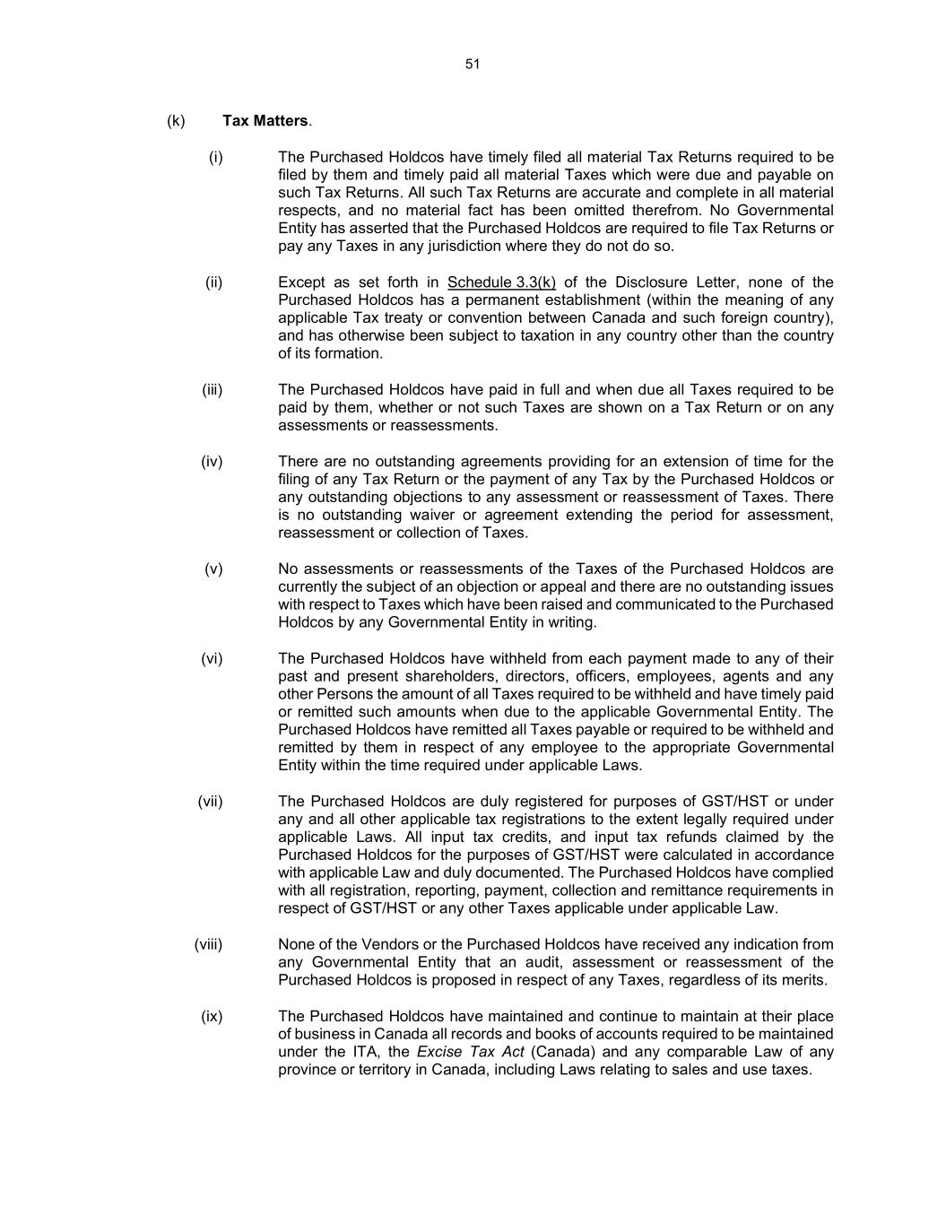 51 (k) Tax Matters. (i) The Purchased Holdcos have timely filed all material Tax Returns required to be filed by them and timely paid all material Taxes which were due and payable on such Tax Returns. All such Tax Returns are accurate and complete in all material respects, and no material fact has been omitted therefrom. No Governmental Entity has asserted that the Purchased Holdcos are required to file Tax Returns or pay any Taxes in any jurisdiction where they do not do so. (ii) Except as set forth in Schedule 3.3(k) of the Disclosure Letter, none of the Purchased Holdcos has a permanent establishment (within the meaning of any applicable Tax treaty or convention between Canada and such foreign country), and has otherwise been subject to taxation in any country other than the country of its formation. (iii) The Purchased Holdcos have paid in full and when due all Taxes required to be paid by them, whether or not such Taxes are shown on a Tax Return or on any assessments or reassessments. (iv) There are no outstanding agreements providing for an extension of time for the filing of any Tax Return or the payment of any Tax by the Purchased Holdcos or any outstanding objections to any assessment or reassessment of Taxes. There is no outstanding waiver or agreement extending the period for assessment, reassessment or collection of Taxes. (v) No assessments or reassessments of the Taxes of the Purchased Holdcos are currently the subject of an objection or appeal and there are no outstanding issues with respect to Taxes which have been raised and communicated to the Purchased Holdcos by any Governmental Entity in writing. (vi) The Purchased Holdcos have withheld from each payment made to any of their past and present shareholders, directors, officers, employees, agents and any other Persons the amount of all Taxes required to be withheld and have timely paid or remitted such amounts when due to the applicable Governmental Entity. The Purchased Holdcos have remitted all Taxes payable or required to be withheld and remitted by them in respect of any employee to the appropriate Governmental Entity within the time required under applicable Laws. (vii) The Purchased Holdcos are duly registered for purposes of GST/HST or under any and all other applicable tax registrations to the extent legally required under applicable Laws. All input tax credits, and input tax refunds claimed by the Purchased Holdcos for the purposes of GST/HST were calculated in accordance with applicable Law and duly documented. The Purchased Holdcos have complied with all registration, reporting, payment, collection and remittance requirements in respect of GST/HST or any other Taxes applicable under applicable Law. (viii) None of the Vendors or the Purchased Holdcos have received any indication from any Governmental Entity that an audit, assessment or reassessment of the Purchased Holdcos is proposed in respect of any Taxes, regardless of its merits. (ix) The Purchased Holdcos have maintained and continue to maintain at their place of business in Canada all records and books of accounts required to be maintained under the ITA, the Excise Tax Act (Canada) and any comparable Law of any province or territory in Canada, including Laws relating to sales and use taxes.