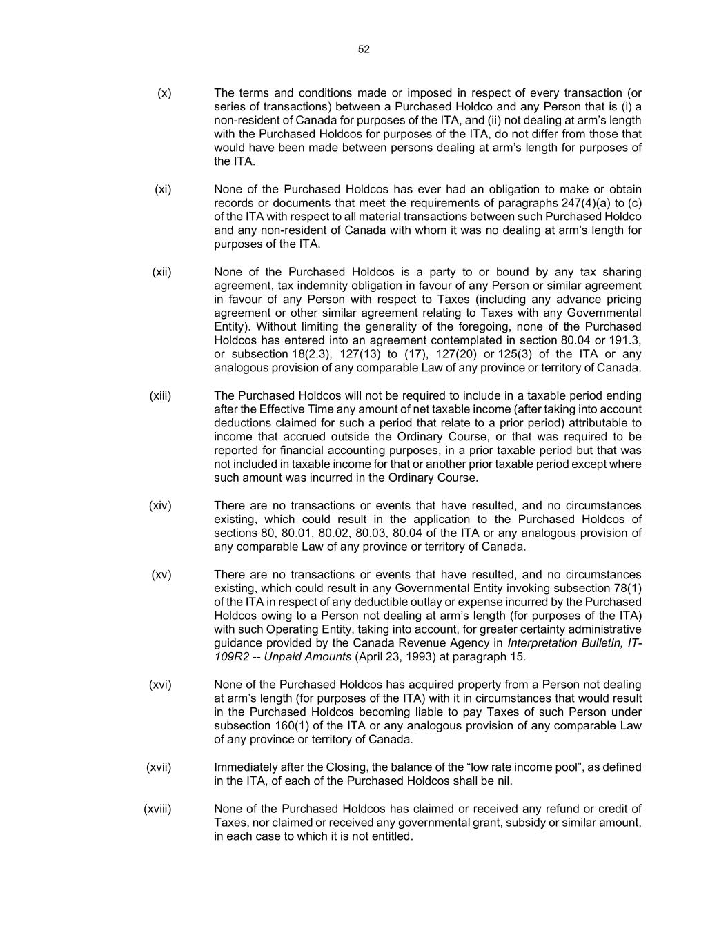 52 (x) The terms and conditions made or imposed in respect of every transaction (or series of transactions) between a Purchased Holdco and any Person that is (i) a non-resident of Canada for purposes of the ITA, and (ii) not dealing at arm’s length with the Purchased Holdcos for purposes of the ITA, do not differ from those that would have been made between persons dealing at arm’s length for purposes of the ITA. (xi) None of the Purchased Holdcos has ever had an obligation to make or obtain records or documents that meet the requirements of paragraphs 247(4)(a) to (c) of the ITA with respect to all material transactions between such Purchased Holdco and any non-resident of Canada with whom it was no dealing at arm’s length for purposes of the ITA. (xii) None of the Purchased Holdcos is a party to or bound by any tax sharing agreement, tax indemnity obligation in favour of any Person or similar agreement in favour of any Person with respect to Taxes (including any advance pricing agreement or other similar agreement relating to Taxes with any Governmental Entity). Without limiting the generality of the foregoing, none of the Purchased Holdcos has entered into an agreement contemplated in section 80.04 or 191.3, or subsection 18(2.3), 127(13) to (17), 127(20) or 125(3) of the ITA or any analogous provision of any comparable Law of any province or territory of Canada. (xiii) The Purchased Holdcos will not be required to include in a taxable period ending after the Effective Time any amount of net taxable income (after taking into account deductions claimed for such a period that relate to a prior period) attributable to income that accrued outside the Ordinary Course, or that was required to be reported for financial accounting purposes, in a prior taxable period but that was not included in taxable income for that or another prior taxable period except where such amount was incurred in the Ordinary Course. (xiv) There are no transactions or events that have resulted, and no circumstances existing, which could result in the application to the Purchased Holdcos of sections 80, 80.01, 80.02, 80.03, 80.04 of the ITA or any analogous provision of any comparable Law of any province or territory of Canada. (xv) There are no transactions or events that have resulted, and no circumstances existing, which could result in any Governmental Entity invoking subsection 78(1) of the ITA in respect of any deductible outlay or expense incurred by the Purchased Holdcos owing to a Person not dealing at arm’s length (for purposes of the ITA) with such Operating Entity, taking into account, for greater certainty administrative guidance provided by the Canada Revenue Agency in Interpretation Bulletin, IT- 109R2 -- Unpaid Amounts (April 23, 1993) at paragraph 15. (xvi) None of the Purchased Holdcos has acquired property from a Person not dealing at arm’s length (for purposes of the ITA) with it in circumstances that would result in the Purchased Holdcos becoming liable to pay Taxes of such Person under subsection 160(1) of the ITA or any analogous provision of any comparable Law of any province or territory of Canada. (xvii) Immediately after the Closing, the balance of the “low rate income pool”, as defined in the ITA, of each of the Purchased Holdcos shall be nil. (xviii) None of the Purchased Holdcos has claimed or received any refund or credit of Taxes, nor claimed or received any governmental grant, subsidy or similar amount, in each case to which it is not entitled.