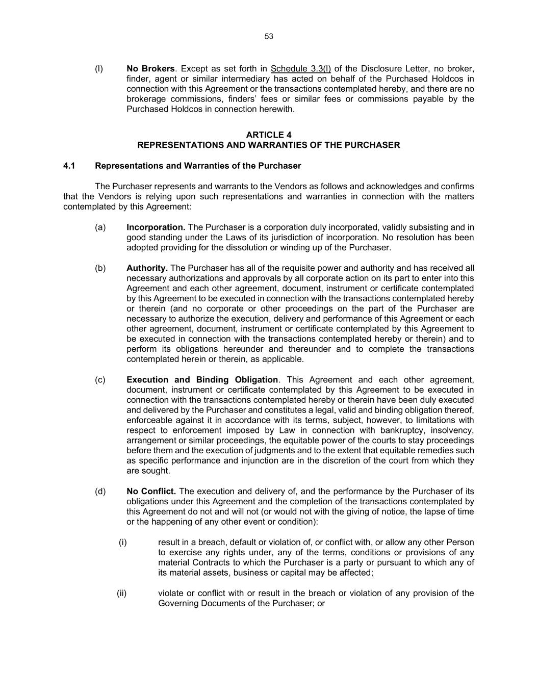 53 (l) No Brokers. Except as set forth in Schedule 3.3(l) of the Disclosure Letter, no broker, finder, agent or similar intermediary has acted on behalf of the Purchased Holdcos in connection with this Agreement or the transactions contemplated hereby, and there are no brokerage commissions, finders’ fees or similar fees or commissions payable by the Purchased Holdcos in connection herewith. ARTICLE 4 REPRESENTATIONS AND WARRANTIES OF THE PURCHASER 4.1 Representations and Warranties of the Purchaser The Purchaser represents and warrants to the Vendors as follows and acknowledges and confirms that the Vendors is relying upon such representations and warranties in connection with the matters contemplated by this Agreement: (a) Incorporation. The Purchaser is a corporation duly incorporated, validly subsisting and in good standing under the Laws of its jurisdiction of incorporation. No resolution has been adopted providing for the dissolution or winding up of the Purchaser. (b) Authority. The Purchaser has all of the requisite power and authority and has received all necessary authorizations and approvals by all corporate action on its part to enter into this Agreement and each other agreement, document, instrument or certificate contemplated by this Agreement to be executed in connection with the transactions contemplated hereby or therein (and no corporate or other proceedings on the part of the Purchaser are necessary to authorize the execution, delivery and performance of this Agreement or each other agreement, document, instrument or certificate contemplated by this Agreement to be executed in connection with the transactions contemplated hereby or therein) and to perform its obligations hereunder and thereunder and to complete the transactions contemplated herein or therein, as applicable. (c) Execution and Binding Obligation. This Agreement and each other agreement, document, instrument or certificate contemplated by this Agreement to be executed in connection with the transactions contemplated hereby or therein have been duly executed and delivered by the Purchaser and constitutes a legal, valid and binding obligation thereof, enforceable against it in accordance with its terms, subject, however, to limitations with respect to enforcement imposed by Law in connection with bankruptcy, insolvency, arrangement or similar proceedings, the equitable power of the courts to stay proceedings before them and the execution of judgments and to the extent that equitable remedies such as specific performance and injunction are in the discretion of the court from which they are sought. (d) No Conflict. The execution and delivery of, and the performance by the Purchaser of its obligations under this Agreement and the completion of the transactions contemplated by this Agreement do not and will not (or would not with the giving of notice, the lapse of time or the happening of any other event or condition): (i) result in a breach, default or violation of, or conflict with, or allow any other Person to exercise any rights under, any of the terms, conditions or provisions of any material Contracts to which the Purchaser is a party or pursuant to which any of its material assets, business or capital may be affected; (ii) violate or conflict with or result in the breach or violation of any provision of the Governing Documents of the Purchaser; or