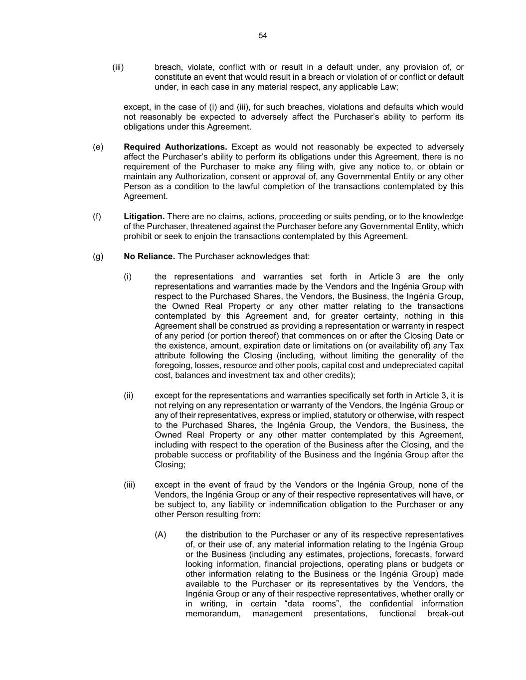54 (iii) breach, violate, conflict with or result in a default under, any provision of, or constitute an event that would result in a breach or violation of or conflict or default under, in each case in any material respect, any applicable Law; except, in the case of (i) and (iii), for such breaches, violations and defaults which would not reasonably be expected to adversely affect the Purchaser’s ability to perform its obligations under this Agreement. (e) Required Authorizations. Except as would not reasonably be expected to adversely affect the Purchaser’s ability to perform its obligations under this Agreement, there is no requirement of the Purchaser to make any filing with, give any notice to, or obtain or maintain any Authorization, consent or approval of, any Governmental Entity or any other Person as a condition to the lawful completion of the transactions contemplated by this Agreement. (f) Litigation. There are no claims, actions, proceeding or suits pending, or to the knowledge of the Purchaser, threatened against the Purchaser before any Governmental Entity, which prohibit or seek to enjoin the transactions contemplated by this Agreement. (g) No Reliance. The Purchaser acknowledges that: (i) the representations and warranties set forth in Article 3 are the only representations and warranties made by the Vendors and the Ingénia Group with respect to the Purchased Shares, the Vendors, the Business, the Ingénia Group, the Owned Real Property or any other matter relating to the transactions contemplated by this Agreement and, for greater certainty, nothing in this Agreement shall be construed as providing a representation or warranty in respect of any period (or portion thereof) that commences on or after the Closing Date or the existence, amount, expiration date or limitations on (or availability of) any Tax attribute following the Closing (including, without limiting the generality of the foregoing, losses, resource and other pools, capital cost and undepreciated capital cost, balances and investment tax and other credits); (ii) except for the representations and warranties specifically set forth in Article 3, it is not relying on any representation or warranty of the Vendors, the Ingénia Group or any of their representatives, express or implied, statutory or otherwise, with respect to the Purchased Shares, the Ingénia Group, the Vendors, the Business, the Owned Real Property or any other matter contemplated by this Agreement, including with respect to the operation of the Business after the Closing, and the probable success or profitability of the Business and the Ingénia Group after the Closing; (iii) except in the event of fraud by the Vendors or the Ingénia Group, none of the Vendors, the Ingénia Group or any of their respective representatives will have, or be subject to, any liability or indemnification obligation to the Purchaser or any other Person resulting from: (A) the distribution to the Purchaser or any of its respective representatives of, or their use of, any material information relating to the Ingénia Group or the Business (including any estimates, projections, forecasts, forward looking information, financial projections, operating plans or budgets or other information relating to the Business or the Ingénia Group) made available to the Purchaser or its representatives by the Vendors, the Ingénia Group or any of their respective representatives, whether orally or in writing, in certain “data rooms”, the confidential information memorandum, management presentations, functional break-out
