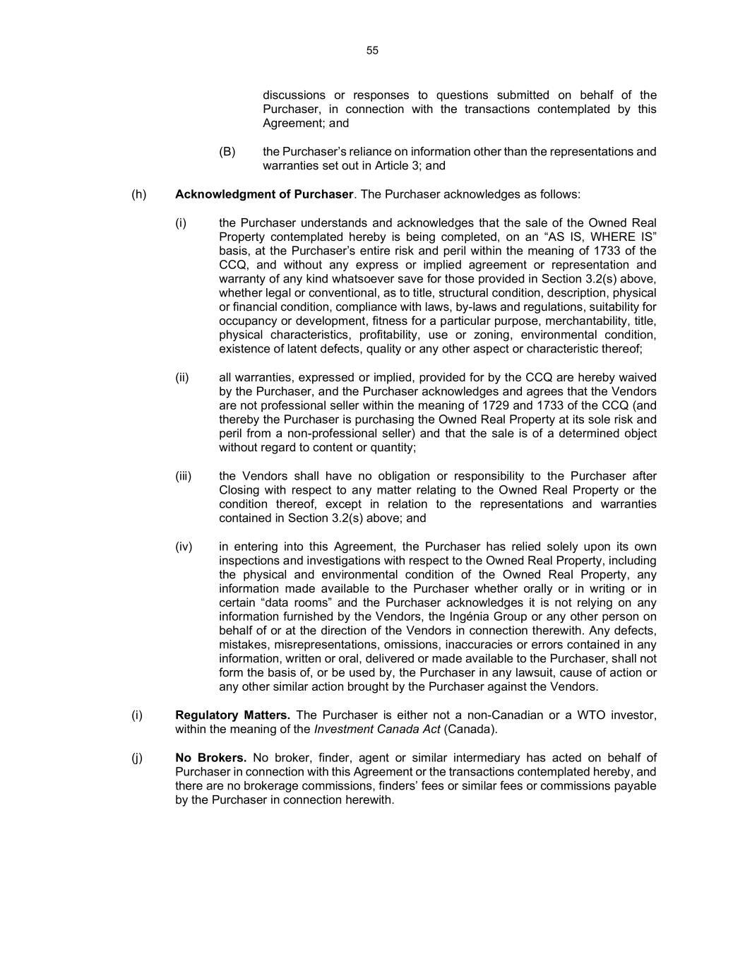 55 discussions or responses to questions submitted on behalf of the Purchaser, in connection with the transactions contemplated by this Agreement; and (B) the Purchaser’s reliance on information other than the representations and warranties set out in Article 3; and (h) Acknowledgment of Purchaser. The Purchaser acknowledges as follows: (i) the Purchaser understands and acknowledges that the sale of the Owned Real Property contemplated hereby is being completed, on an “AS IS, WHERE IS” basis, at the Purchaser’s entire risk and peril within the meaning of 1733 of the CCQ, and without any express or implied agreement or representation and warranty of any kind whatsoever save for those provided in Section 3.2(s) above, whether legal or conventional, as to title, structural condition, description, physical or financial condition, compliance with laws, by-laws and regulations, suitability for occupancy or development, fitness for a particular purpose, merchantability, title, physical characteristics, profitability, use or zoning, environmental condition, existence of latent defects, quality or any other aspect or characteristic thereof; (ii) all warranties, expressed or implied, provided for by the CCQ are hereby waived by the Purchaser, and the Purchaser acknowledges and agrees that the Vendors are not professional seller within the meaning of 1729 and 1733 of the CCQ (and thereby the Purchaser is purchasing the Owned Real Property at its sole risk and peril from a non-professional seller) and that the sale is of a determined object without regard to content or quantity; (iii) the Vendors shall have no obligation or responsibility to the Purchaser after Closing with respect to any matter relating to the Owned Real Property or the condition thereof, except in relation to the representations and warranties contained in Section 3.2(s) above; and (iv) in entering into this Agreement, the Purchaser has relied solely upon its own inspections and investigations with respect to the Owned Real Property, including the physical and environmental condition of the Owned Real Property, any information made available to the Purchaser whether orally or in writing or in certain “data rooms” and the Purchaser acknowledges it is not relying on any information furnished by the Vendors, the Ingénia Group or any other person on behalf of or at the direction of the Vendors in connection therewith. Any defects, mistakes, misrepresentations, omissions, inaccuracies or errors contained in any information, written or oral, delivered or made available to the Purchaser, shall not form the basis of, or be used by, the Purchaser in any lawsuit, cause of action or any other similar action brought by the Purchaser against the Vendors. (i) Regulatory Matters. The Purchaser is either not a non-Canadian or a WTO investor, within the meaning of the Investment Canada Act (Canada). (j) No Brokers. No broker, finder, agent or similar intermediary has acted on behalf of Purchaser in connection with this Agreement or the transactions contemplated hereby, and there are no brokerage commissions, finders’ fees or similar fees or commissions payable by the Purchaser in connection herewith.