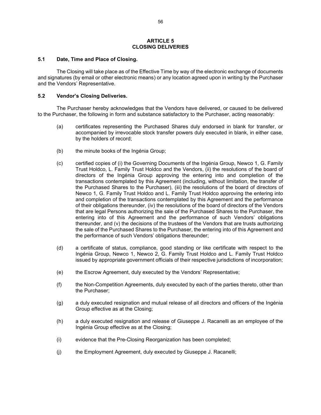 56 ARTICLE 5 CLOSING DELIVERIES 5.1 Date, Time and Place of Closing. The Closing will take place as of the Effective Time by way of the electronic exchange of documents and signatures (by email or other electronic means) or any location agreed upon in writing by the Purchaser and the Vendors’ Representative. 5.2 Vendor’s Closing Deliveries. The Purchaser hereby acknowledges that the Vendors have delivered, or caused to be delivered to the Purchaser, the following in form and substance satisfactory to the Purchaser, acting reasonably: (a) certificates representing the Purchased Shares duly endorsed in blank for transfer, or accompanied by irrevocable stock transfer powers duly executed in blank, in either case, by the holders of record; (b) the minute books of the Ingénia Group; (c) certified copies of (i) the Governing Documents of the Ingénia Group, Newco 1, G. Family Trust Holdco, L. Family Trust Holdco and the Vendors, (ii) the resolutions of the board of directors of the Ingénia Group approving the entering into and completion of the transactions contemplated by this Agreement (including, without limitation, the transfer of the Purchased Shares to the Purchaser), (iii) the resolutions of the board of directors of Newco 1, G. Family Trust Holdco and L. Family Trust Holdco approving the entering into and completion of the transactions contemplated by this Agreement and the performance of their obligations thereunder, (iv) the resolutions of the board of directors of the Vendors that are legal Persons authorizing the sale of the Purchased Shares to the Purchaser, the entering into of this Agreement and the performance of such Vendors’ obligations thereunder, and (v) the decisions of the trustees of the Vendors that are trusts authorizing the sale of the Purchased Shares to the Purchaser, the entering into of this Agreement and the performance of such Vendors’ obligations thereunder; (d) a certificate of status, compliance, good standing or like certificate with respect to the Ingénia Group, Newco 1, Newco 2, G. Family Trust Holdco and L. Family Trust Holdco issued by appropriate government officials of their respective jurisdictions of incorporation; (e) the Escrow Agreement, duly executed by the Vendors’ Representative; (f) the Non-Competition Agreements, duly executed by each of the parties thereto, other than the Purchaser; (g) a duly executed resignation and mutual release of all directors and officers of the Ingénia Group effective as at the Closing; (h) a duly executed resignation and release of Giuseppe J. Racanelli as an employee of the Ingénia Group effective as at the Closing; (i) evidence that the Pre-Closing Reorganization has been completed; (j) the Employment Agreement, duly executed by Giuseppe J. Racanelli;
