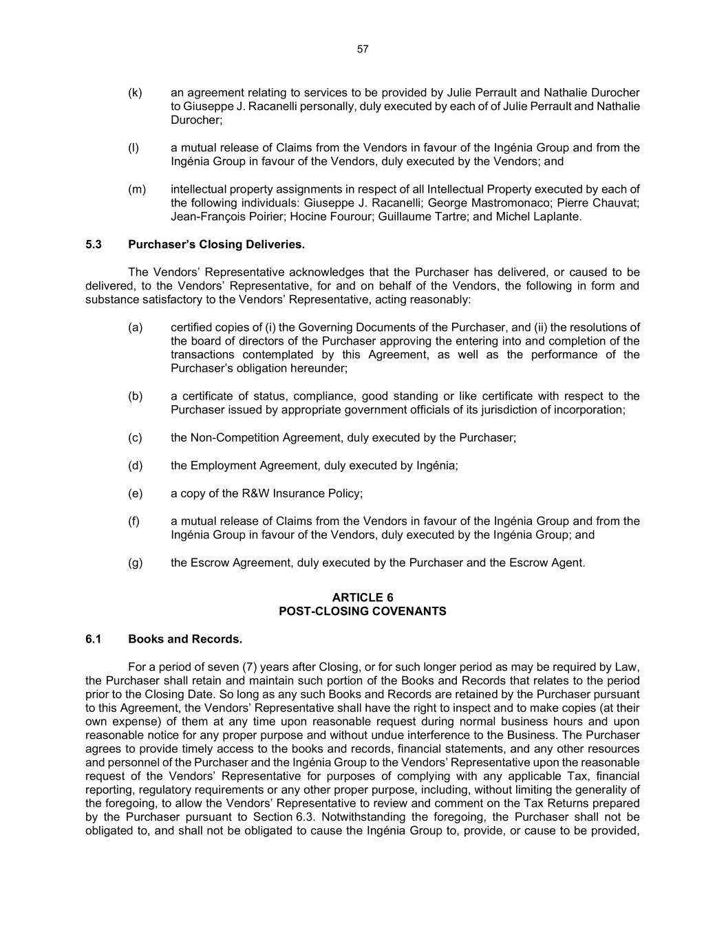 57 (k) an agreement relating to services to be provided by Julie Perrault and Nathalie Durocher to Giuseppe J. Racanelli personally, duly executed by each of of Julie Perrault and Nathalie Durocher; (l) a mutual release of Claims from the Vendors in favour of the Ingénia Group and from the Ingénia Group in favour of the Vendors, duly executed by the Vendors; and (m) intellectual property assignments in respect of all Intellectual Property executed by each of the following individuals: Giuseppe J. Racanelli; George Mastromonaco; Pierre Chauvat; Jean-François Poirier; Hocine Fourour; Guillaume Tartre; and Michel Laplante. 5.3 Purchaser’s Closing Deliveries. The Vendors’ Representative acknowledges that the Purchaser has delivered, or caused to be delivered, to the Vendors’ Representative, for and on behalf of the Vendors, the following in form and substance satisfactory to the Vendors’ Representative, acting reasonably: (a) certified copies of (i) the Governing Documents of the Purchaser, and (ii) the resolutions of the board of directors of the Purchaser approving the entering into and completion of the transactions contemplated by this Agreement, as well as the performance of the Purchaser’s obligation hereunder; (b) a certificate of status, compliance, good standing or like certificate with respect to the Purchaser issued by appropriate government officials of its jurisdiction of incorporation; (c) the Non-Competition Agreement, duly executed by the Purchaser; (d) the Employment Agreement, duly executed by Ingénia; (e) a copy of the R&W Insurance Policy; (f) a mutual release of Claims from the Vendors in favour of the Ingénia Group and from the Ingénia Group in favour of the Vendors, duly executed by the Ingénia Group; and (g) the Escrow Agreement, duly executed by the Purchaser and the Escrow Agent. ARTICLE 6 POST-CLOSING COVENANTS 6.1 Books and Records. For a period of seven (7) years after Closing, or for such longer period as may be required by Law, the Purchaser shall retain and maintain such portion of the Books and Records that relates to the period prior to the Closing Date. So long as any such Books and Records are retained by the Purchaser pursuant to this Agreement, the Vendors’ Representative shall have the right to inspect and to make copies (at their own expense) of them at any time upon reasonable request during normal business hours and upon reasonable notice for any proper purpose and without undue interference to the Business. The Purchaser agrees to provide timely access to the books and records, financial statements, and any other resources and personnel of the Purchaser and the Ingénia Group to the Vendors’ Representative upon the reasonable request of the Vendors’ Representative for purposes of complying with any applicable Tax, financial reporting, regulatory requirements or any other proper purpose, including, without limiting the generality of the foregoing, to allow the Vendors’ Representative to review and comment on the Tax Returns prepared by the Purchaser pursuant to Section 6.3. Notwithstanding the foregoing, the Purchaser shall not be obligated to, and shall not be obligated to cause the Ingénia Group to, provide, or cause to be provided,
